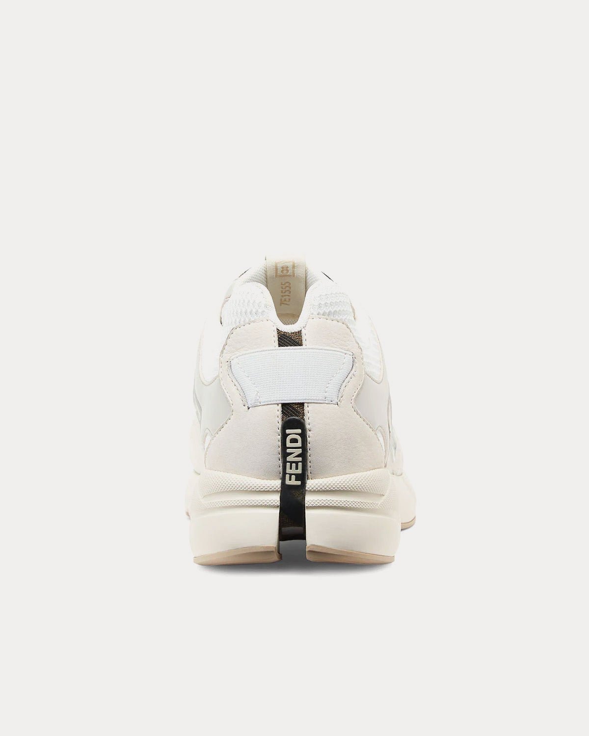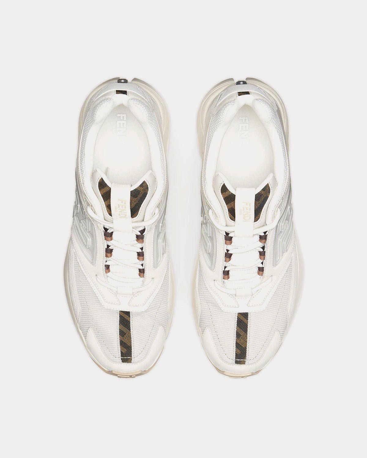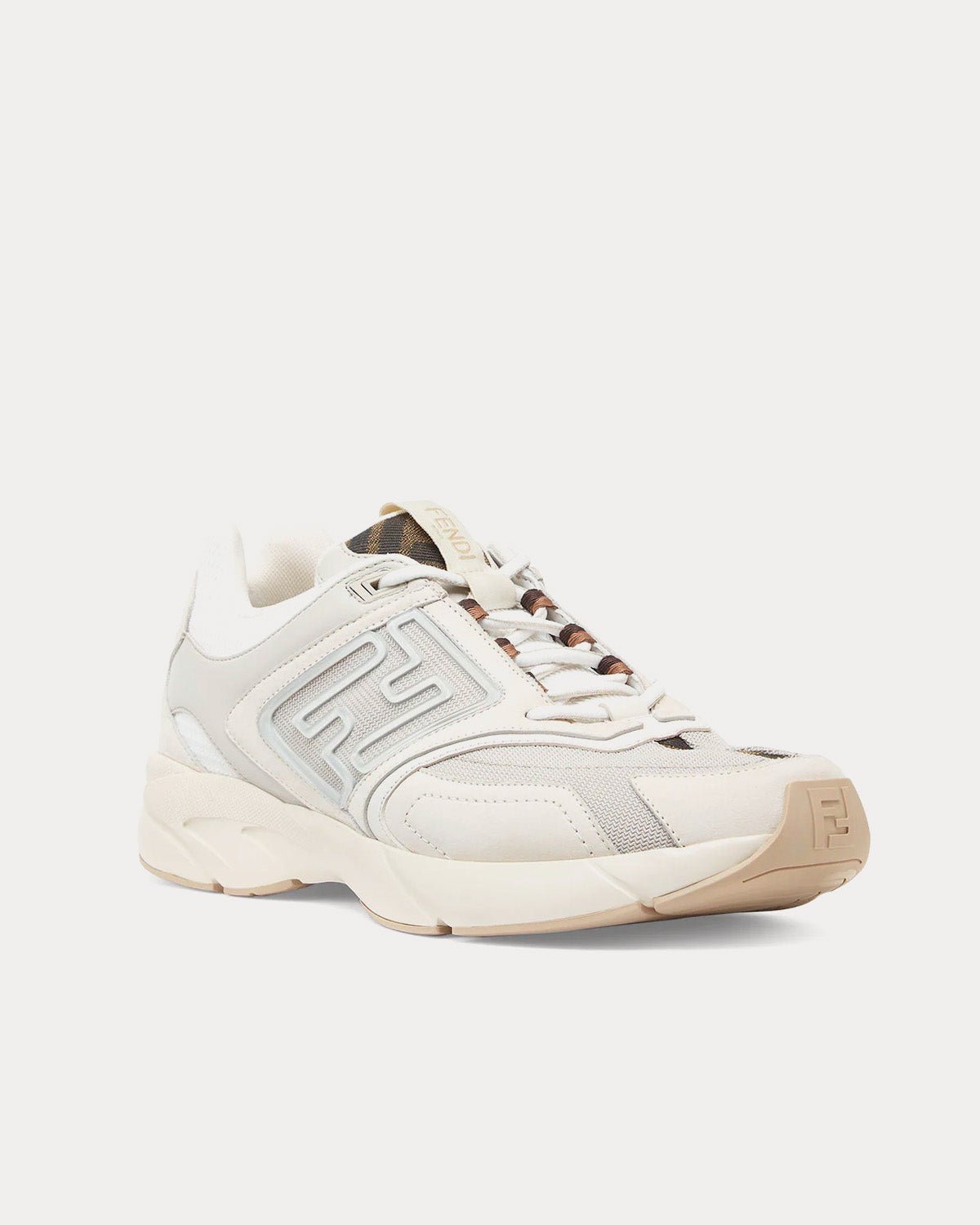 Baskets Fendi Faster en nubuck blanc avec détails en cuir et tissu technique assortis et motif FF embossé sur les côtés. Semelles de course ondulées avec FF sur le bout. Empiècements en tissu FF marron et tabac. Fabriquées en Italie.