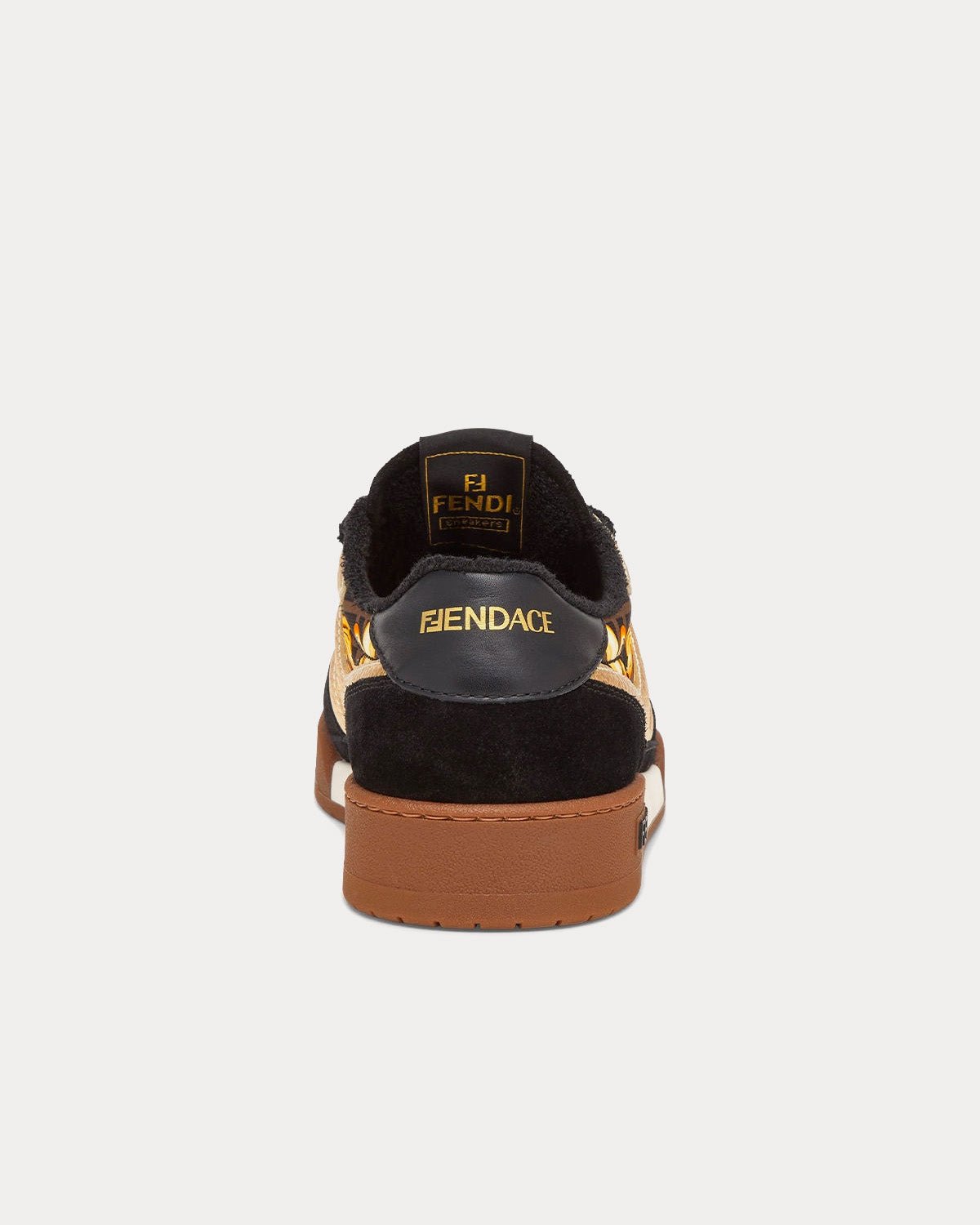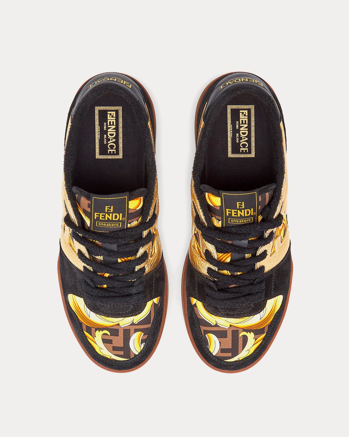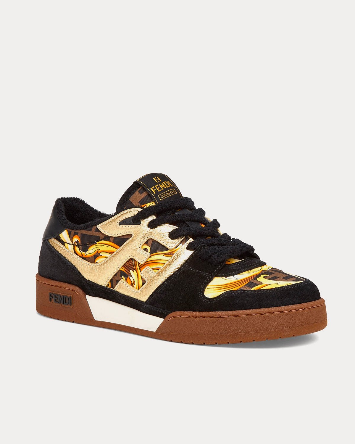 Baskets compactes Fendi Match de Versace by Fendi, ornées d’une étiquette vintage sur la languette. Motif FF cousu sur le côté et inscription Fendi embossée sur la semelle. En daim beige avec détails en cuir métallisé doré. Empiècements en nylon au design graphique associant l’emblématique logo Fendi FF au motif baroque Versace blanc et doré. Col et lacets en éponge blanche. Semelle cupsole en caoutchouc recouverte avec renfort beige. Fabriquées en Italie.