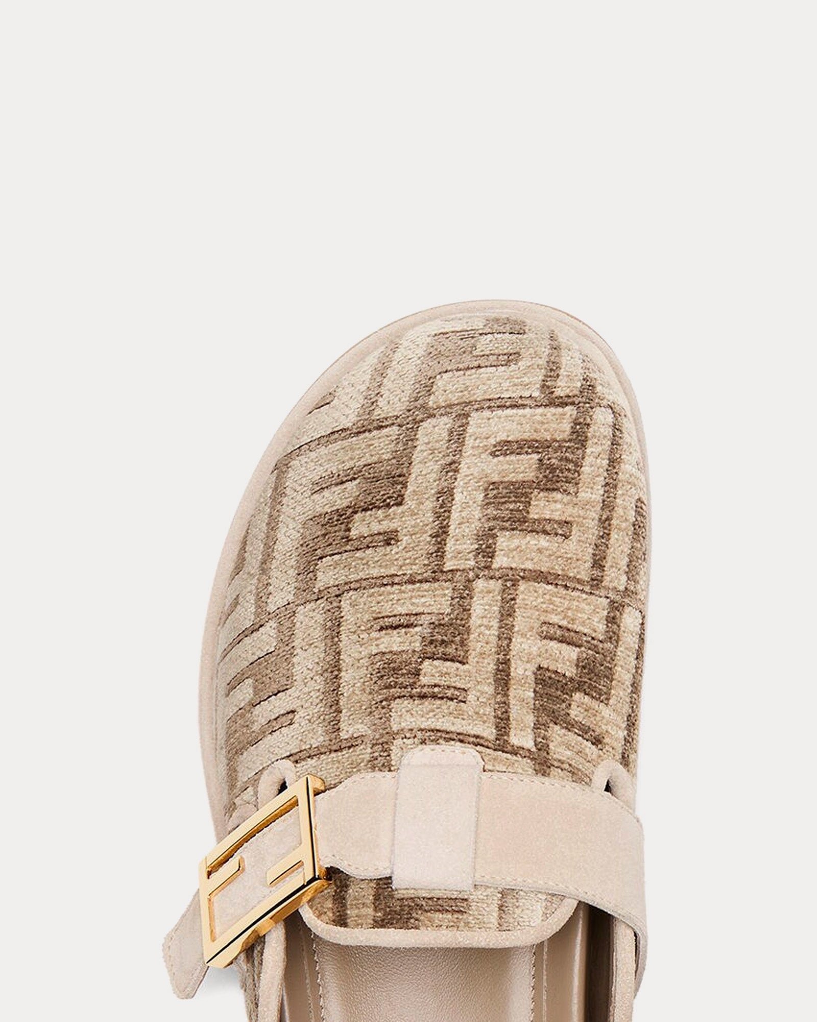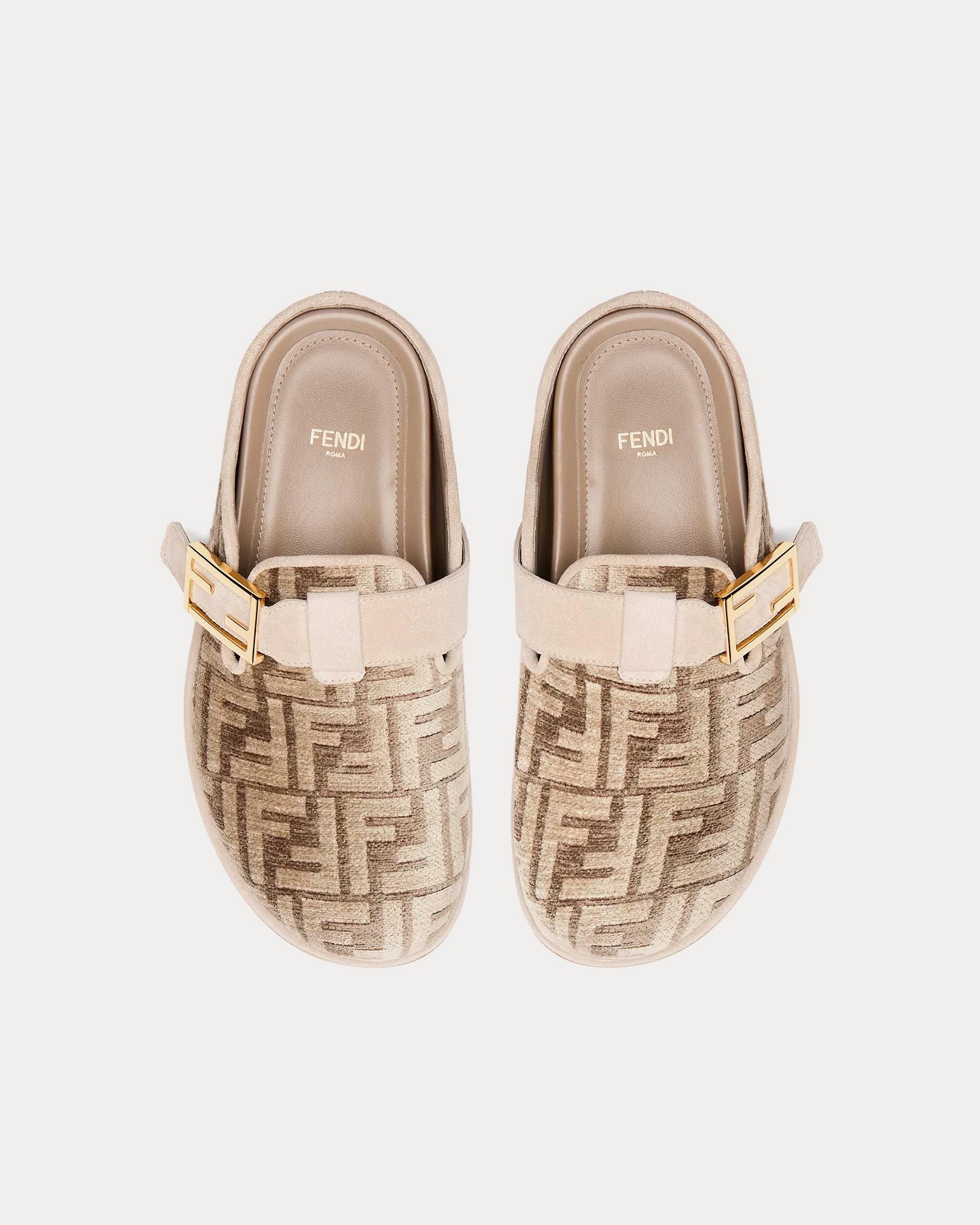 Les sabots pour femme FendiFeel FF Motif en chenille gris tourterelle présentent un bout rond, des détails en daim et des accessoires en métal doré. Fabriqués en Italie.
