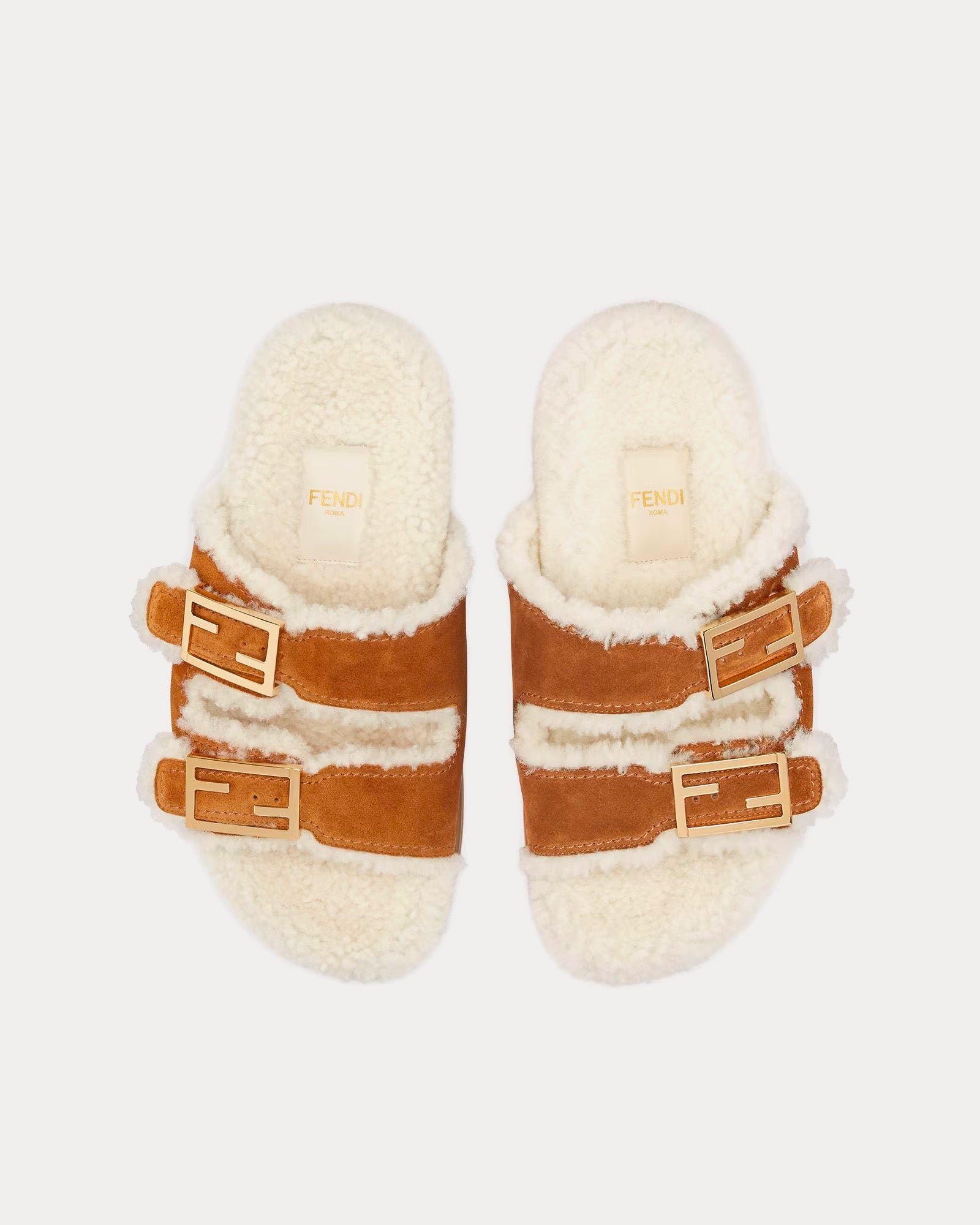 Les mules Fendi Feel pour femme, de couleur beige et blanche, sont confectionnées en peau de mouton et présentent des brides plates à double bande avec des boucles décoratives FF Baguette, des détails en daim et des accessoires en métal doré. Fabriquées en Italie.