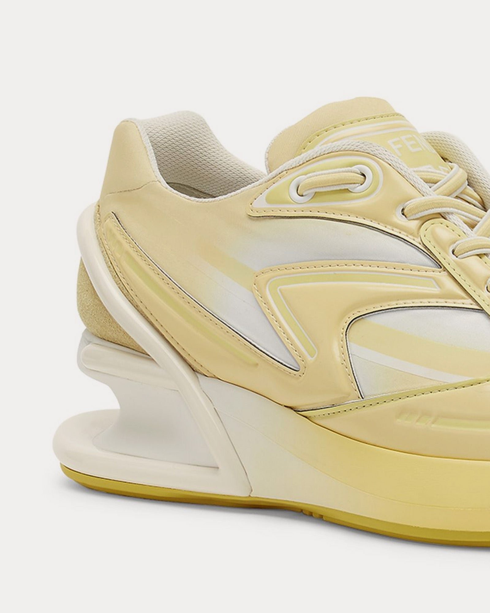 Les baskets basses Fendi First 1 pour femme de couleur jaune sont confectionnées en tissu technique et présentent des semelles ondulées avec un détail sculpté en forme de F diagonal, un insert Framilon et une sérigraphie Fendi personnalisée sur la languette et le côté. Fabriquées en Italie.