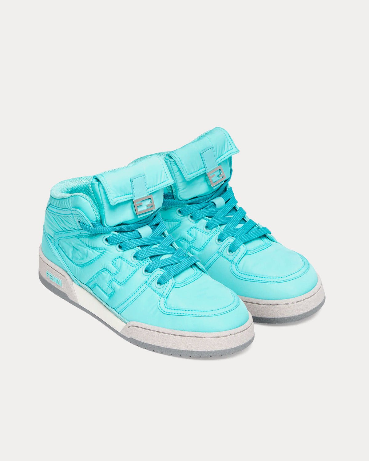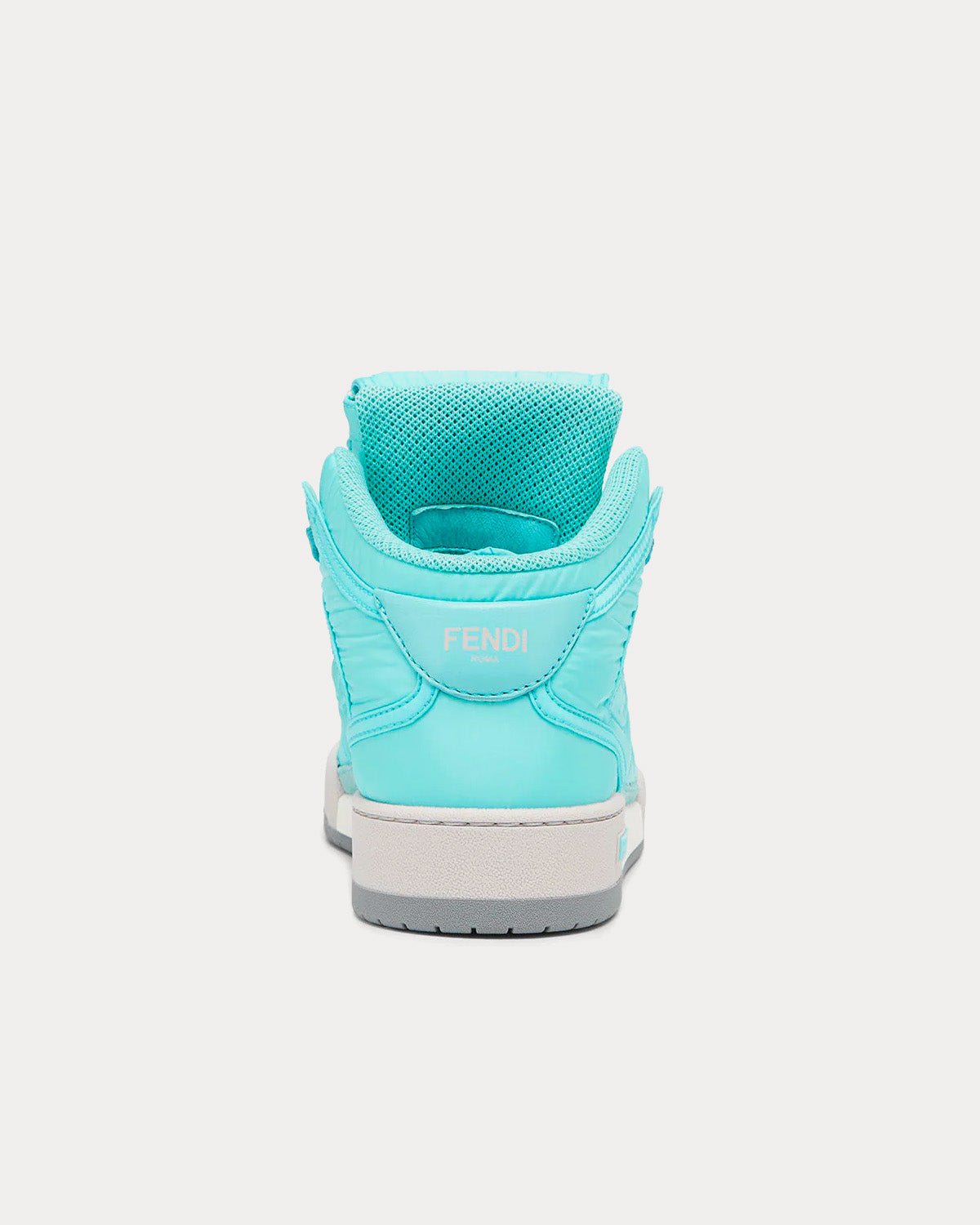 Baskets montantes à lacets Fendi Match en édition spéciale pour célébrer le 25e anniversaire de la Baguette, avec poche Baguette sur la languette. En nylon turquoise. Semelle en caoutchouc gris avec inscription Fendi sur le côté. Fabriquées en Italie.