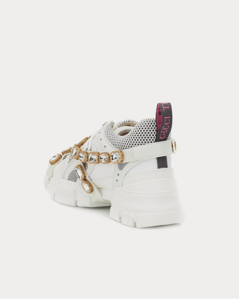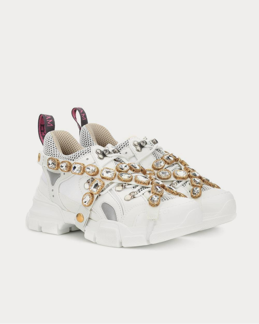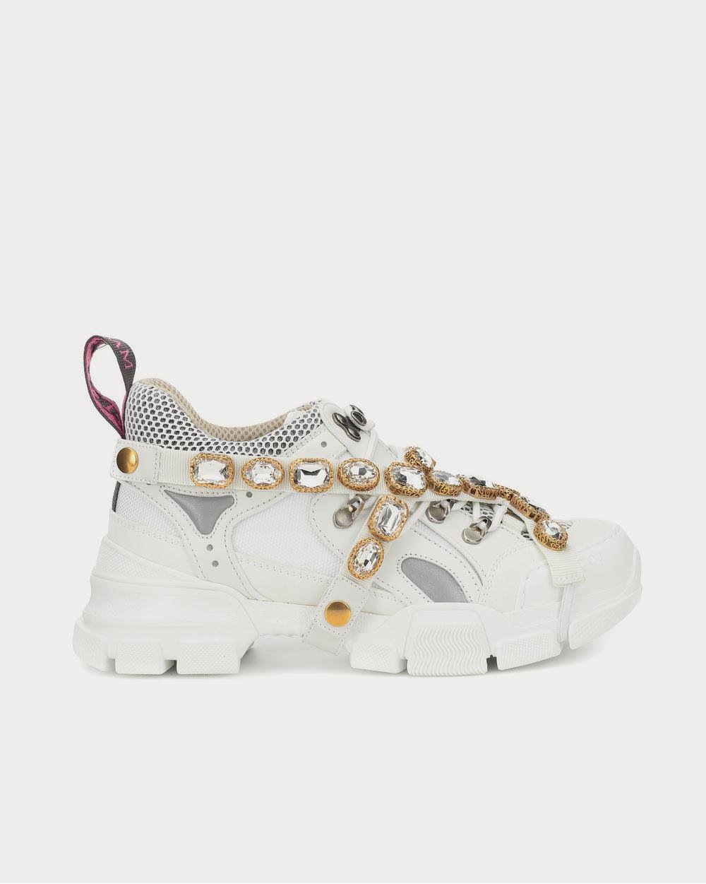 Les baskets Flashtrek tant convoitées de Gucci allient un design oversize à des détails oniriques – remarquez la bride élastique amovible brodée de cristaux. Fabriquées en Italie dans un mélange dynamique de matières telles que des semelles en caoutchouc résistantes, du daim élégant et une toile technique, le tout dans des tons blancs, ces baskets revisitées sont indispensables pour votre collection d’automne. Associez-les à des jupes féminines et suivez l’exemple du créateur.