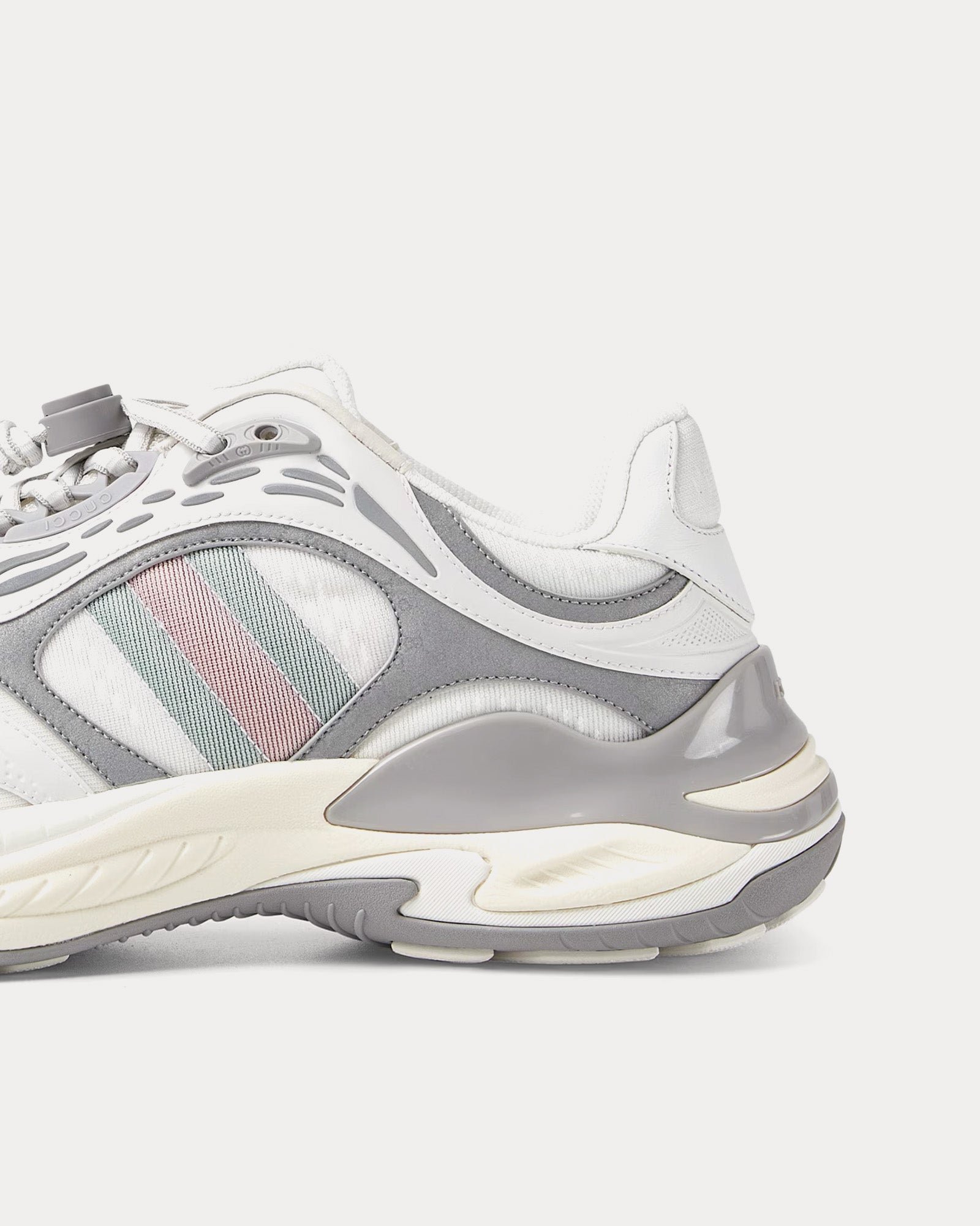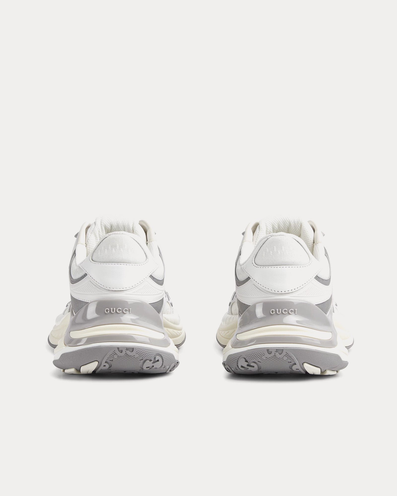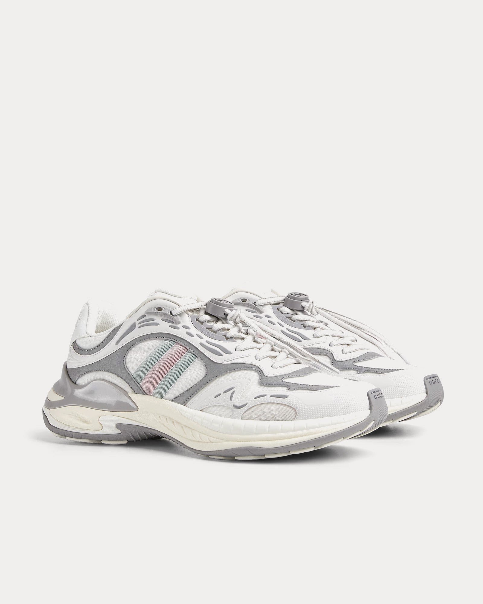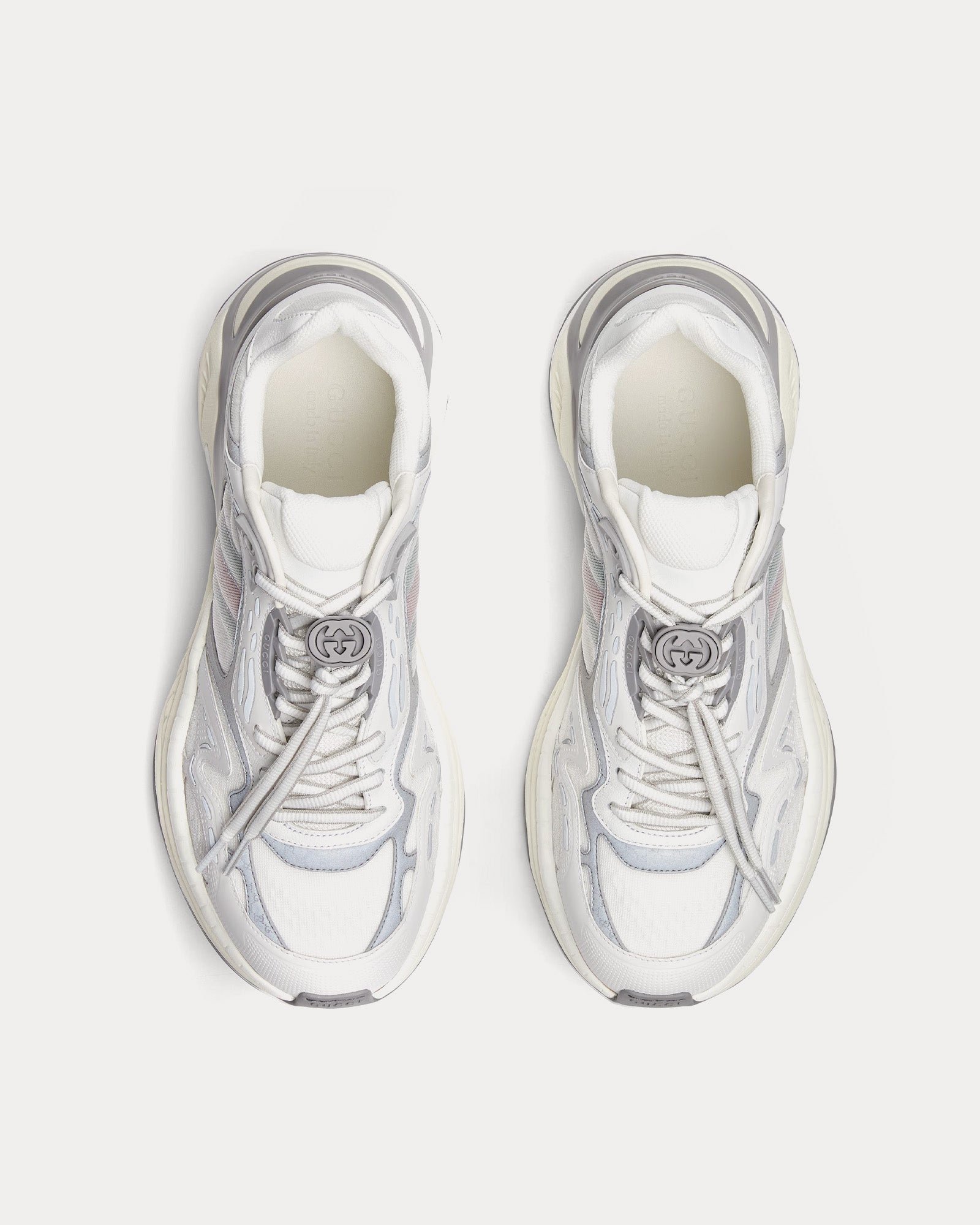 La tige est confectionnée dans un mélange de mesh respirant blanc et gris avec des empiècements en cuir de première qualité, créant un look élégant et polyvalent. Des détails réfléchissants ornés du logo GG ajoutent une touche subtile à la marque, tandis que le détail Web rembourré améliore à la fois le confort et le style signature Gucci.