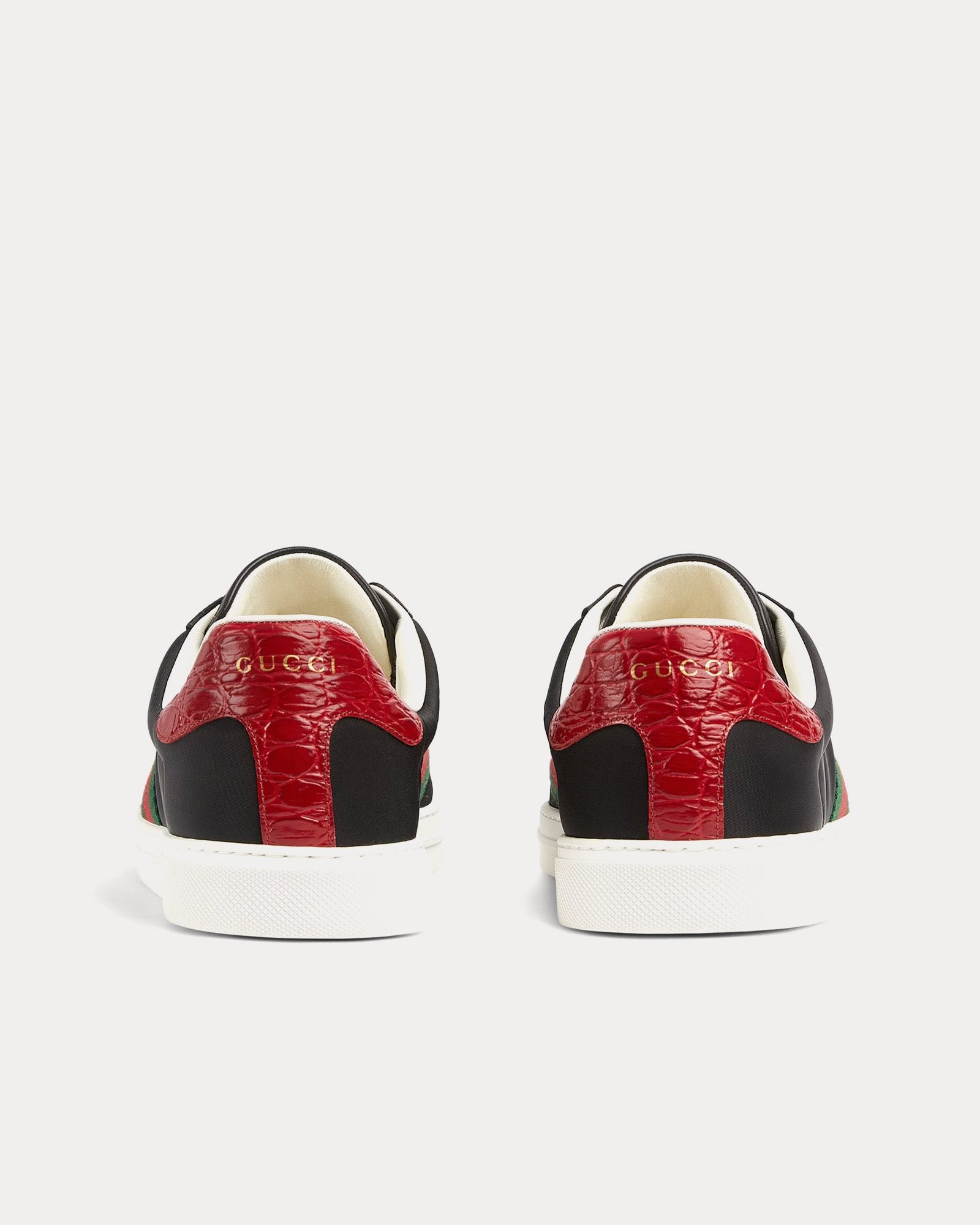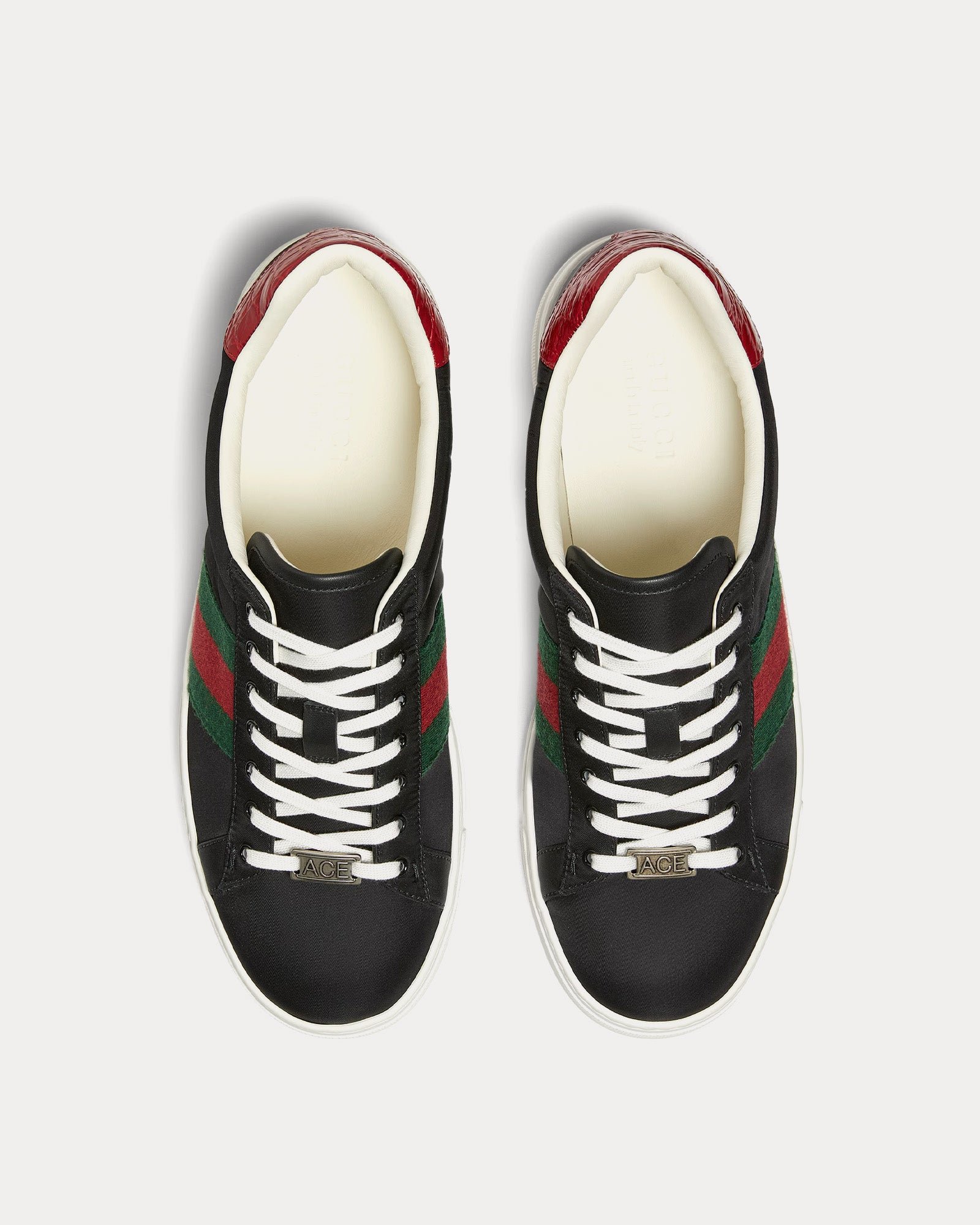 Les baskets basses pour homme GucciAce with Web en noir présentent une silhouette basse, une tige en nylon, une étiquette « ACE » en métal sur le dessus de la fermeture à lacets et la bande Web verte et rouge caractéristique de Gucci. Fabriquées en Italie.