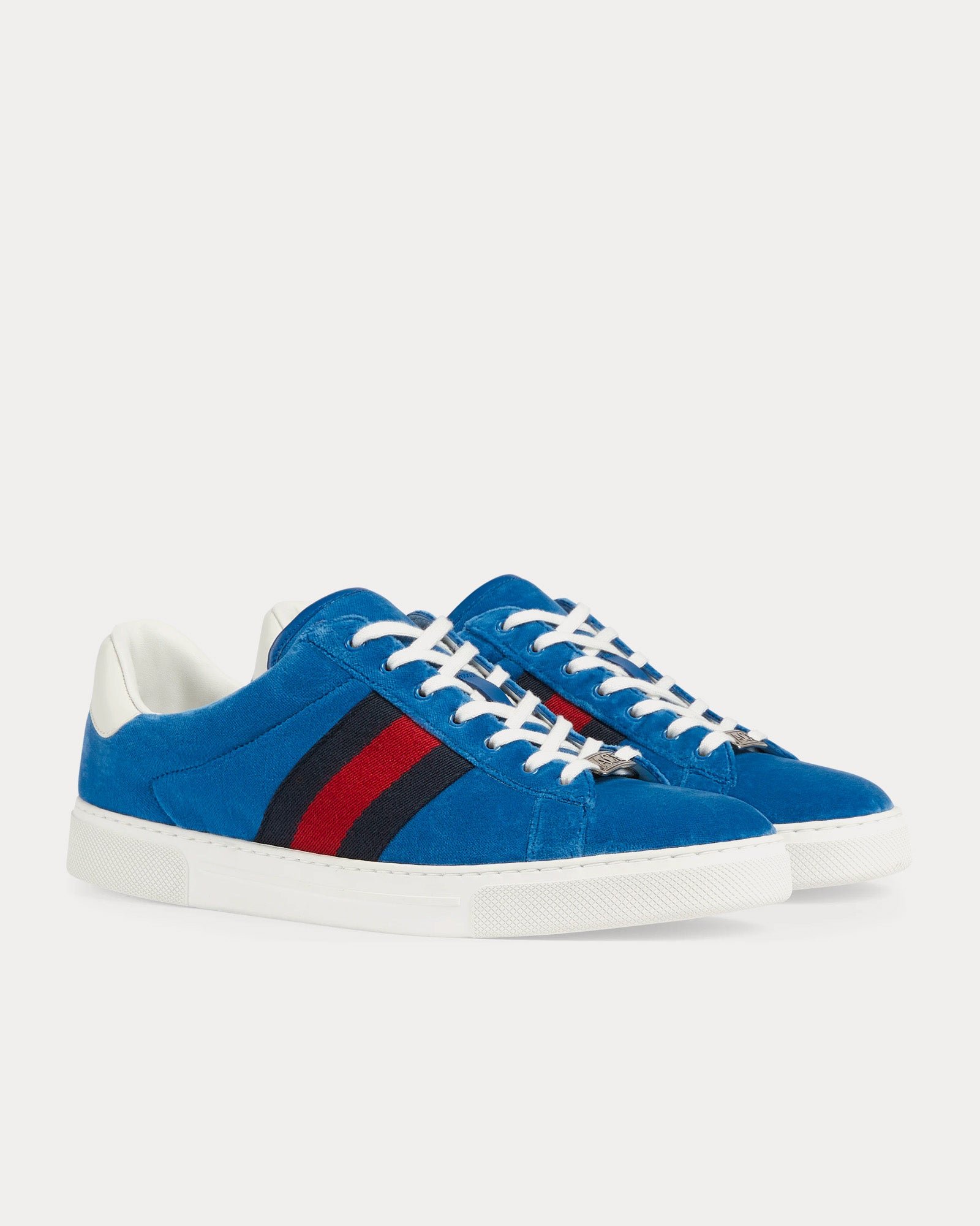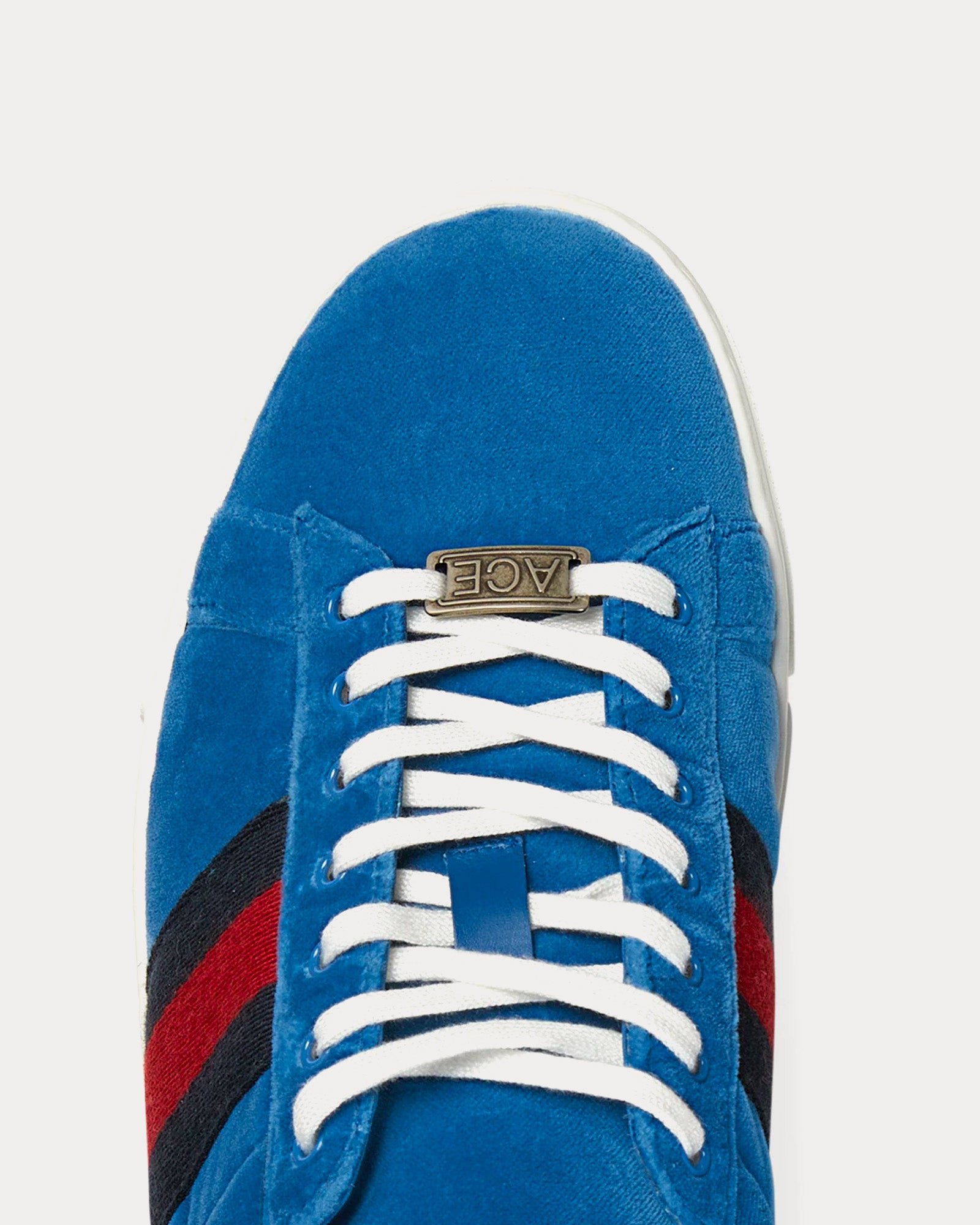 Les baskets basses pour hommes GucciAce with Web en velours bleu présentent une silhouette basse, une tige en velours, une étiquette métallique « ACE » sur la fermeture à lacets et la bande Web verte et rouge distinctive de Gucci. Fabriquées en Italie.