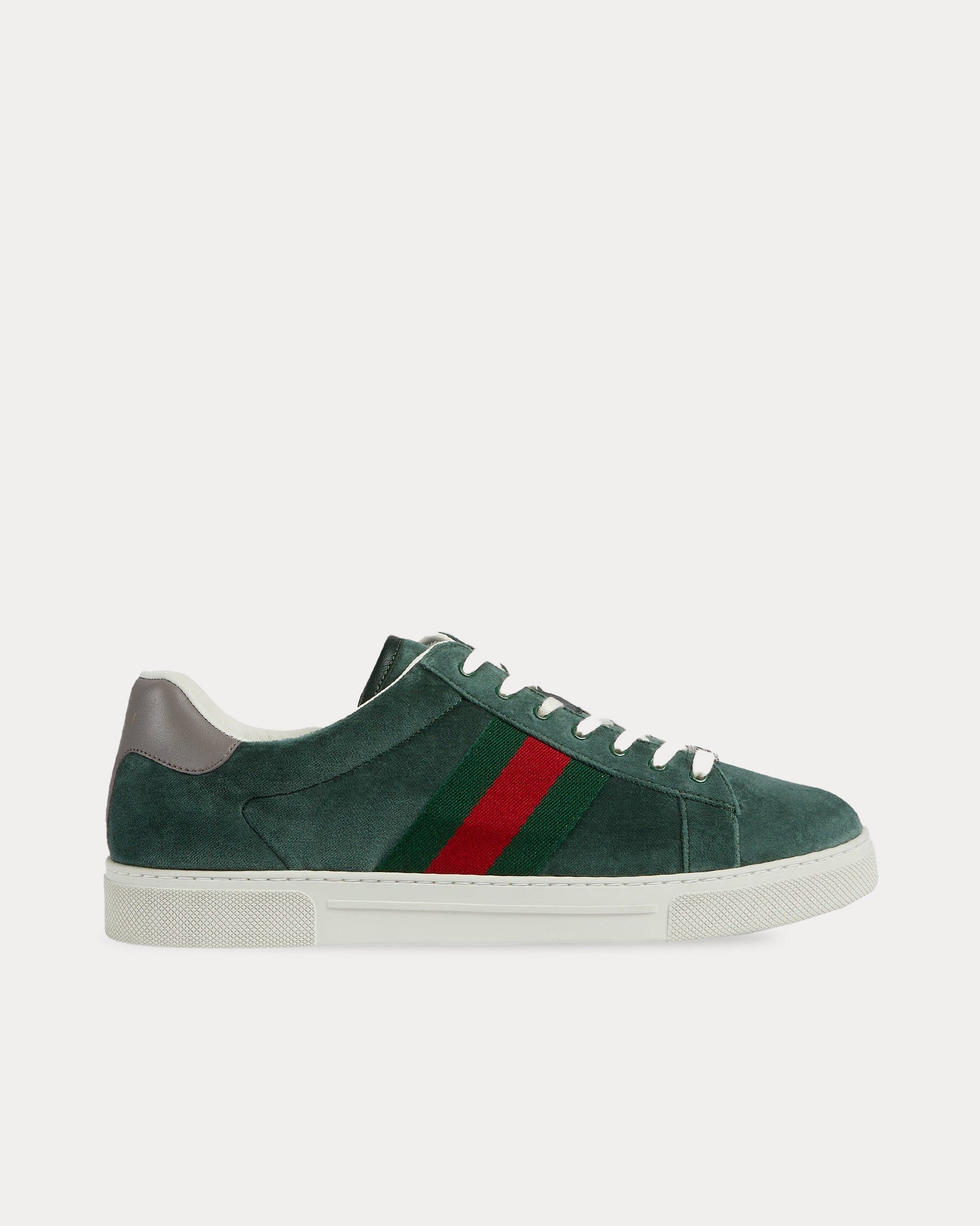 Les baskets basses pour hommes GucciAce avec Web en velours vert présentent une silhouette basse, une tige en velours, une étiquette métallique « ACE » sur la fermeture à lacets et la bande Web verte et rouge distinctive de Gucci. Fabriquées en Italie.