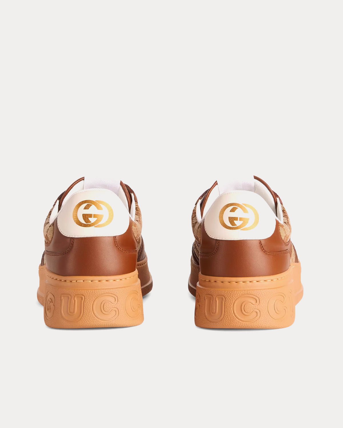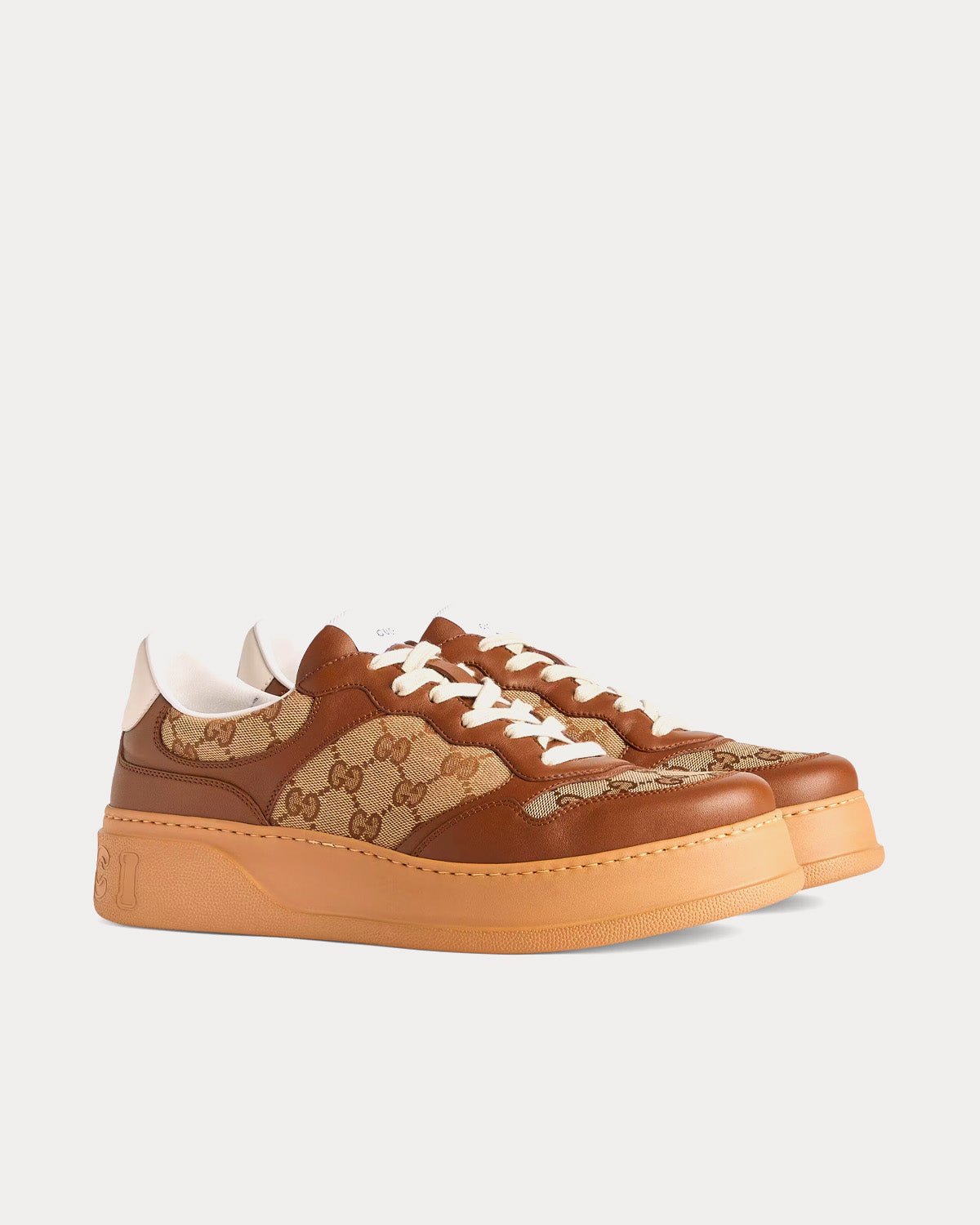 Baskets basses marron Gucci GG à la silhouette audacieuse, combinant formes, couleurs et matières pour une allure rétro. Dotées d’une semelle en caoutchouc distinctive, elles sont confectionnées en toile GG Original beige et ébène, avec une finition en cuir assortie. Fabriquées en Italie.