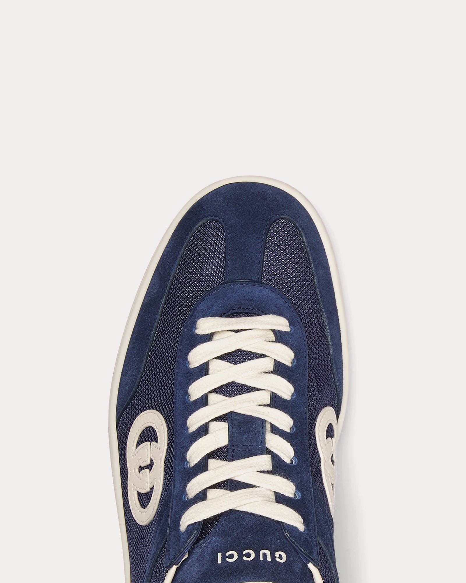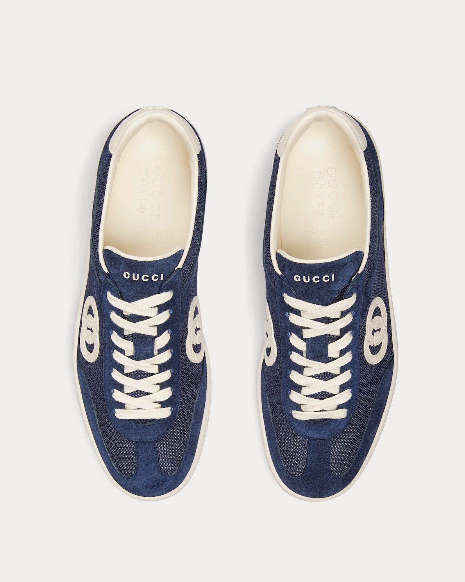 Les baskets basses pour homme Gucci Interlocking G de couleur bleue sont confectionnées en daim et présentent une tige en mesh et daim, des empiècements en toile et le logo emblématique Interlocking G. Fabriquées en Italie.