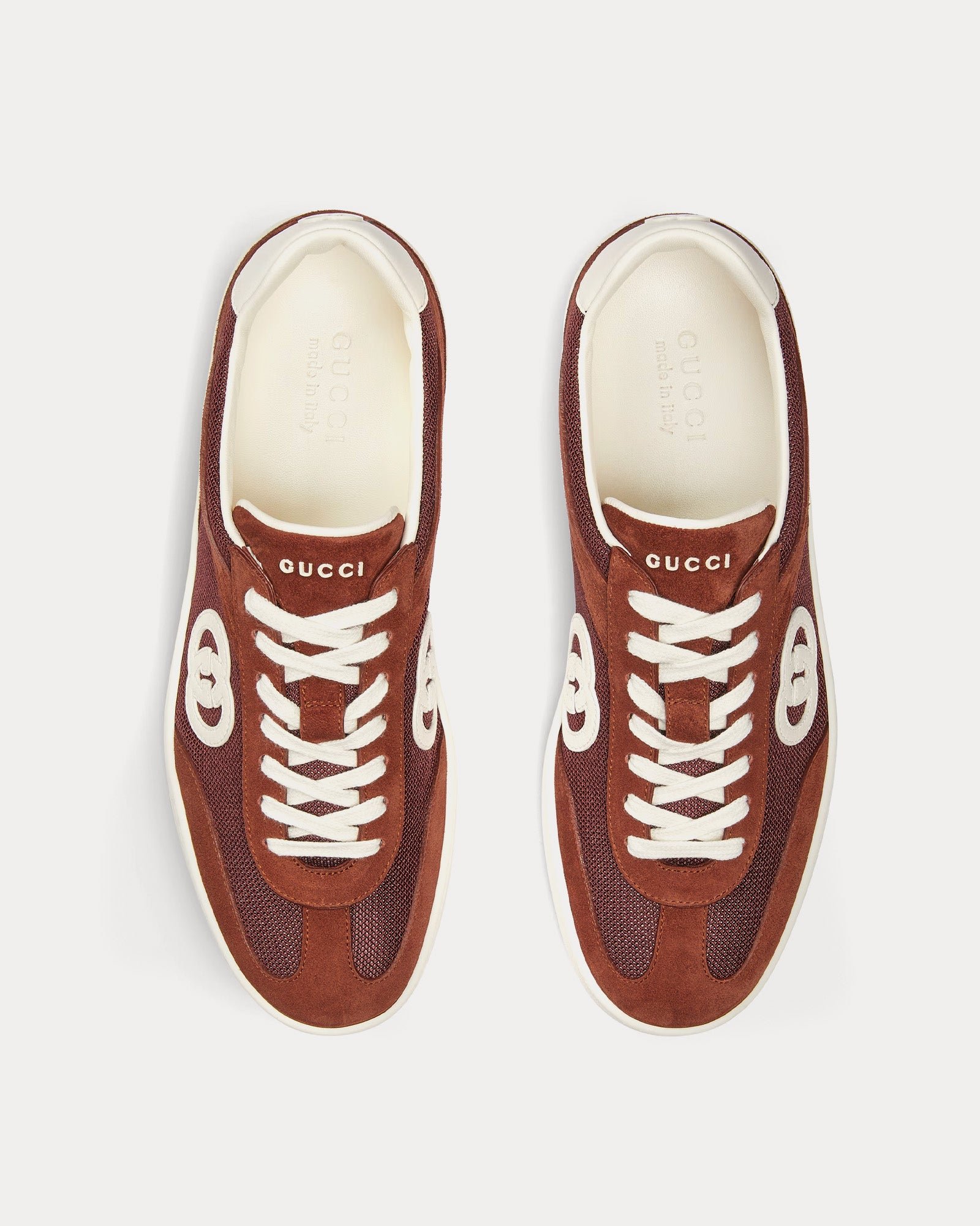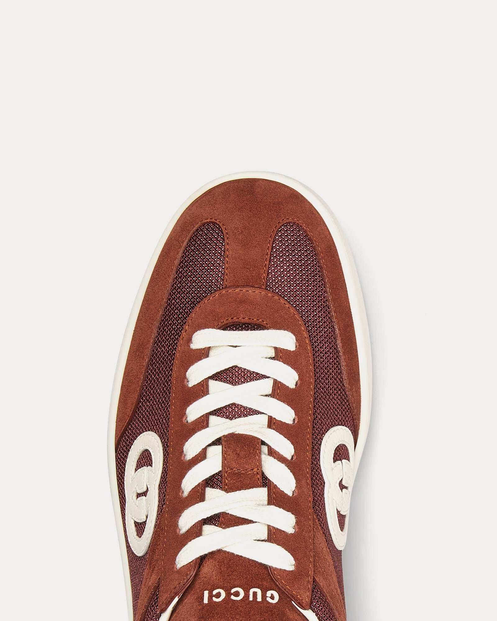 Les baskets basses pour homme GucciInterlocking G de couleur bordeaux sont confectionnées en daim et présentent une tige en mesh et daim, des empiècements en toile et le logo emblématique Interlocking G. Fabriquées en Italie.