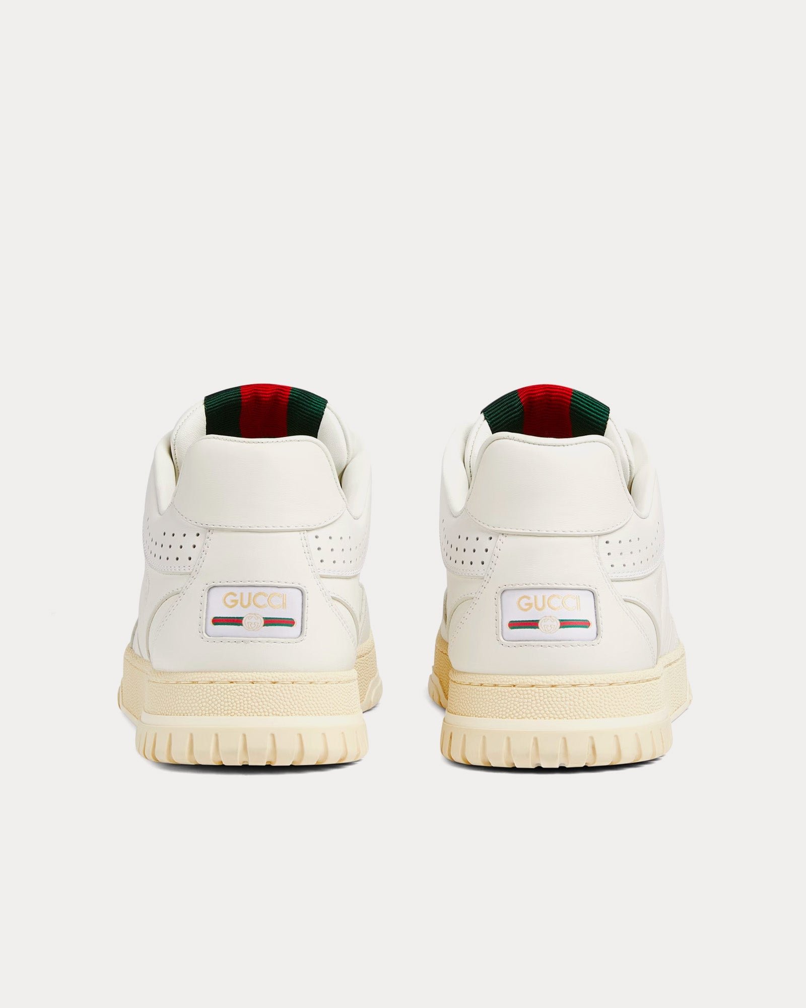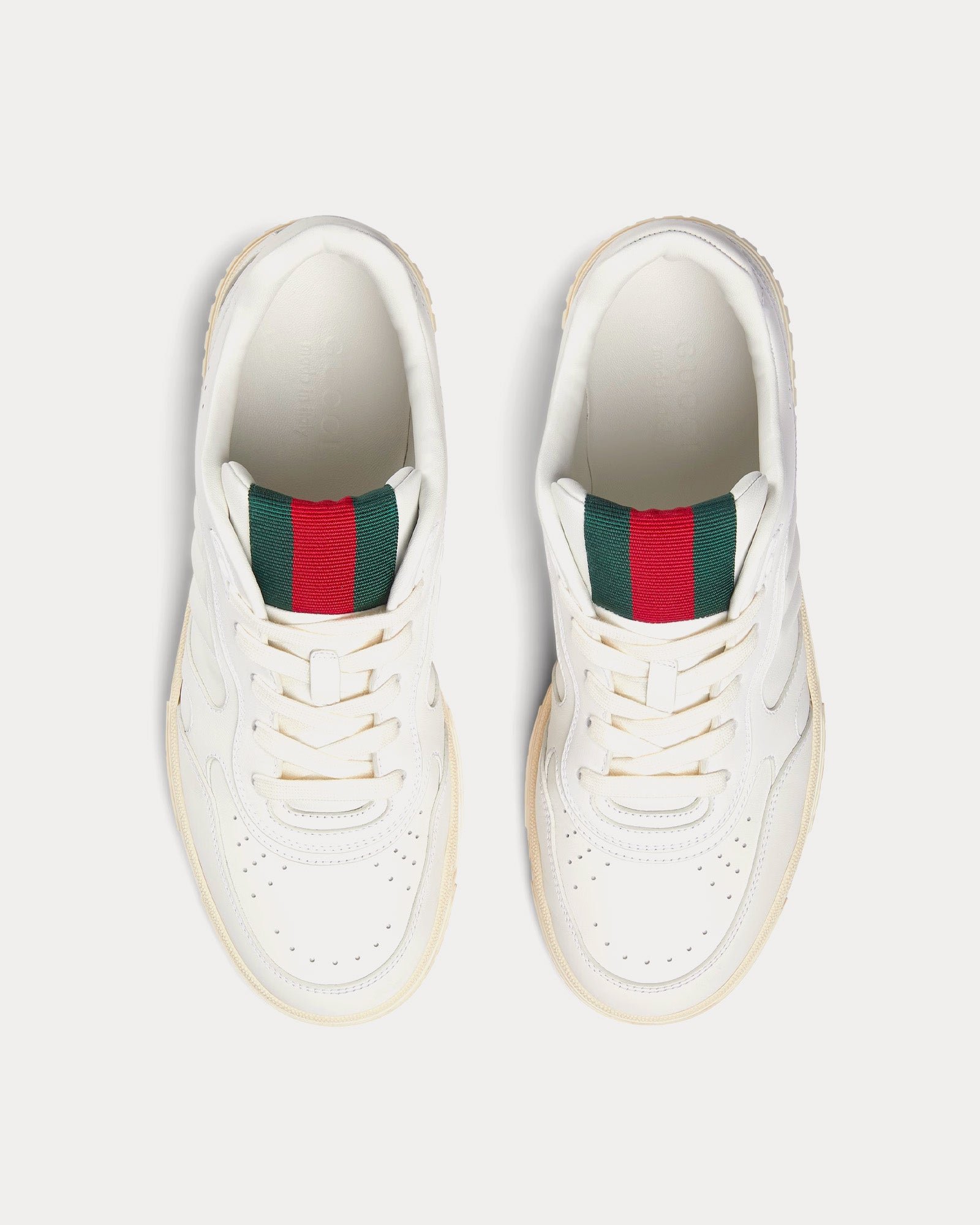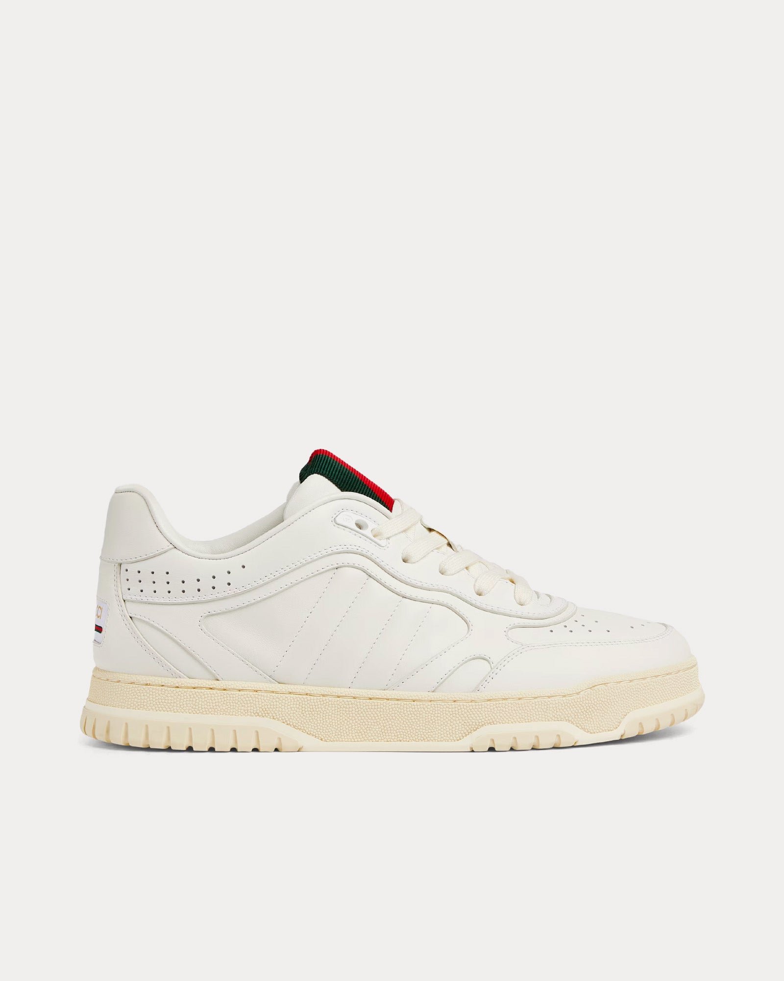 Les baskets basses GucciRe-Web pour hommes en blanc présentent une tige en cuir traitée avec un processus spécifique pour la rendre douce et brillante, une étiquette Web avec inscription Gucci et G entrelacés, des semelles extérieures en caoutchouc avec G entrelacés et logo Gucci, des détails G entrelacés sur les œillets et une languette Web verte et rouge audacieuse. Fabriquées en Italie.