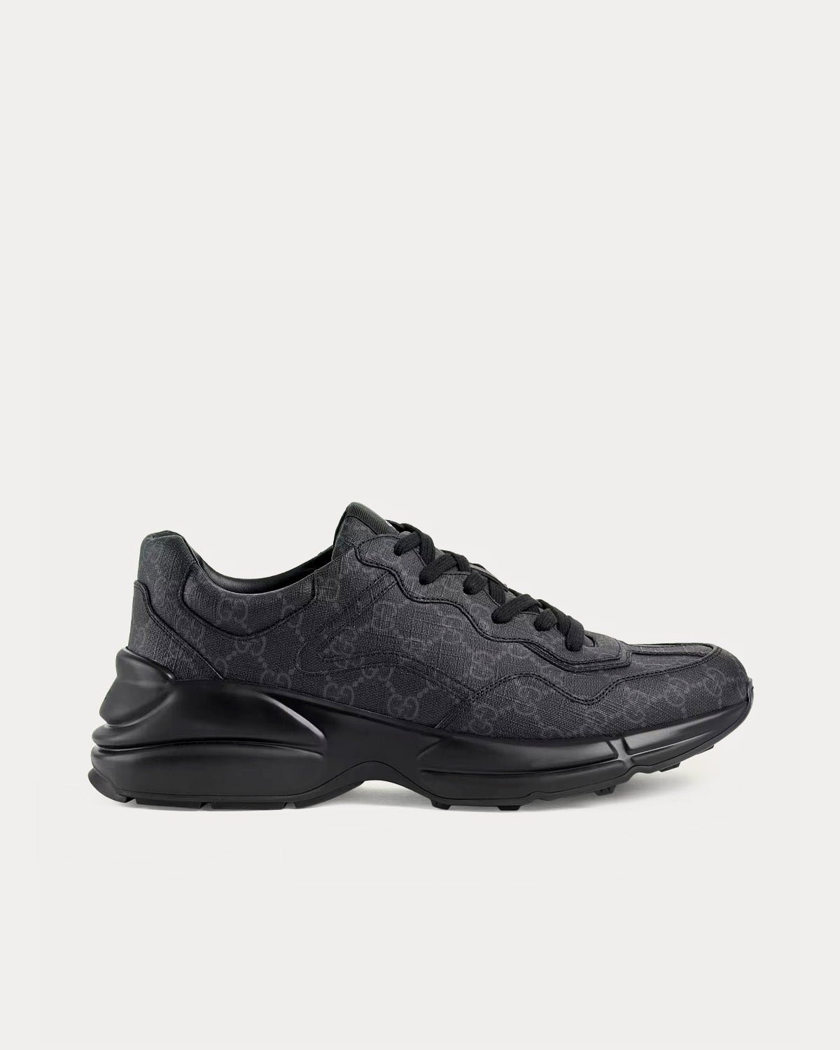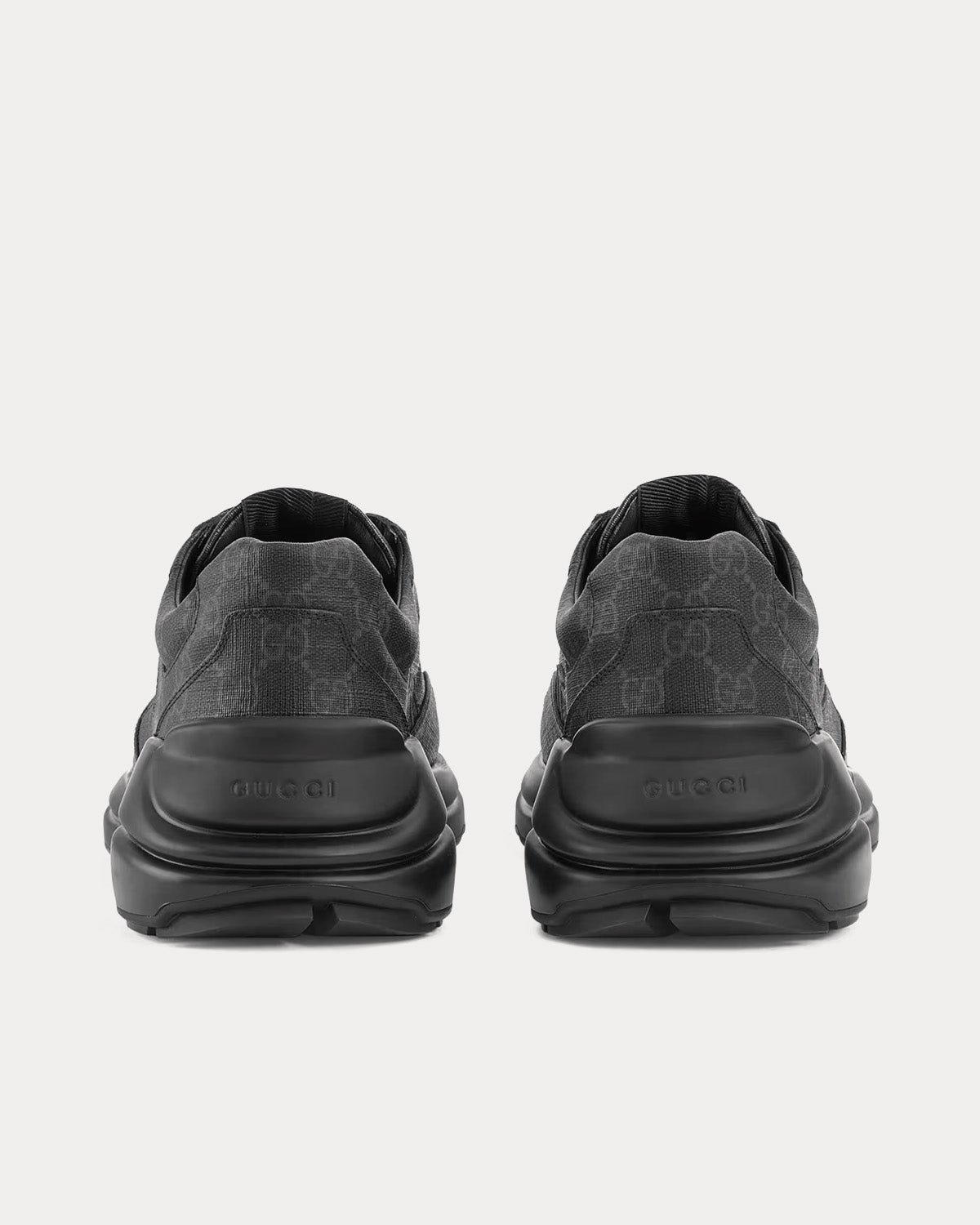 Les baskets basses pour hommes GucciRhyton en toile GG Supreme grise et graphite présentent un design élégant de style sportif, des fermetures à lacets, un talon bas et des semelles en caoutchouc. Fabriquées en Italie.