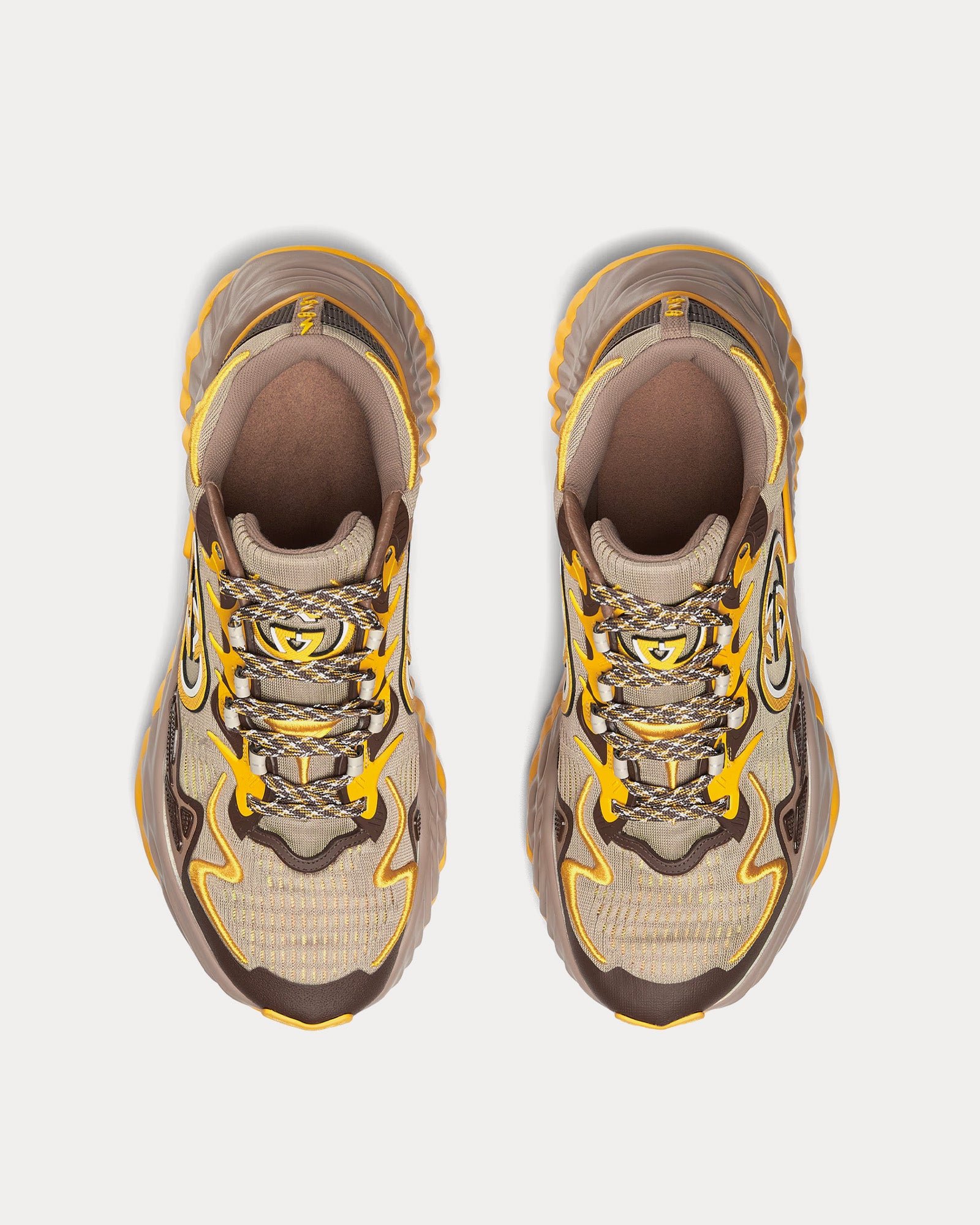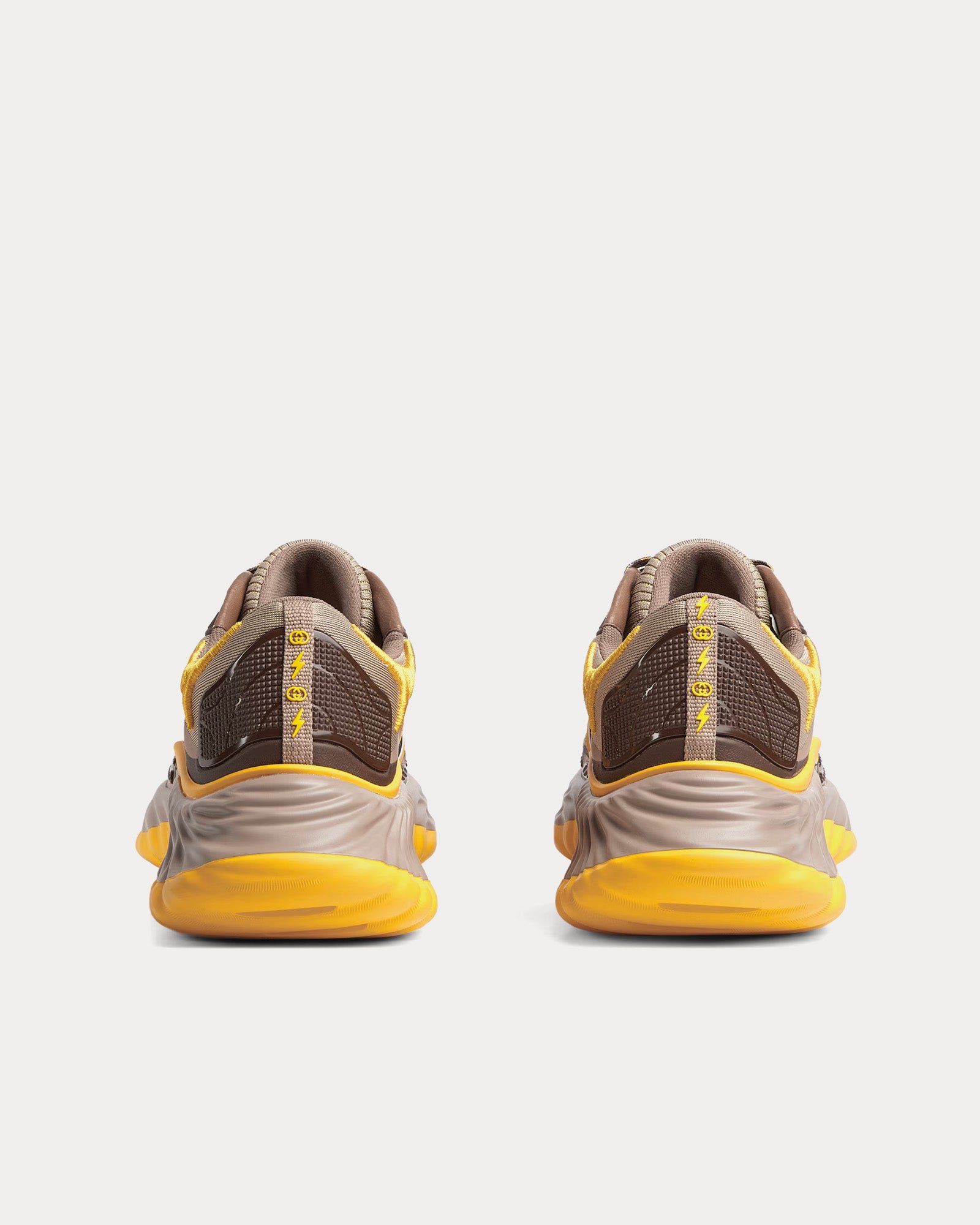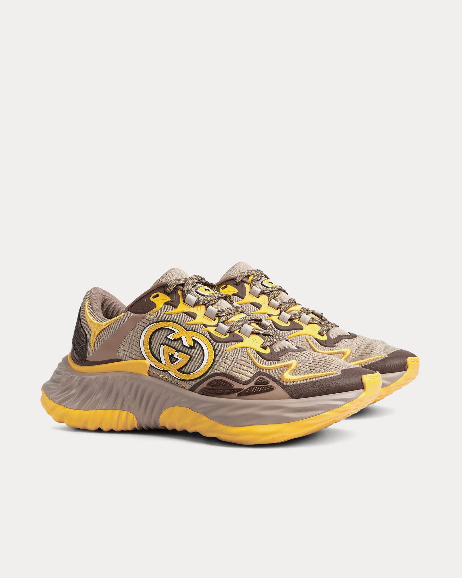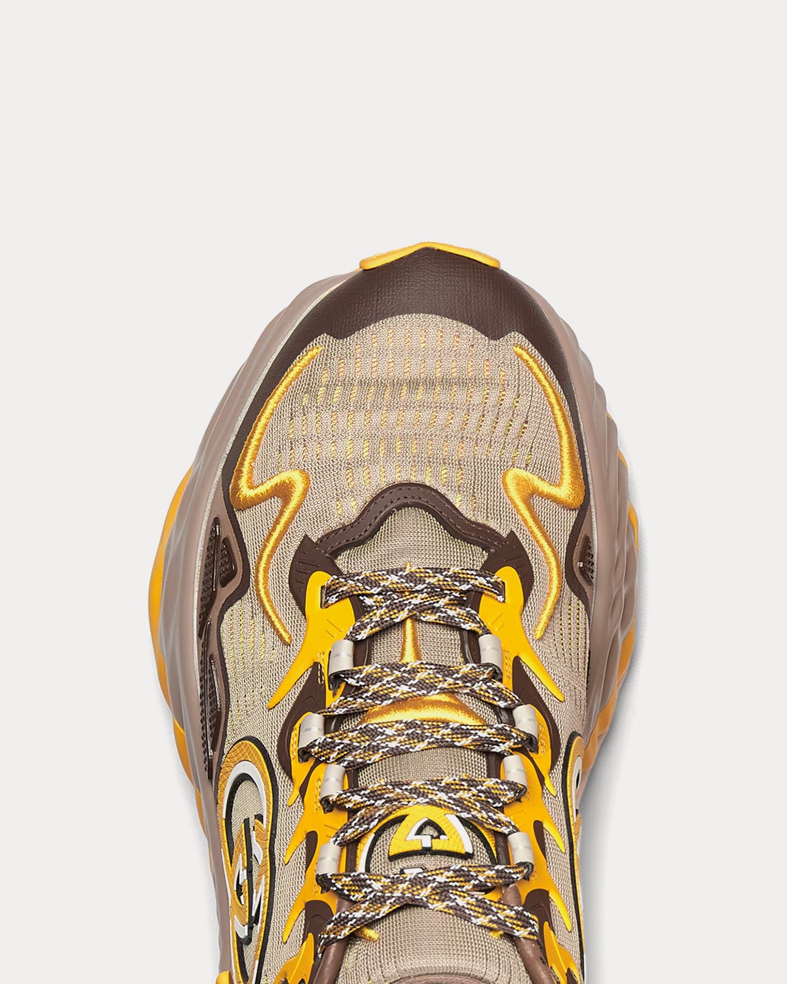Les baskets basses pour hommes GucciRipple Mesh en beige et jaune présentent une tige en mesh respirant avec des détails brodés, des G entrelacés et des détails en caoutchouc éclair, un logo Gucci entrelacé sur les semelles en caoutchouc et un logo G entrelacé en caoutchouc. Fabriquées en Italie.