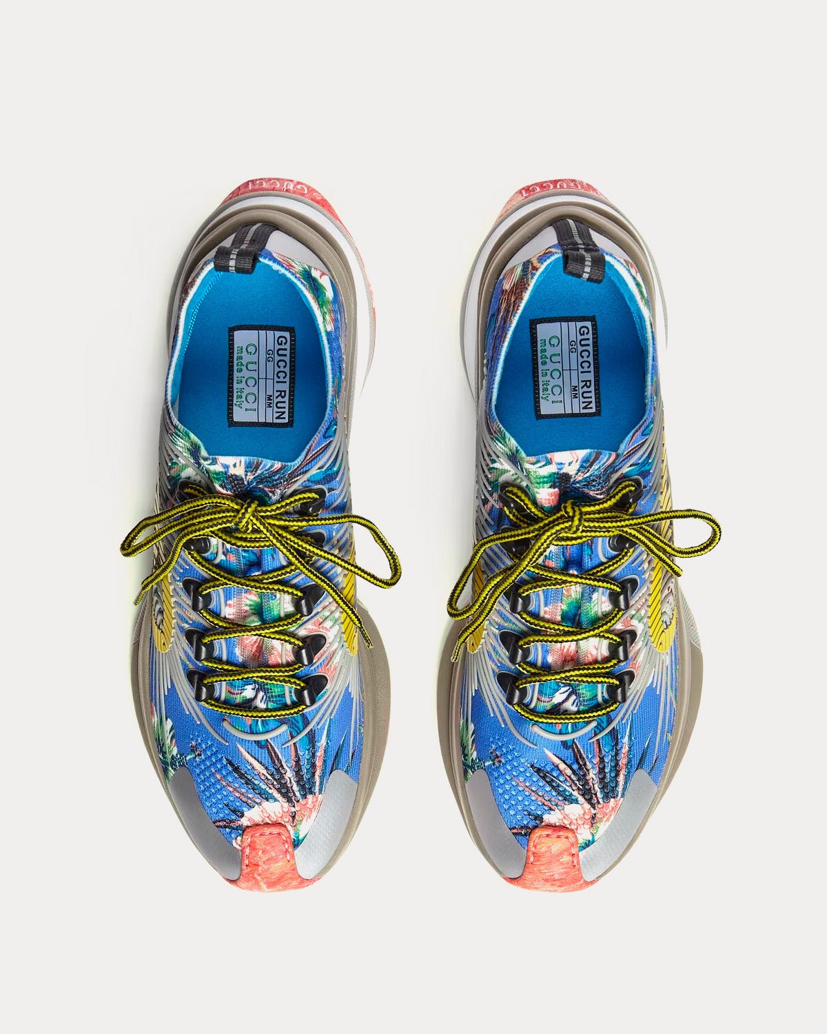 Un imprimé floral coloré et une semelle effet marbre confèrent une touche raffinée à cette sneaker d’inspiration sportive. Rappelant les tissus utilisés dans le monde du sport, la Gucci Run est confectionnée en maille technique et ornée d’un logo audacieux. Cette chaussure fait partie de la collection MX de Gucci, une collection qui prône la liberté d’expression et explore les codes identitaires.