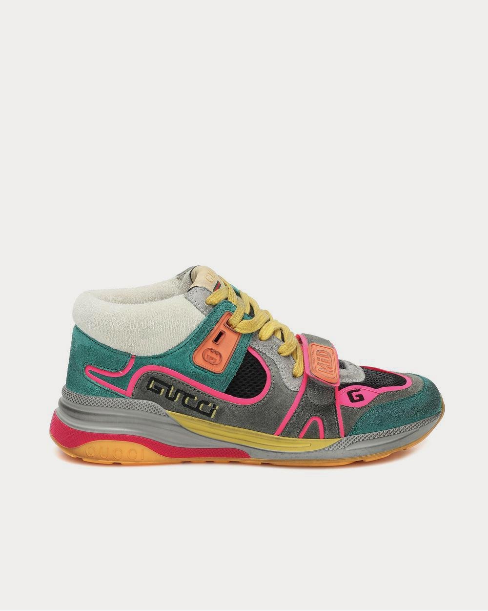 Inspirées des baskets de course classiques, les baskets Ultrapace de Gucci se présentent dans une silhouette mi-haute pour la nouvelle saison. Fabriquées en Italie, ces baskets dynamiques associent une palette de couleurs vives à du daim vieilli pour un effet vintage d’occasion, tandis que le logo de la marque est visible grâce à des broderies et des détails en caoutchouc.