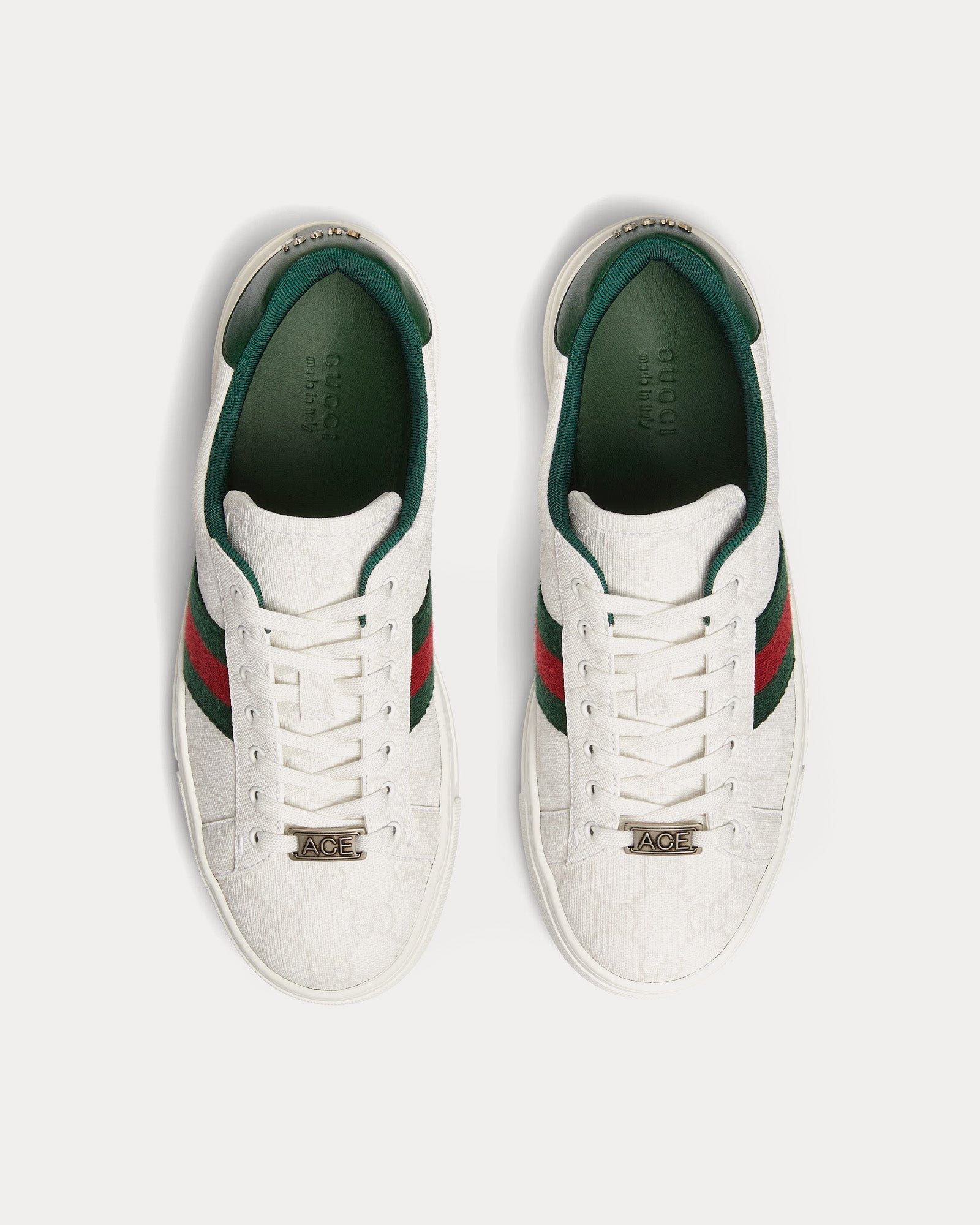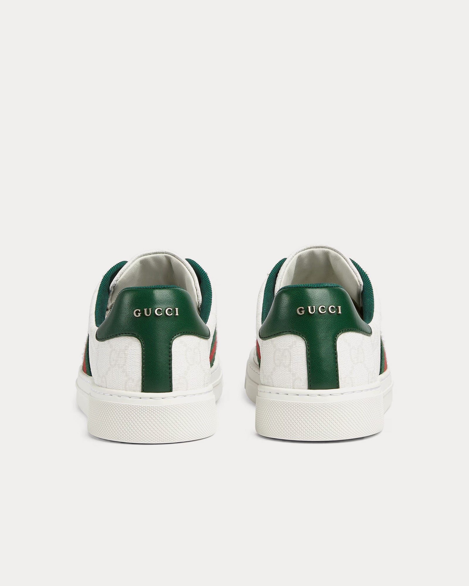 Les baskets basses pour femme GucciAce avec bande Web en blanc présentent une silhouette basse, une tige en toile GG Supreme, une étiquette « ACE » en métal sur le dessus de la fermeture à lacets et la bande Web verte et rouge distinctive de Gucci. Fabriquées en Italie.