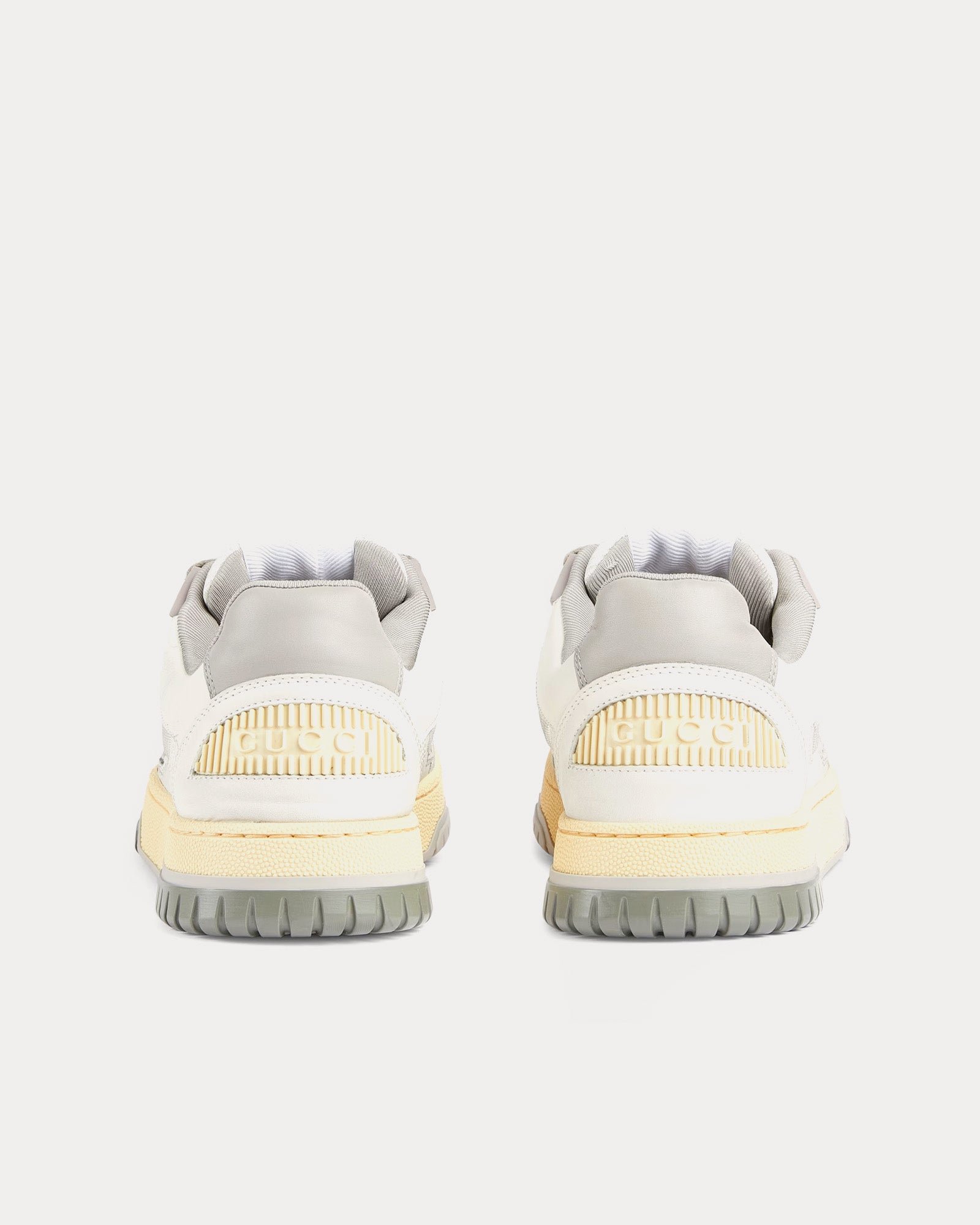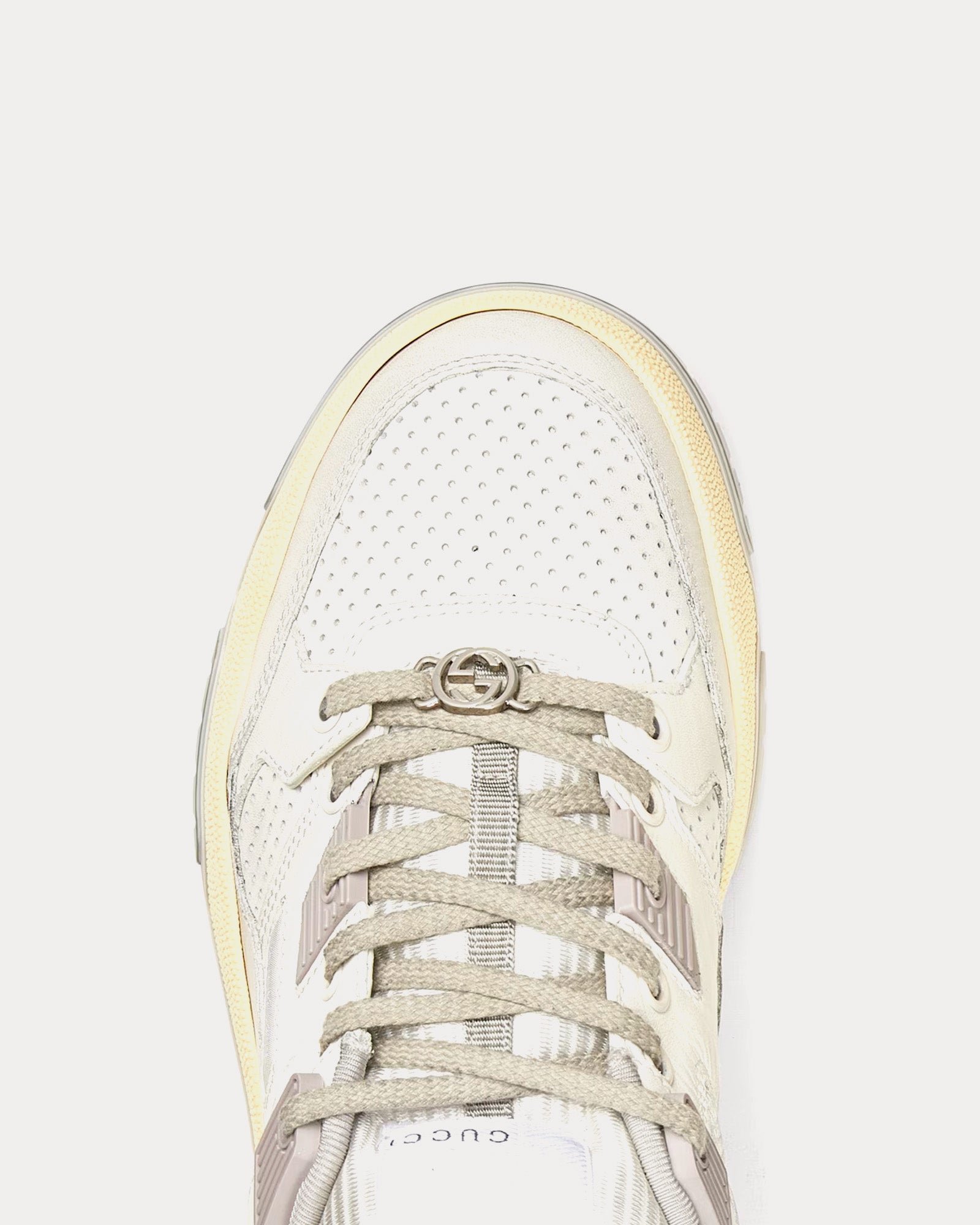 Les baskets basses pour femme GucciDistressed Effect en blanc cassé et gris sont confectionnées en cuir et présentent des empiècements en tissu perforé, des détails en caoutchouc, l’inscription Gucci, un détail G entrelacé sur les lacets, des semelles en caoutchouc et une fermeture à lacets. Fabriquées en Italie.