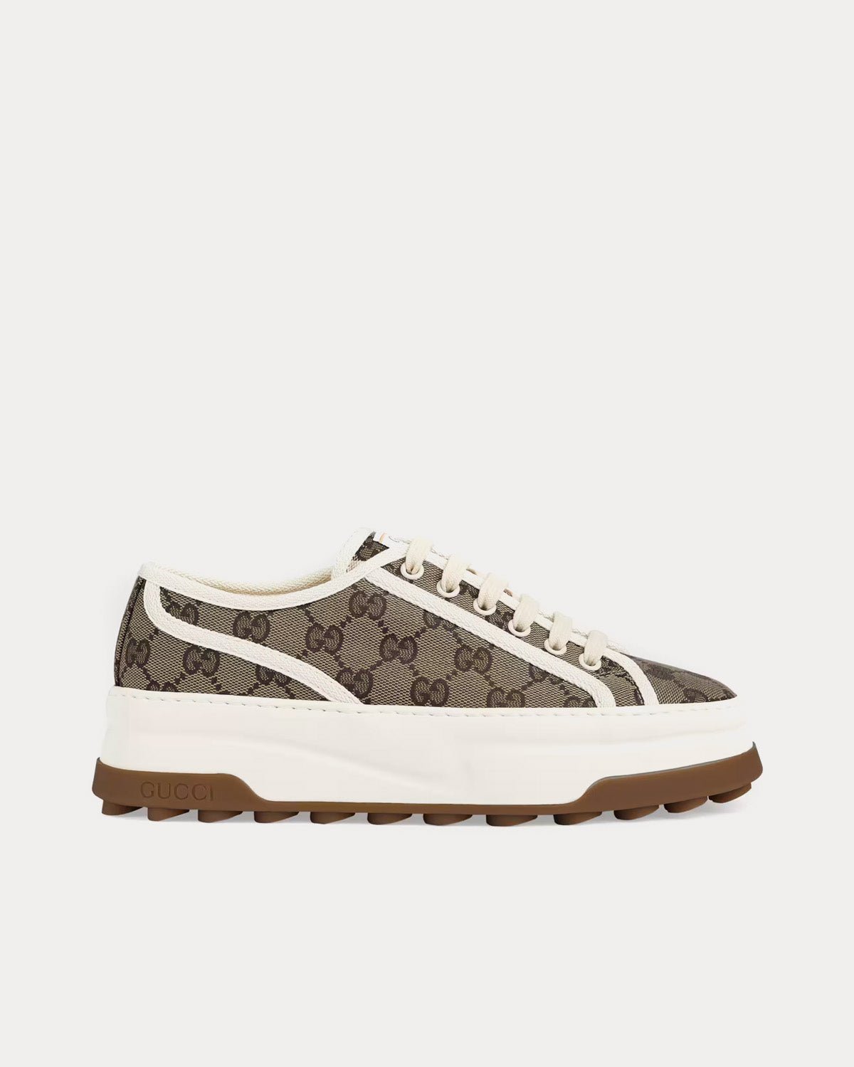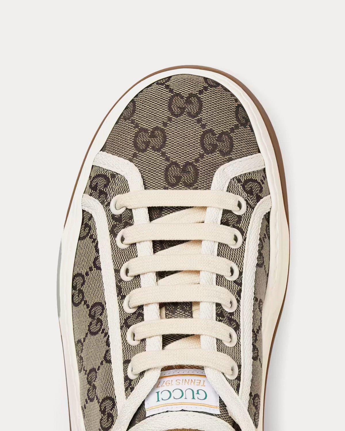 Les baskets basses pour femmes GucciGG Canvas en beige et ébène. La toile GG originale présente une silhouette de basket inspirée des courts de tennis, des bordures en gros-grain blanc et des semelles en caoutchouc avec adhérence en G entrelacés. Fabriquées en Italie.