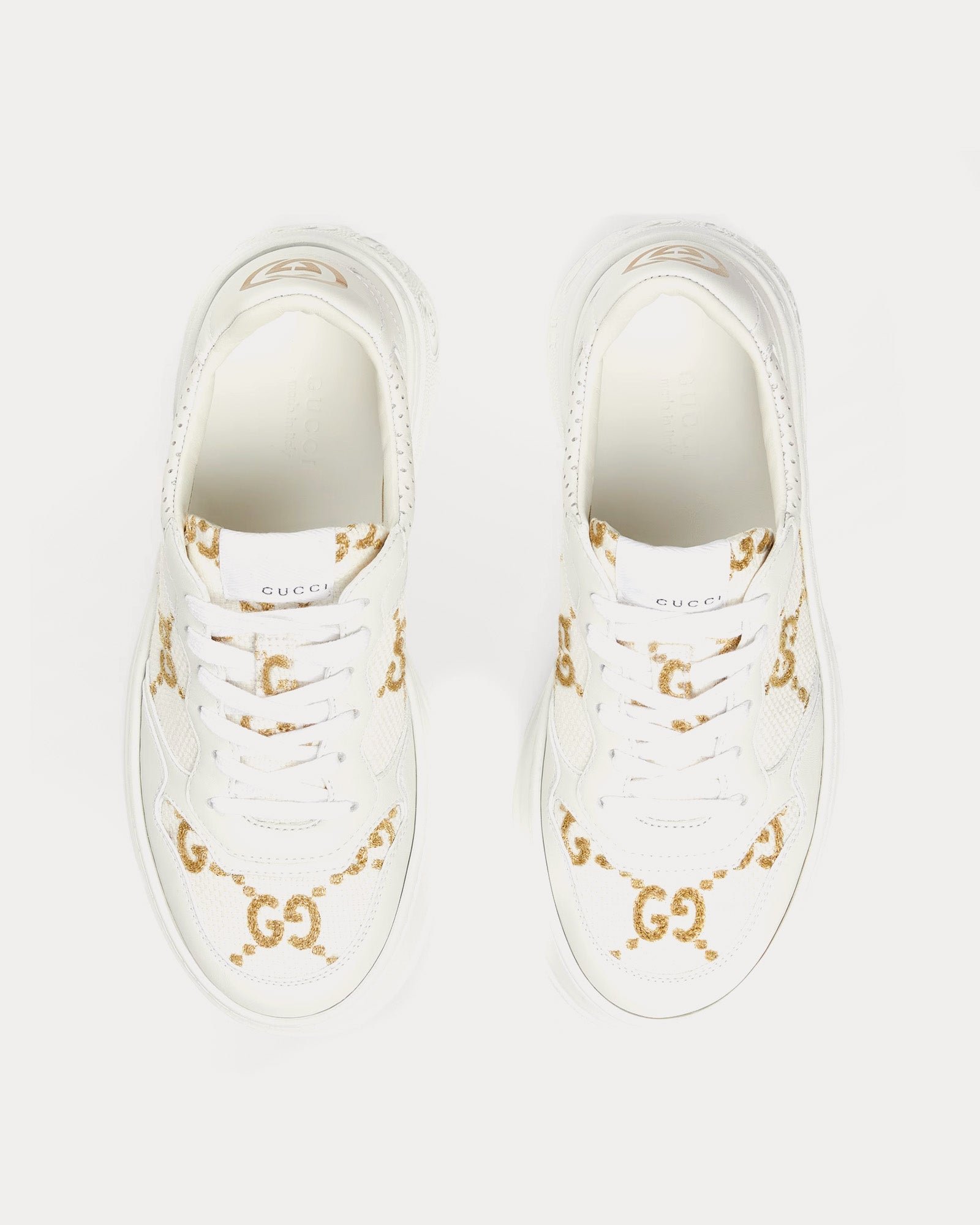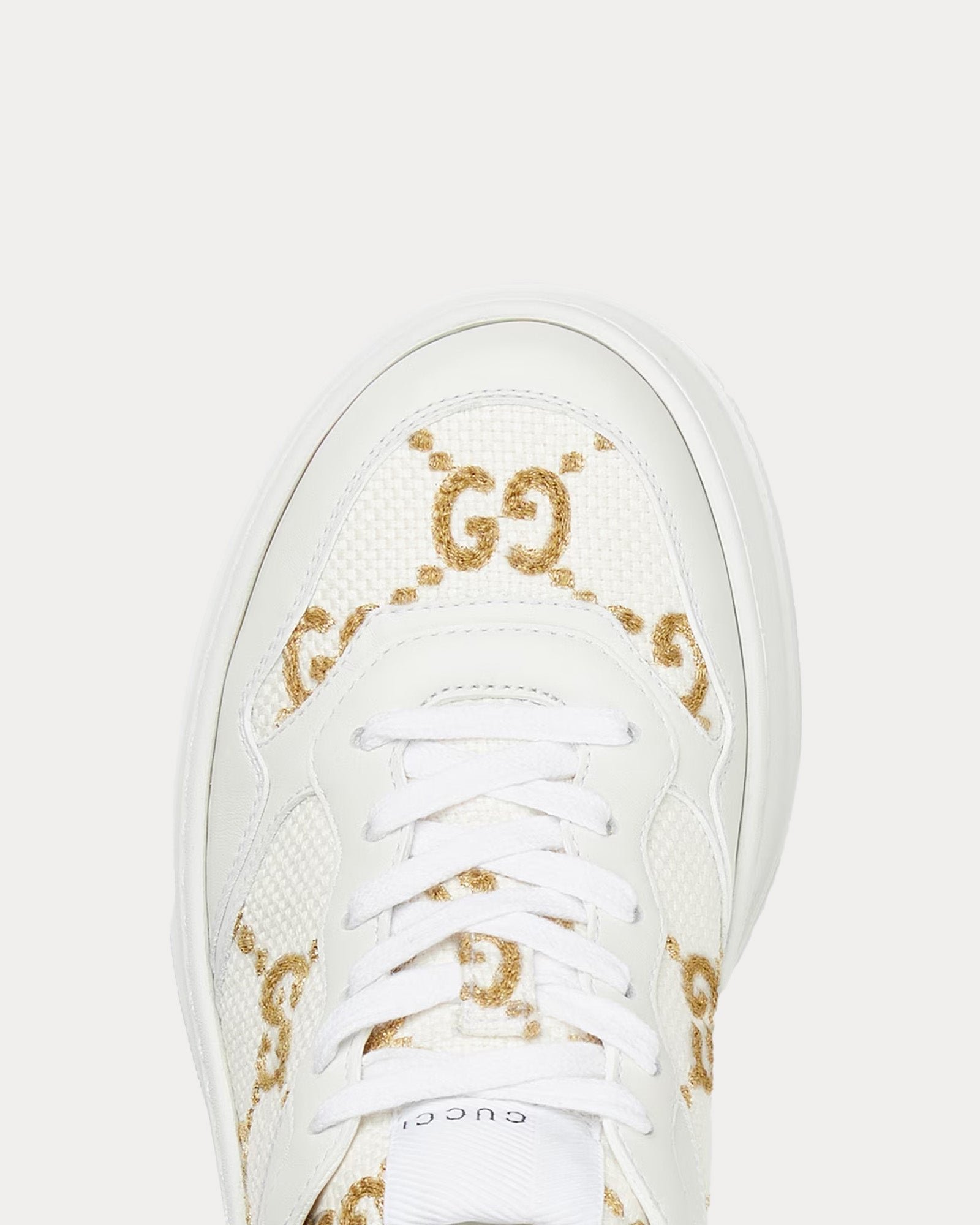 Baskets basses blanches à plateforme Gucci GG avec tissu lamé doré GG