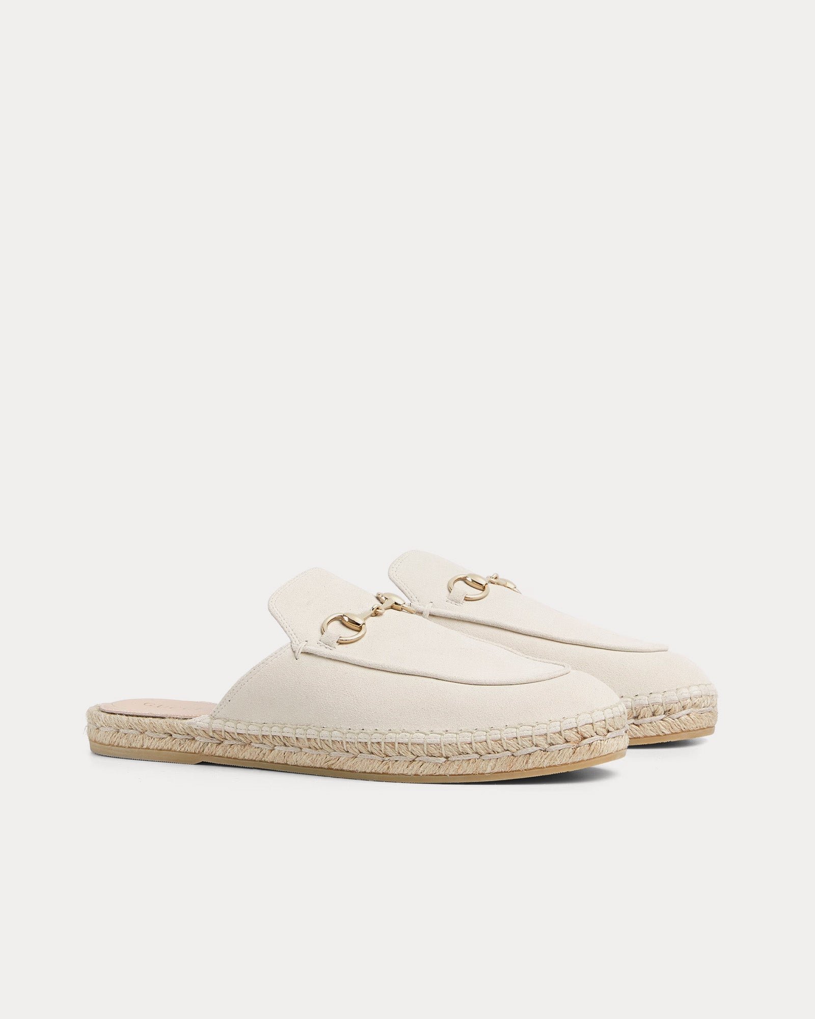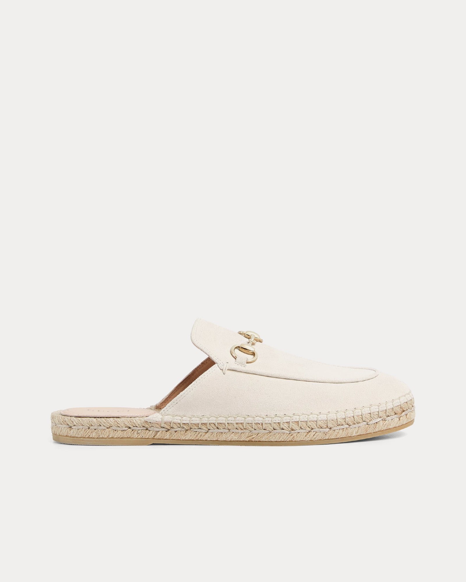 Les mules espadrilles en daim à mors de cheval pour femme Gucci Mules espadrilles en daim à mors de cheval en ivoire allient héritage classique et élégance décontractée. Confectionnées en daim raffiné, ces mules à enfiler sont rehaussées du mors de cheval emblématique de Gucci, couleur or clair, clin d’œil aux riches racines équestres de la marque.