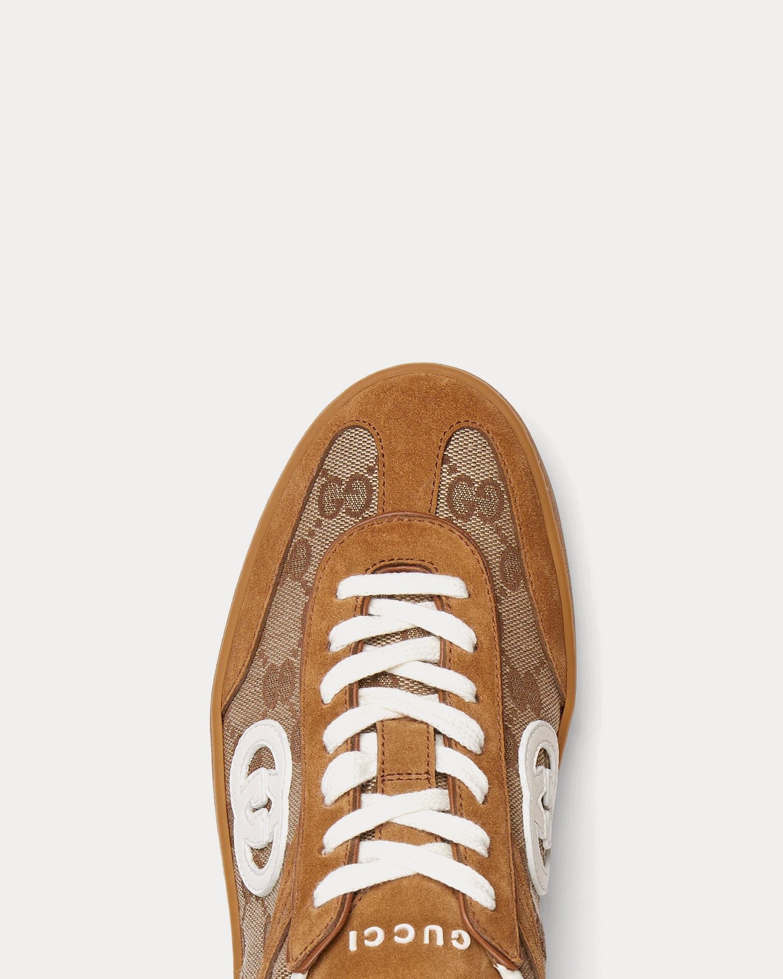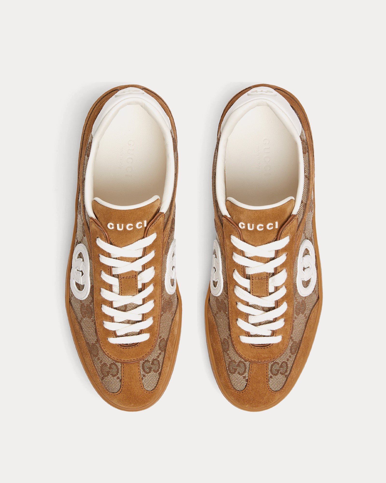 Les baskets basses Gucci pour femme GucciInterlocking G de couleur marron sont confectionnées en daim et arborent une tige en toile GG, des empiècements en toile et l’emblématique logo G entrelacé. Fabriquées en Italie.