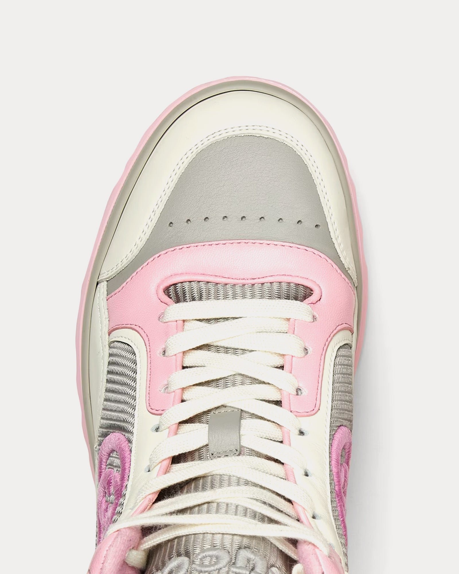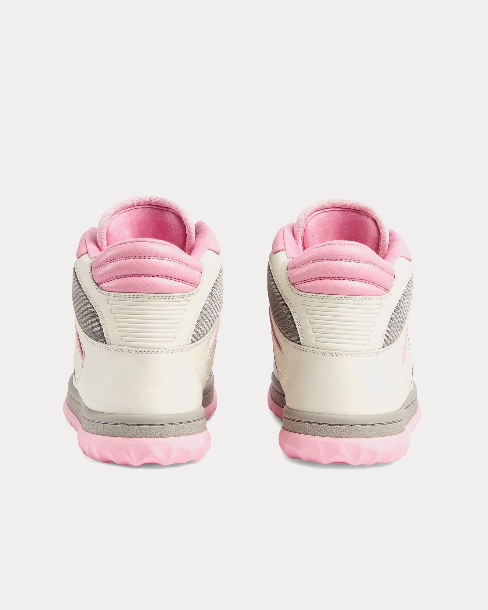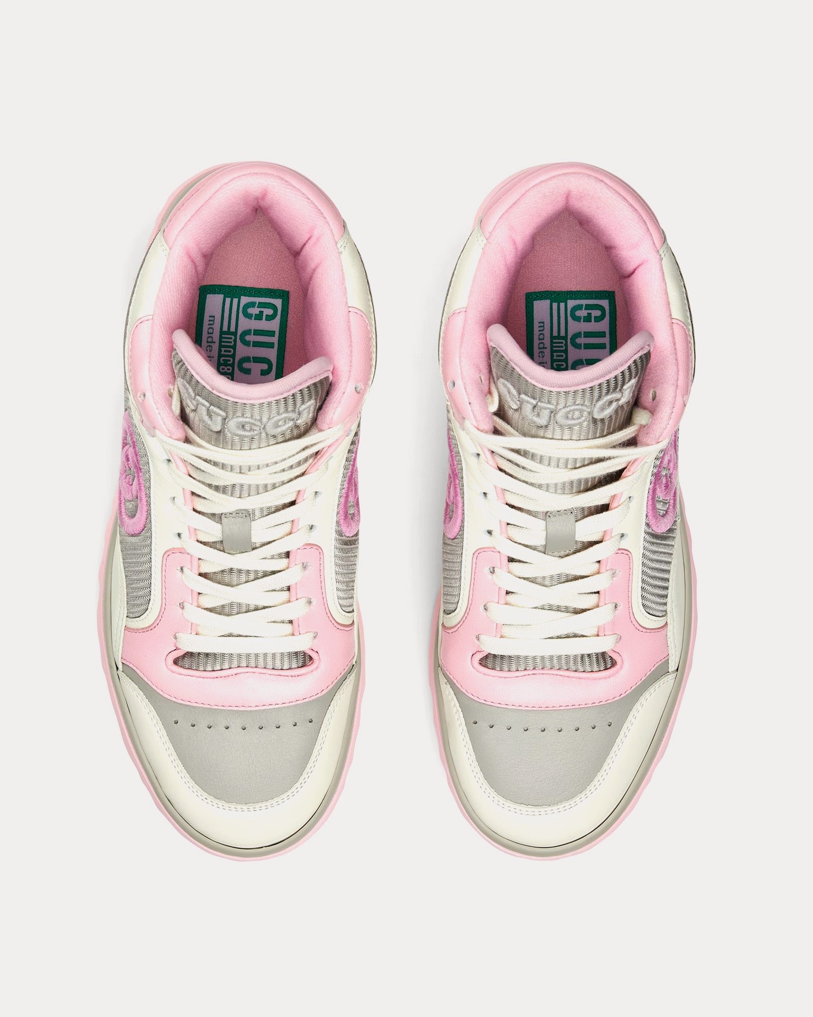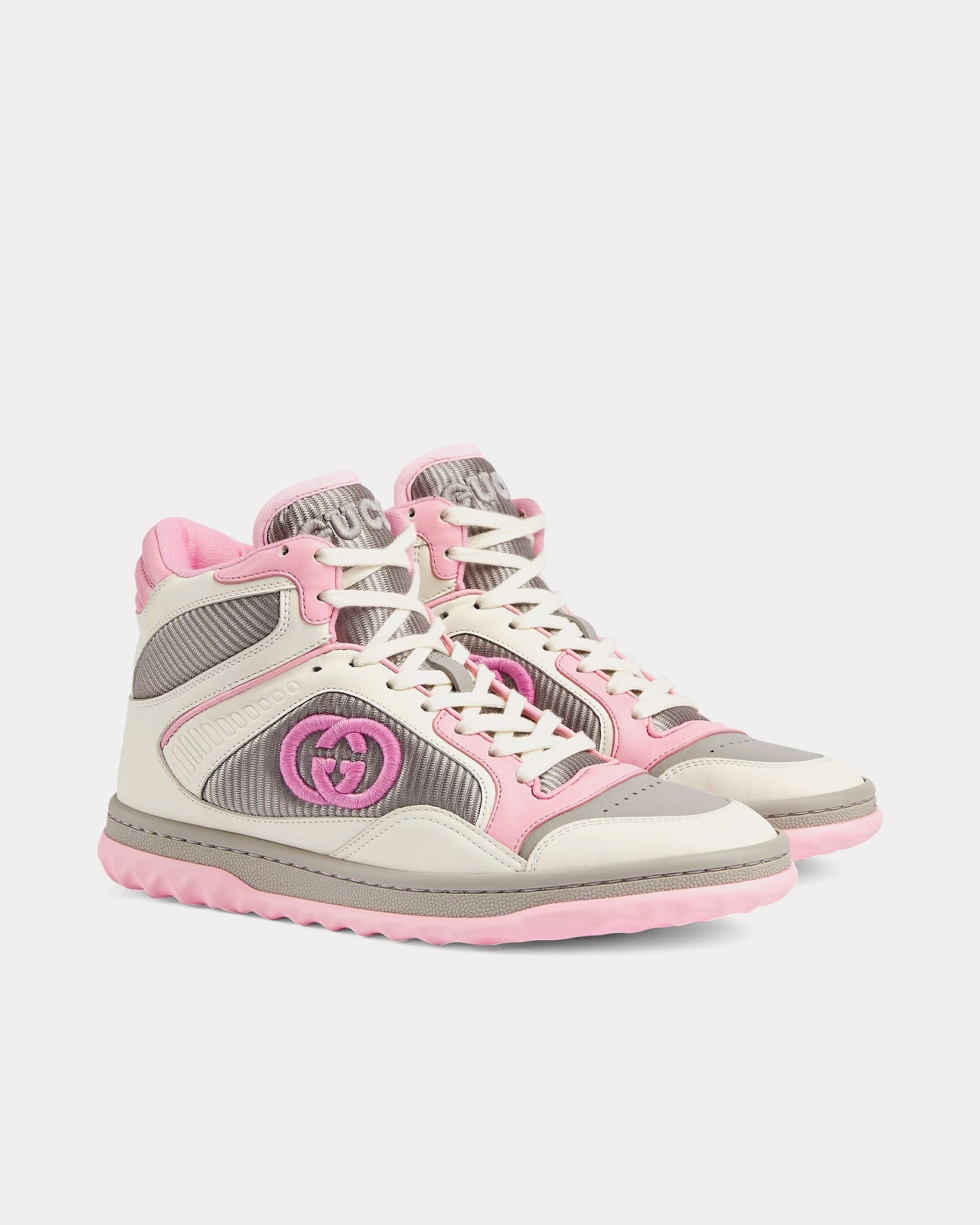 Les baskets montantes pour femmes GucciMAC80 en blanc cassé et rose sont fabriquées en cuir et présentent une broderie G entrelacée, un bout rond, une semelle en caoutchouc et une broderie Gucci sur toute la surface. Fabriquées en Italie.