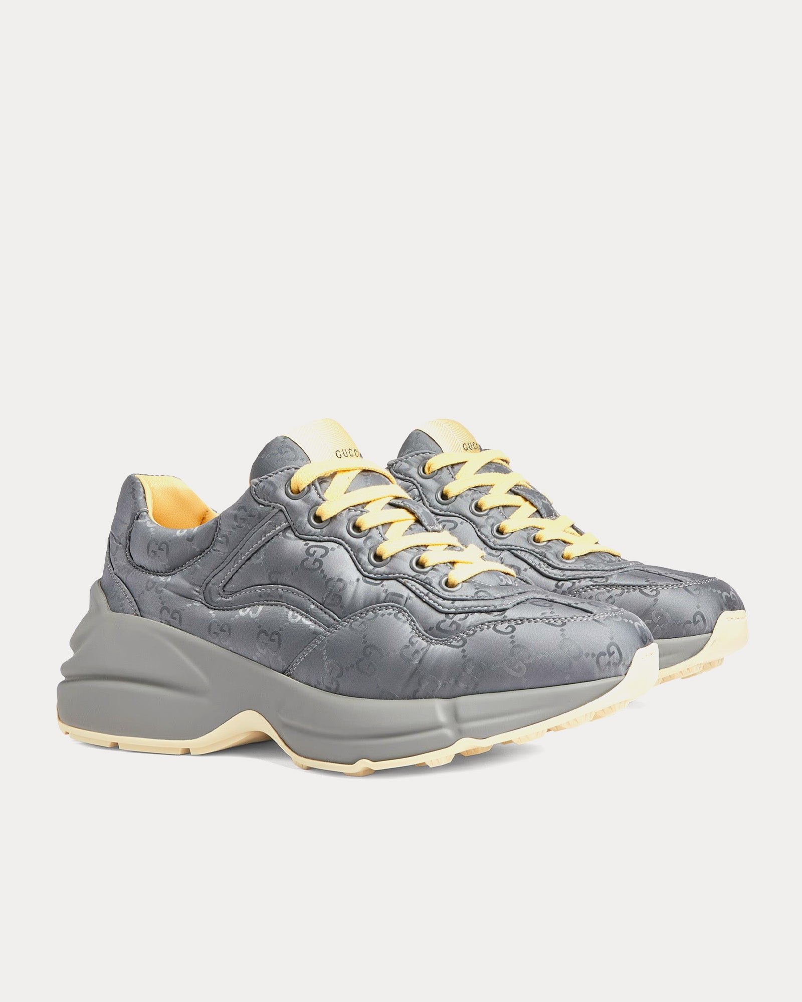 Les baskets basses pour femmes GucciRhyton en gris sont confectionnées en nylon jacquard GG rembourré et présentent une étiquette logo Gucci, des semelles en caoutchouc, des lacets contrastants et des semelles surdimensionnées avec une construction épaisse. Fabriquées en Italie.