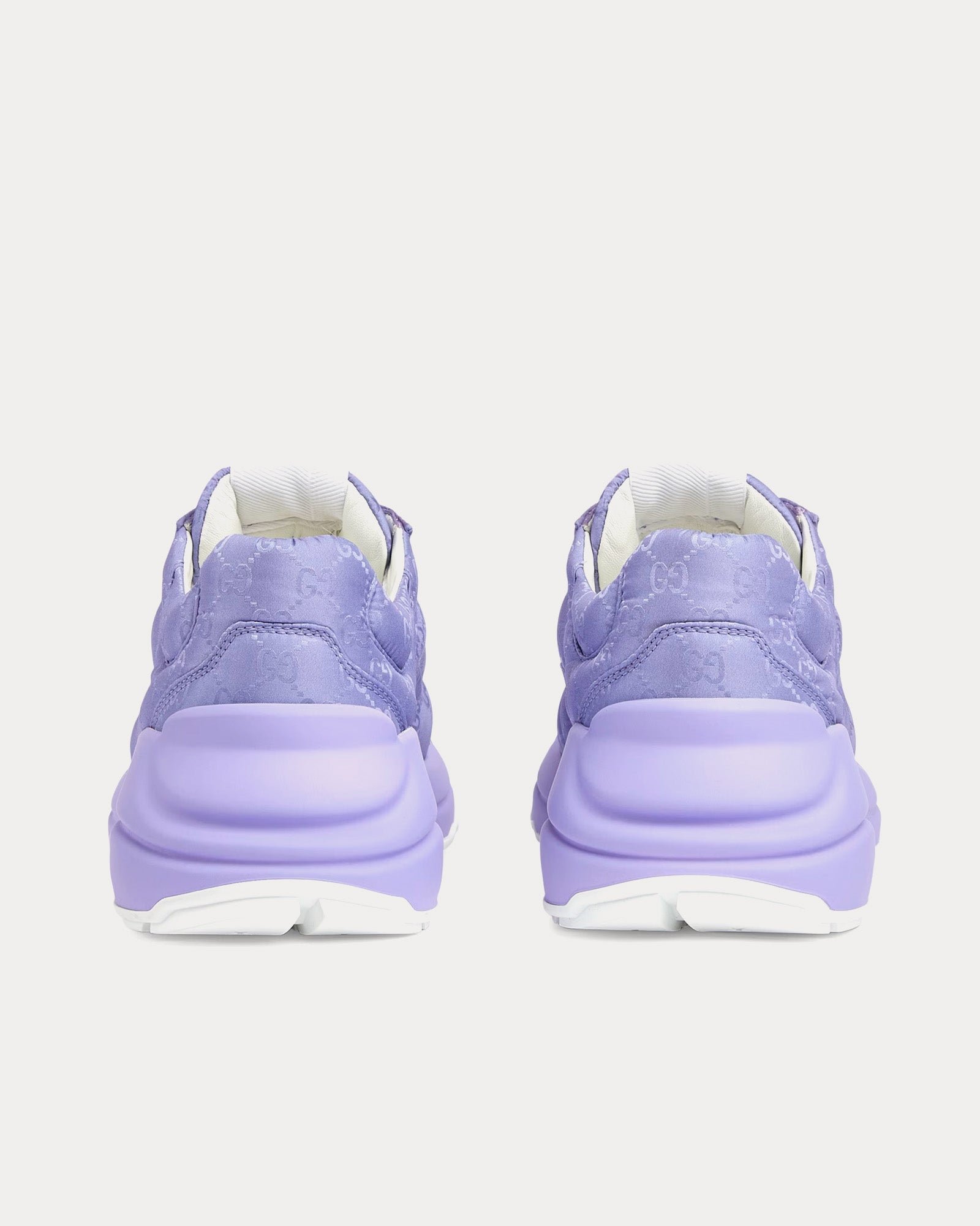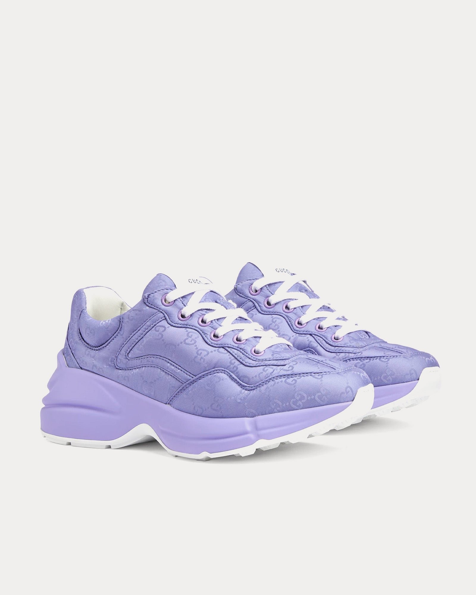 Les baskets basses pour femmes GucciRhyton en lilas sont confectionnées en nylon jacquard GG rembourré et présentent une étiquette logo Gucci, des semelles en caoutchouc, des lacets contrastants et des semelles surdimensionnées avec une construction épaisse. Fabriquées en Italie.