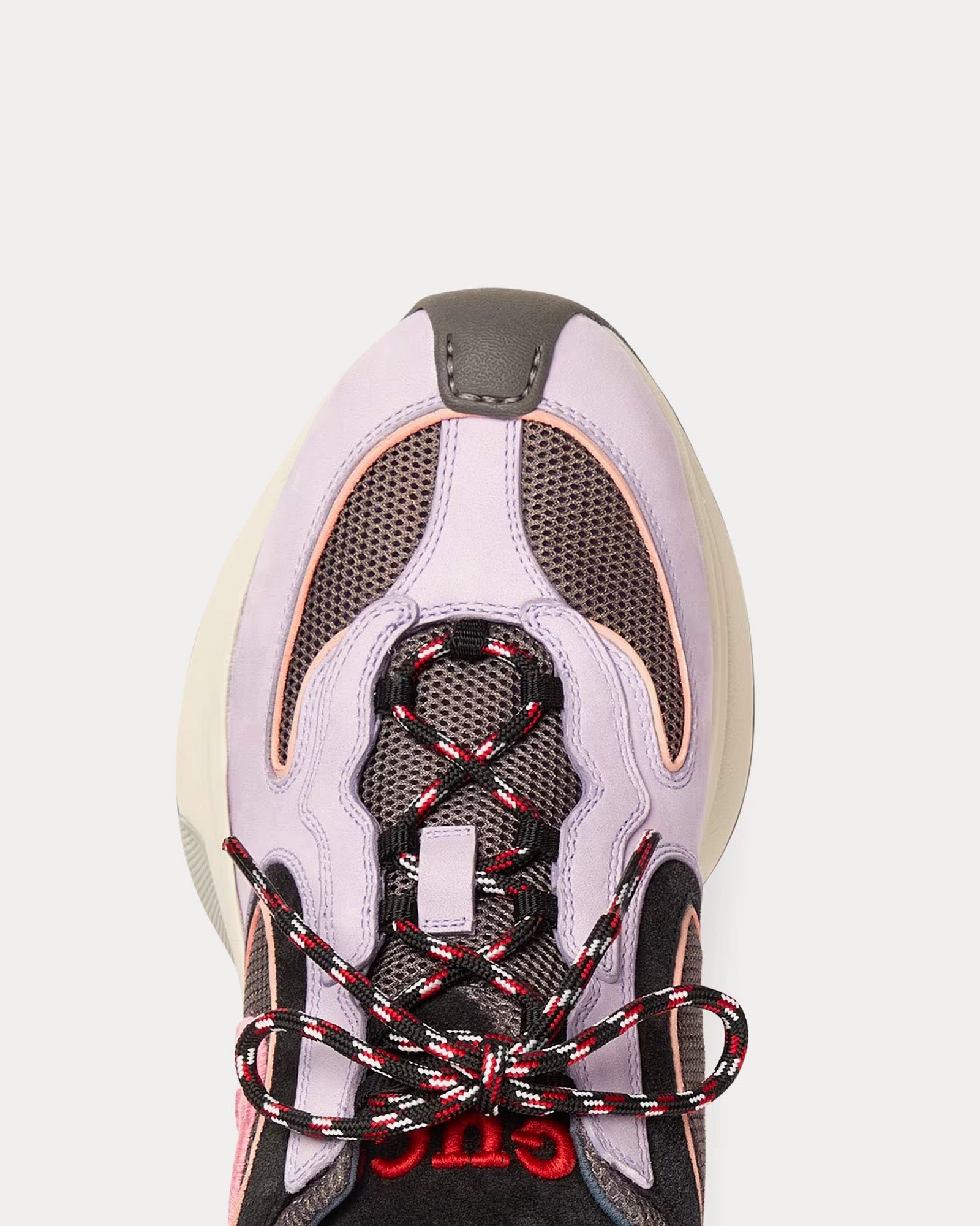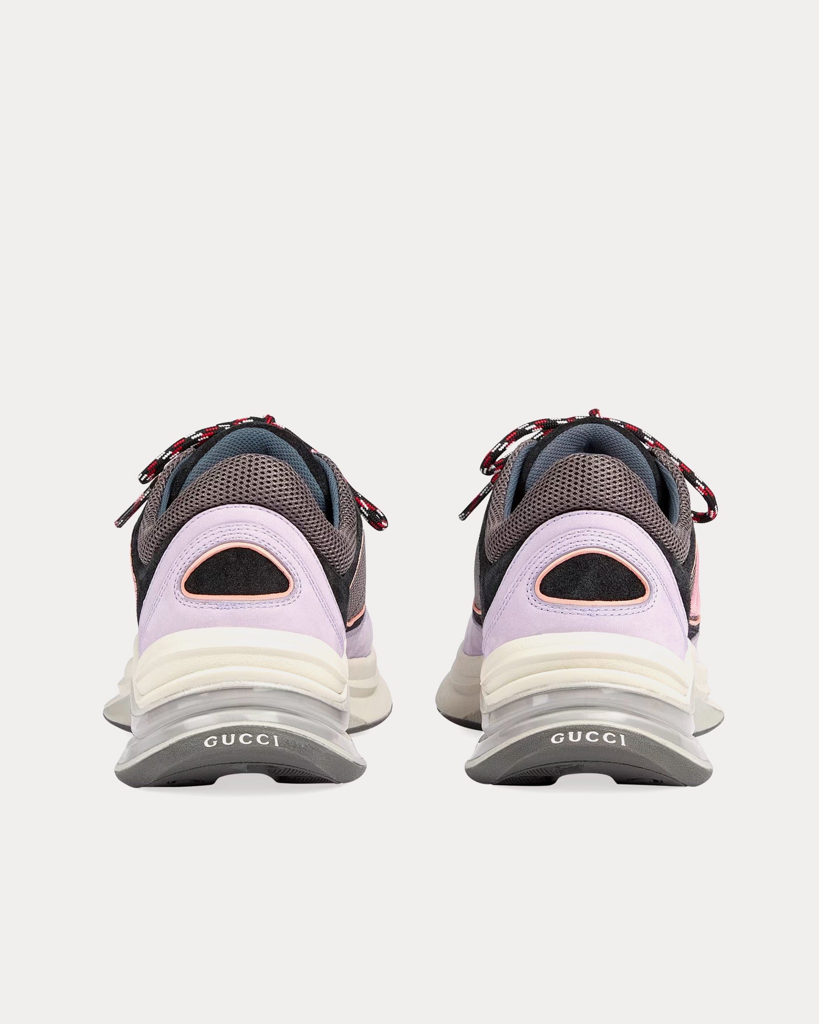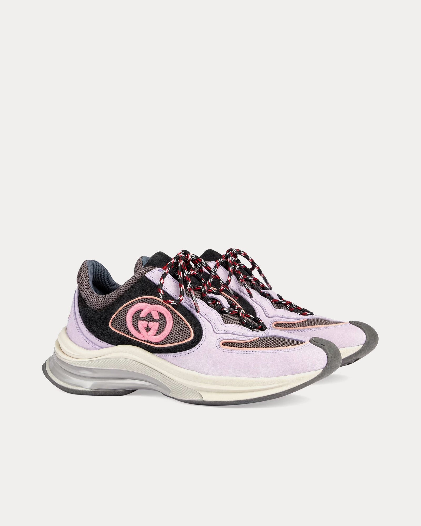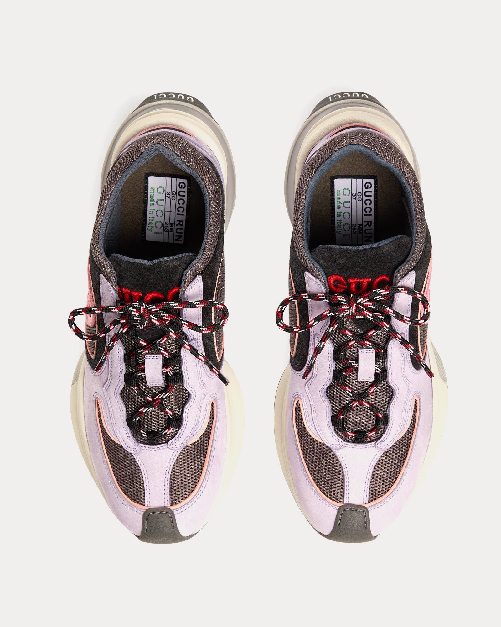 Les baskets basses pour femme GucciRun GG en lilas et noir sont confectionnées en daim et présentent des bordures en tissu perforé, l’inscription « Gucci » à l’arrière, un détail contrastant G entrelacé, une semelle en caoutchouc bicolore, une boucle à l’arrière et des lacets. Fabriquées en Italie.