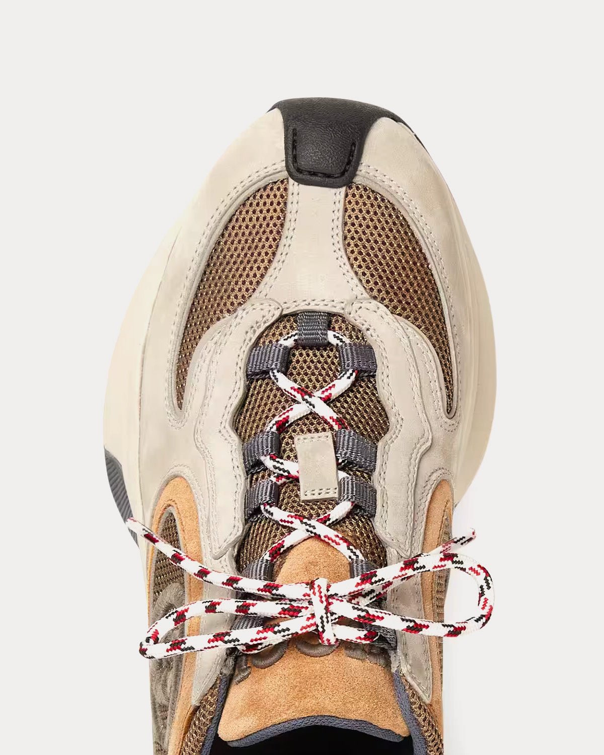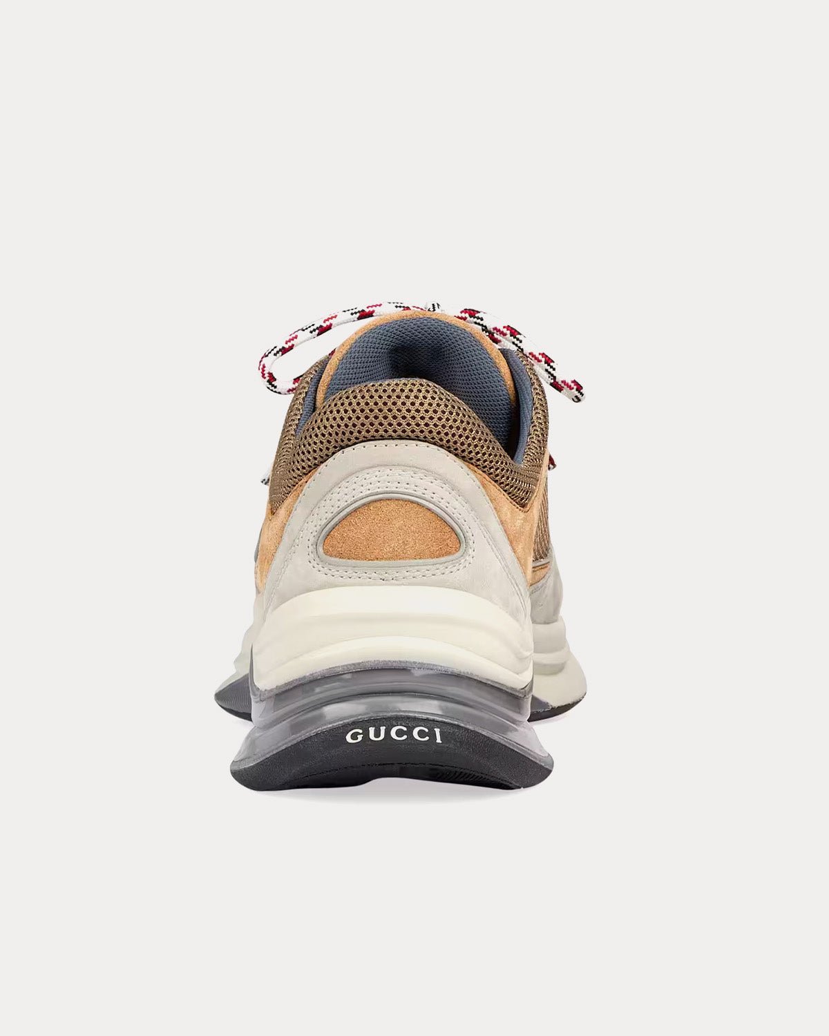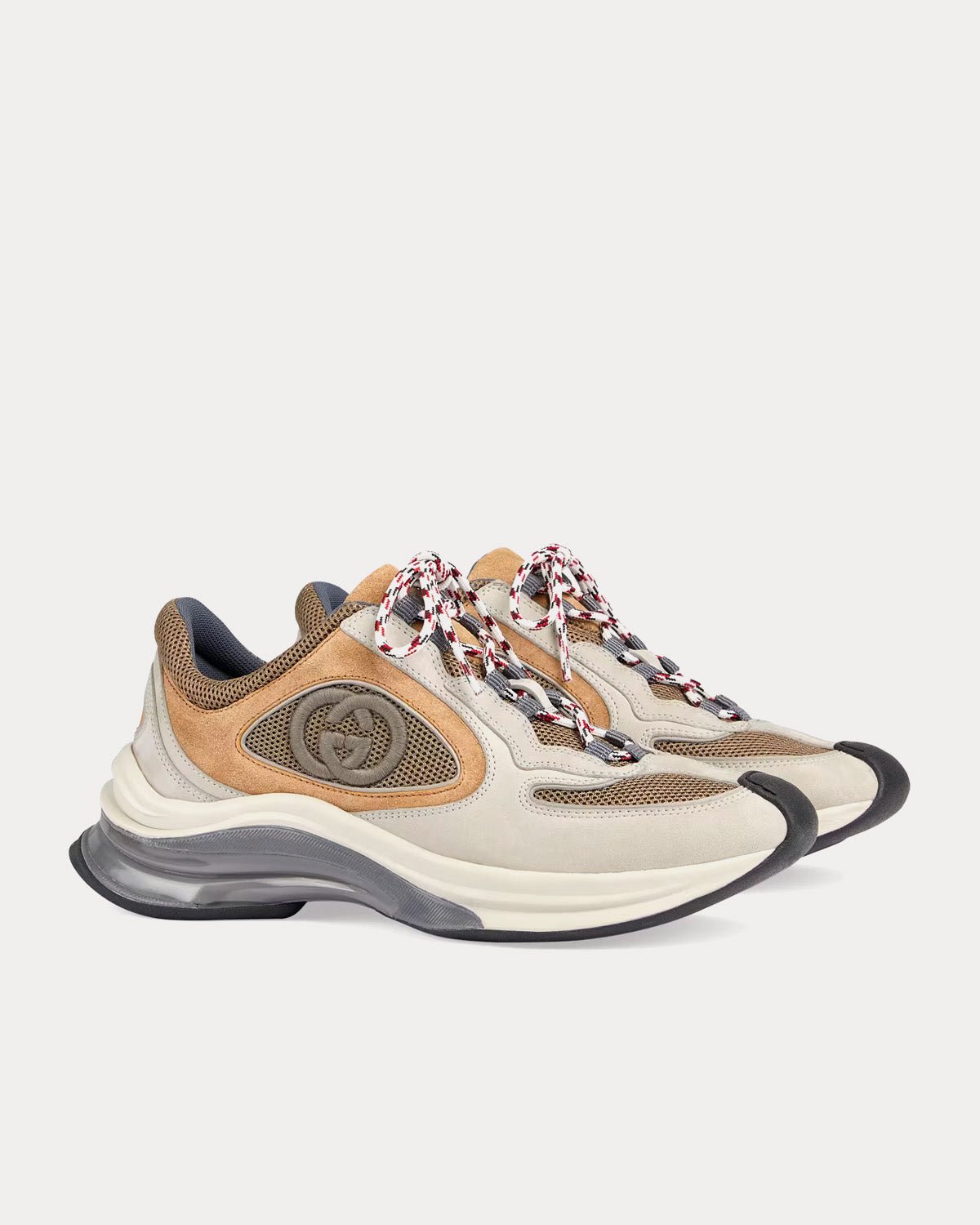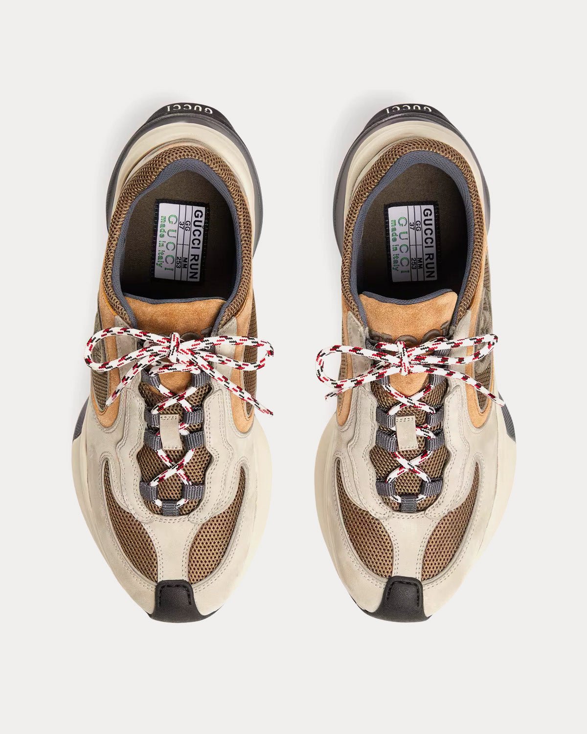 Les baskets basses Gucci Run pour femme en daim gris et bordures en daim marron clair s’inspirent des baskets sportives et arborent un G entrelacé, une semelle en caoutchouc bicolore, une fermeture à lacets et un talon bas. Fabriquées en Italie.