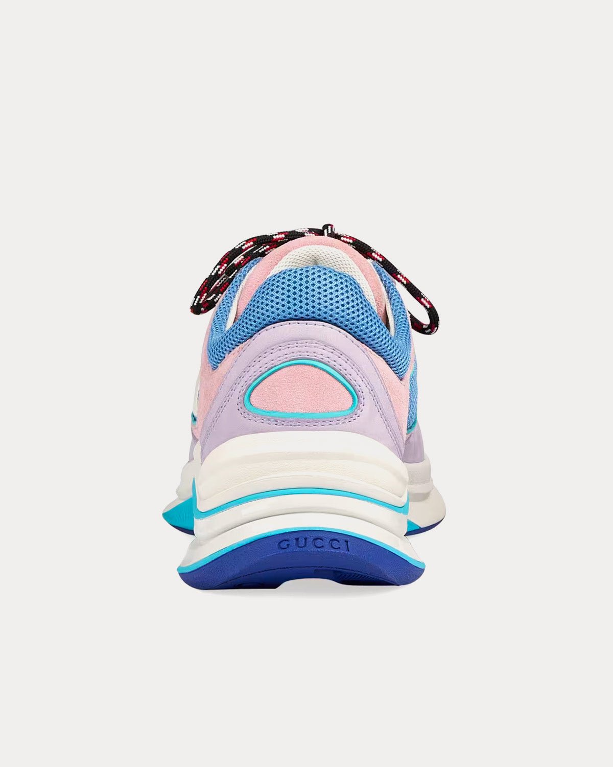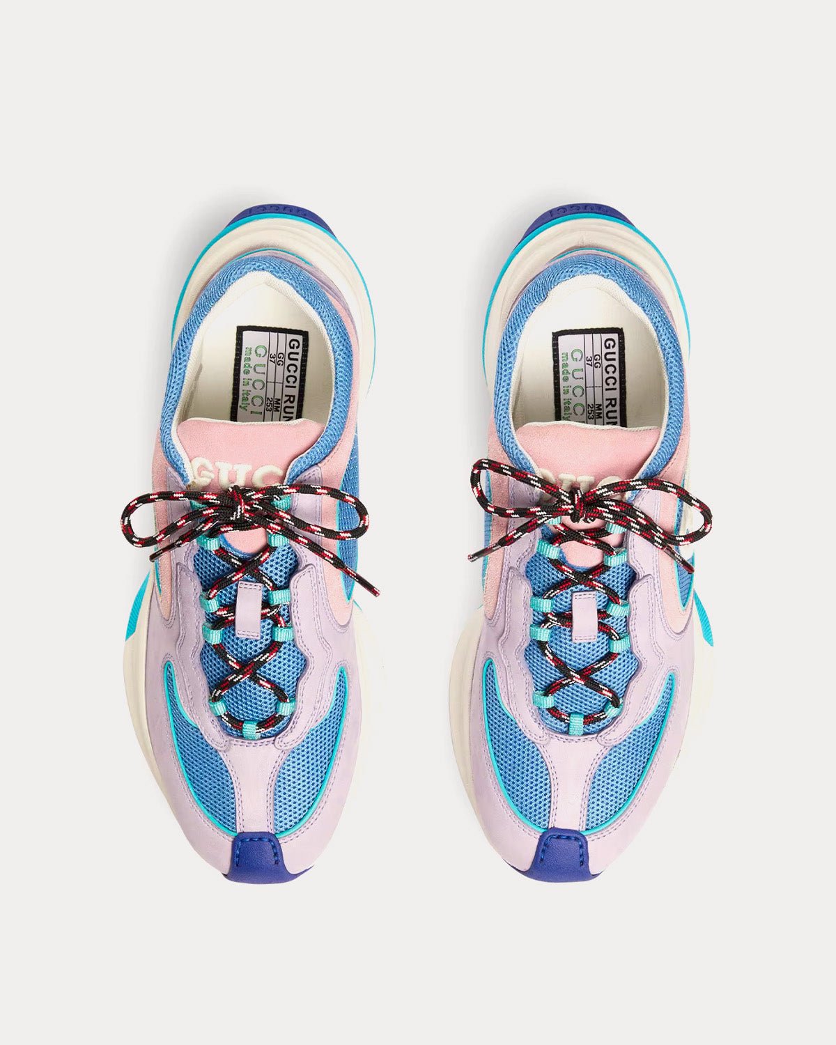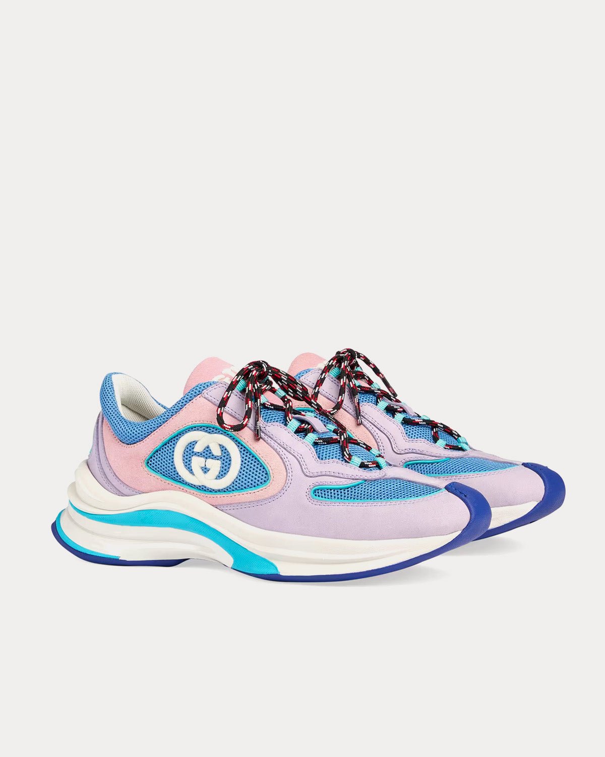 Les baskets basses Gucci Run pour femme en daim lilas et bordures en daim rose clair s’inspirent des baskets sportives et arborent un G entrelacé, une semelle en caoutchouc bicolore, une fermeture à lacets et un talon bas. Fabriquées en Italie.