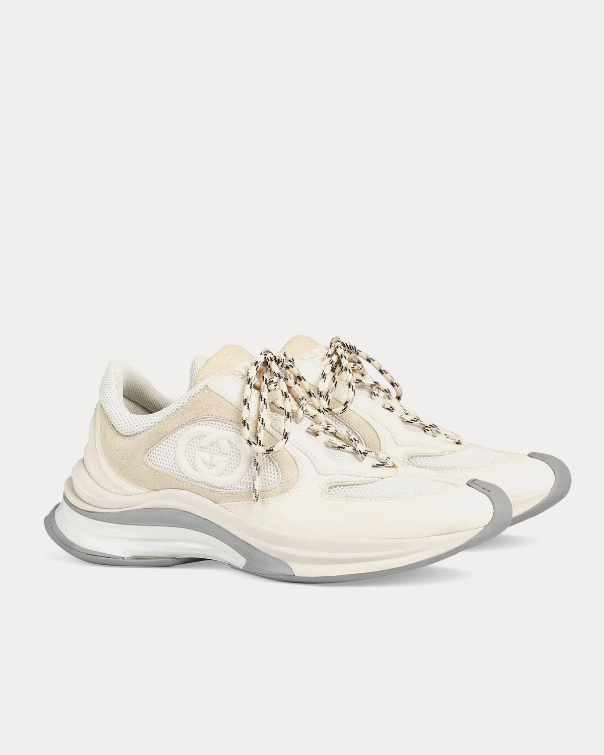Les baskets basses Gucci Run pour femme en daim blanc et bordures en daim gris blanc cassé s’inspirent des baskets sportives et arborent un G entrelacé, une semelle en caoutchouc bicolore, une fermeture à lacets et un talon bas. Fabriquées en Italie.