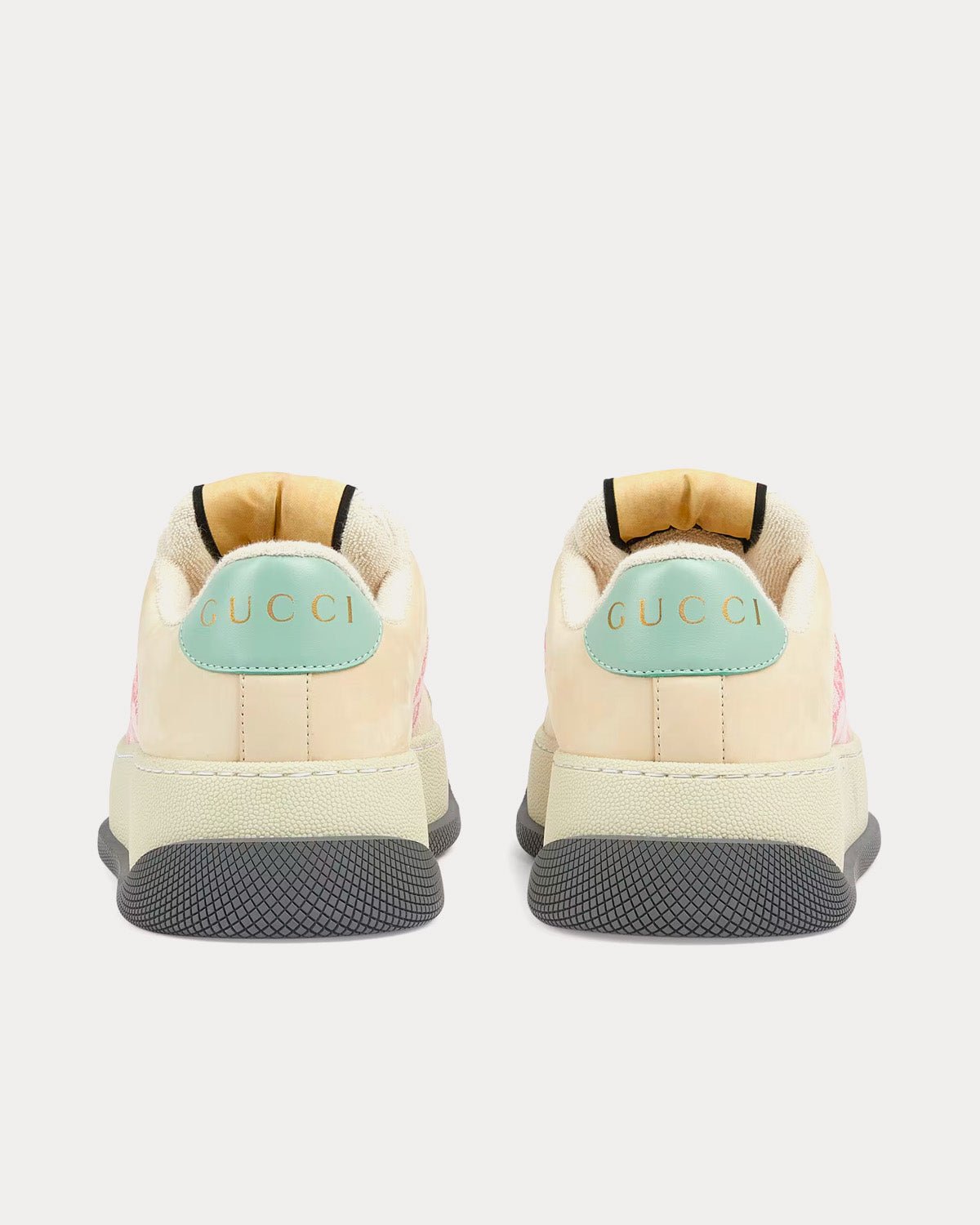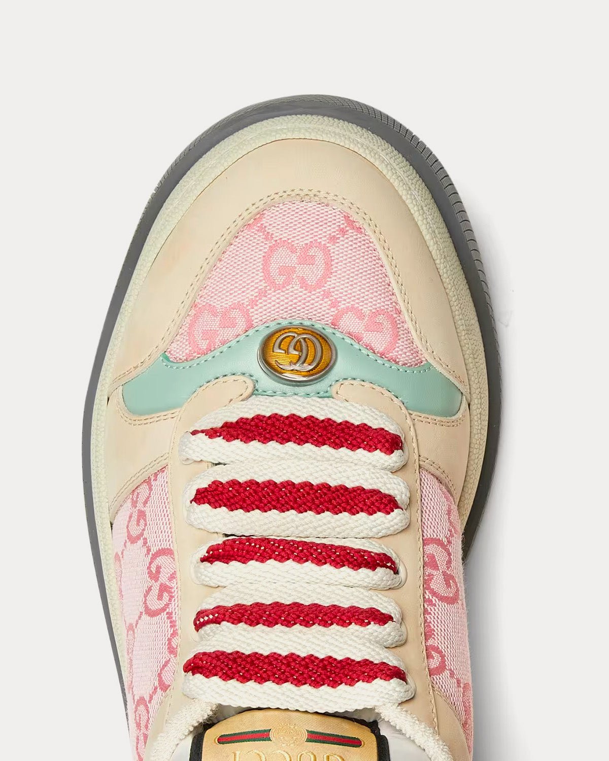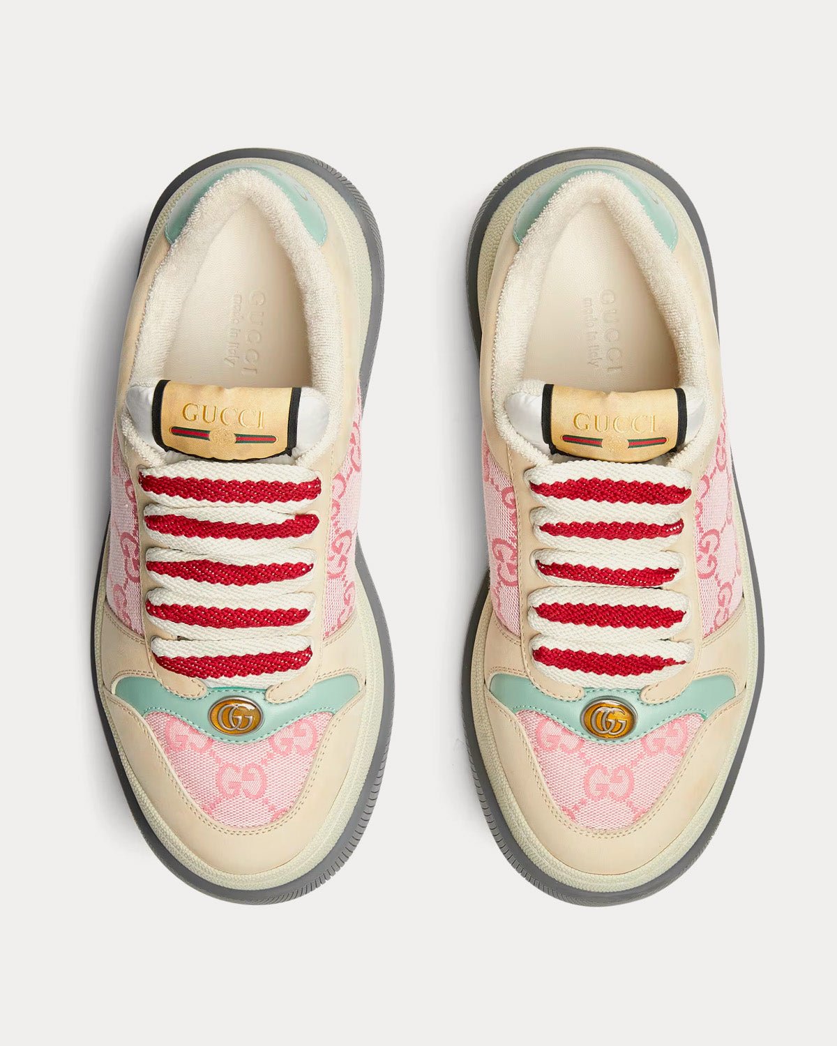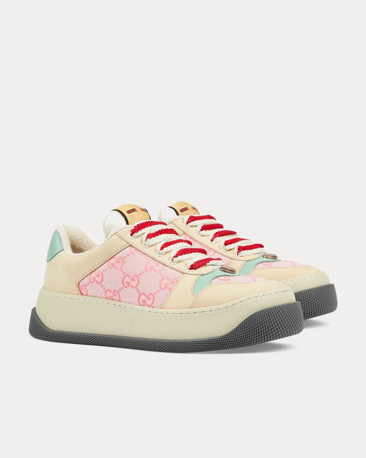 Les baskets basses pour femme GucciScreener beiges avec toile GG rose présentent une bordure en daim beige, un détail ovale émaillé avec un double G en métal, une étiquette avec le logo Gucci vintage, des semelles plates bicolores, des lacets épais et le motif GG distinctif. Fabriquées en Italie.