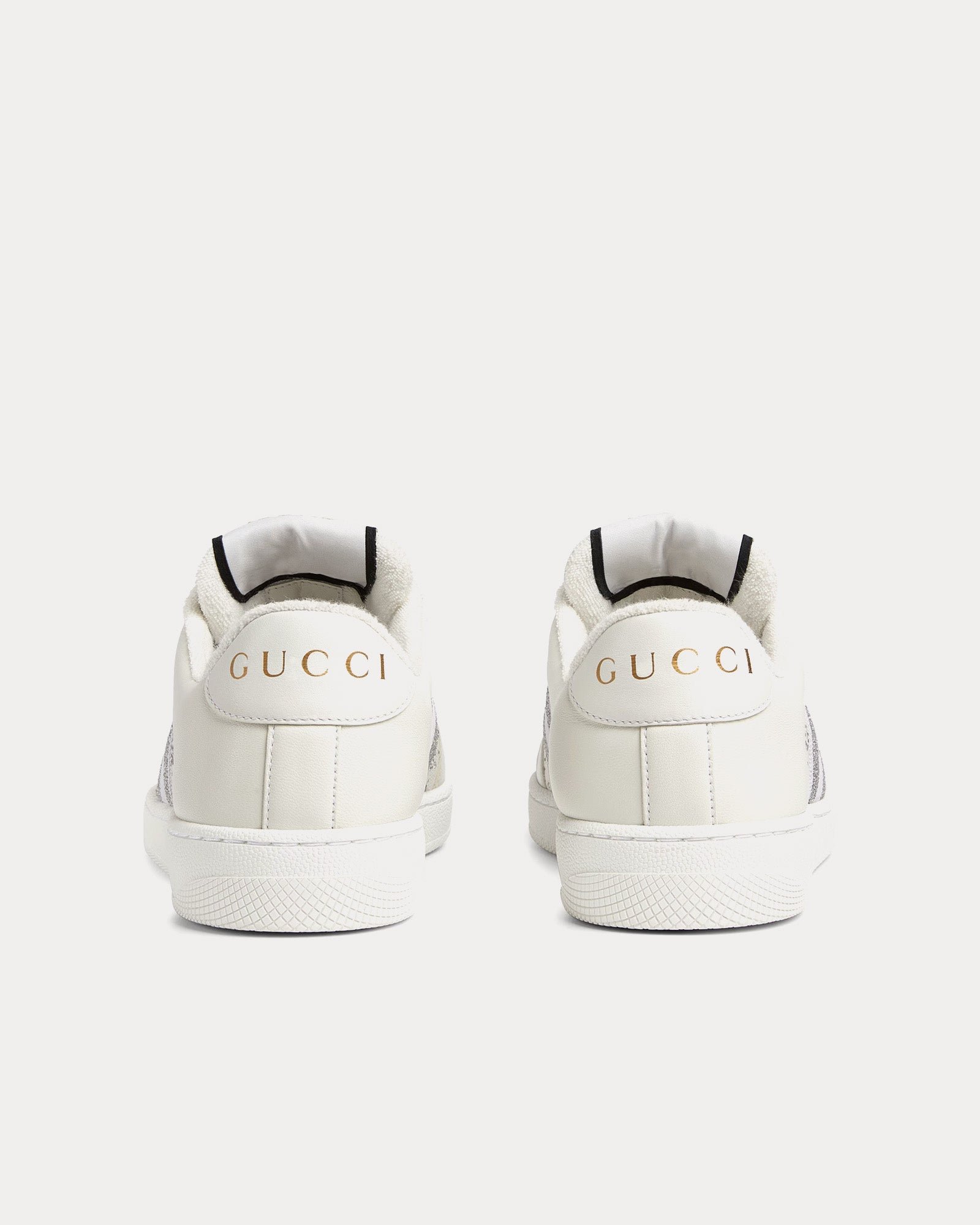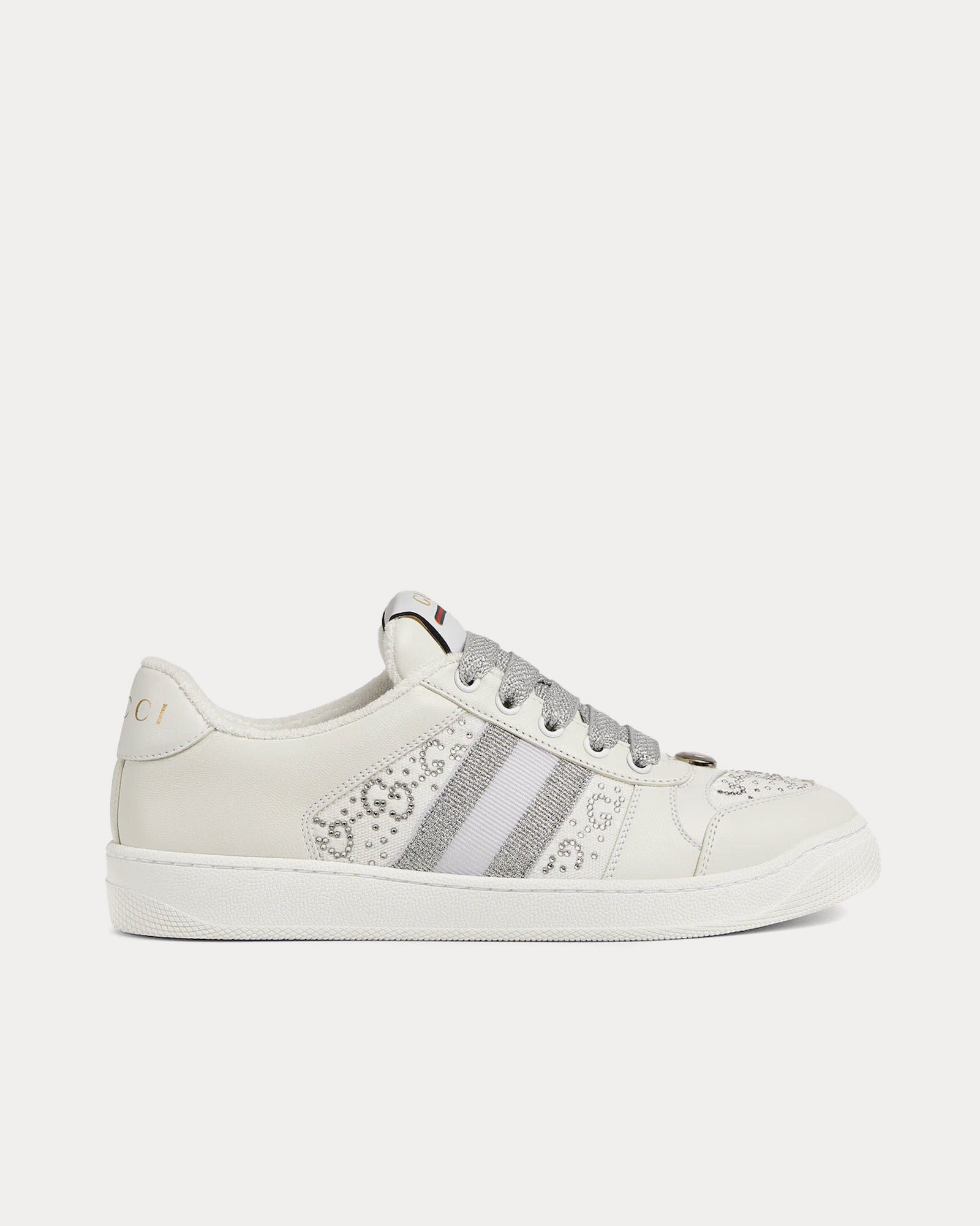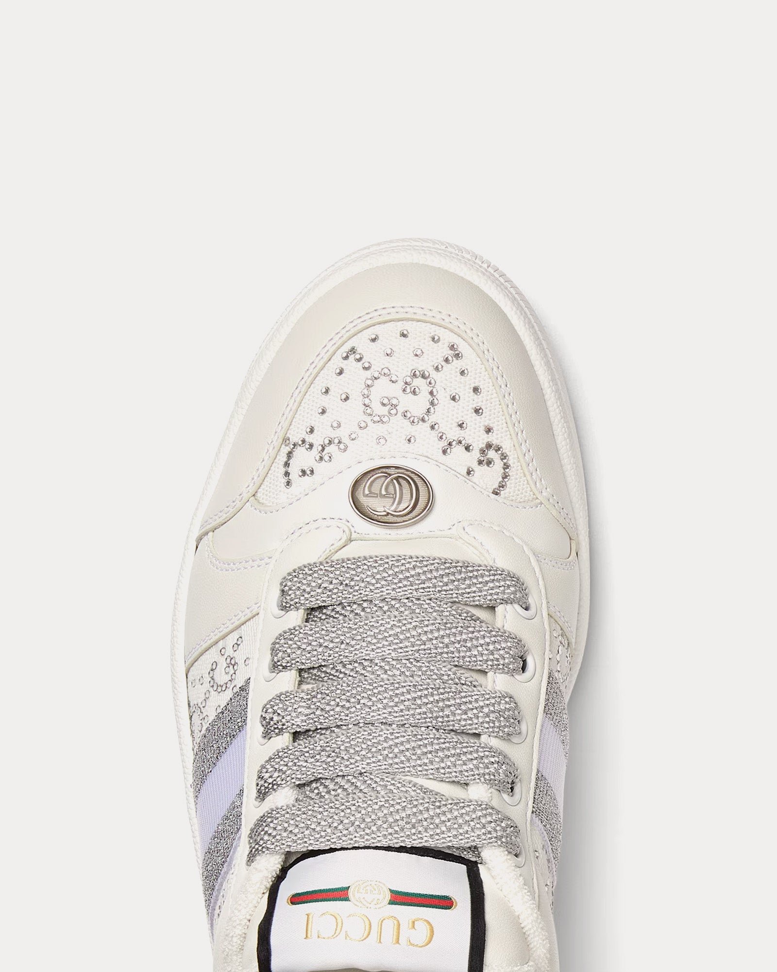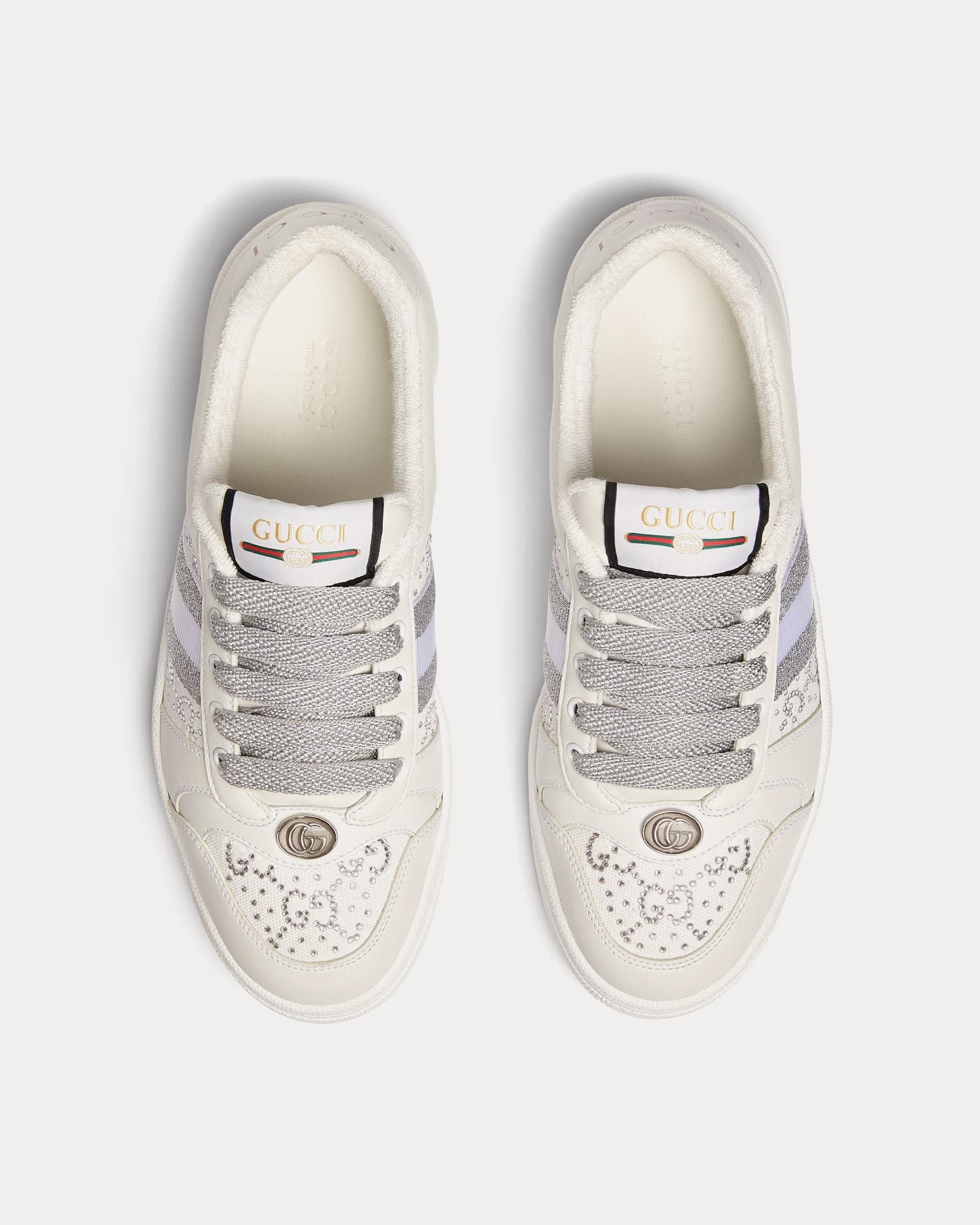 Les baskets basses pour femme Gucci Screener en gris clair et blanc s’inspirent des modèles classiques des années 1970 et présentent une toile GG originale, des cristaux multidimensionnels sur les côtés, des finitions en cuir, des détails ovales émaillés avec un double G en métal, une étiquette logo Gucci vintage et des semelles en caoutchouc. Fabriquées en Italie.