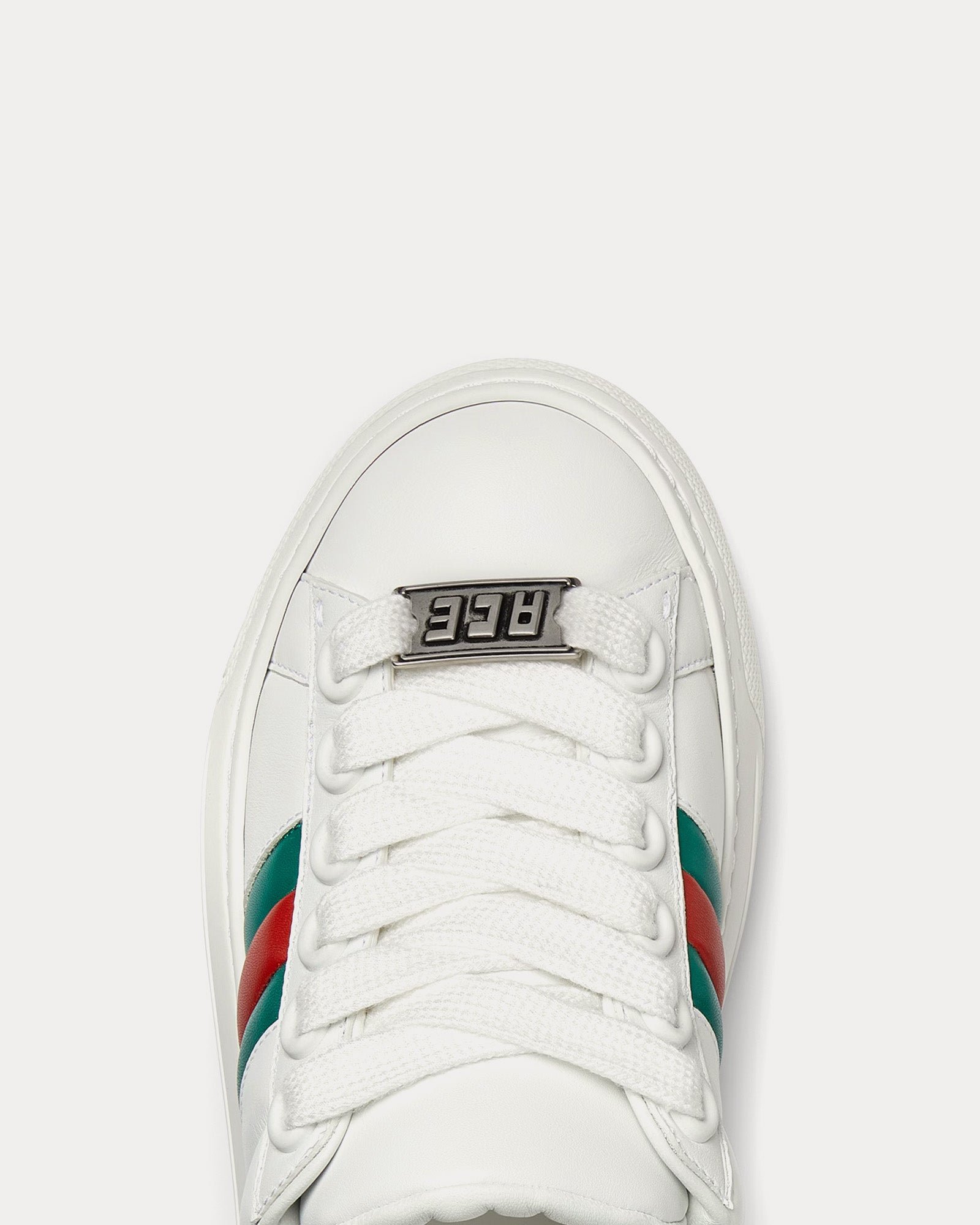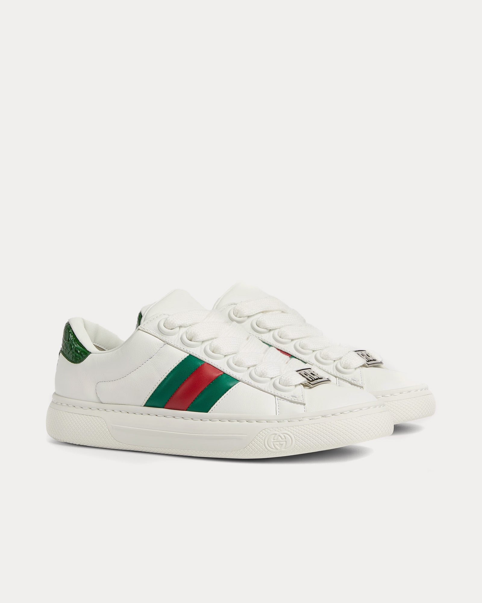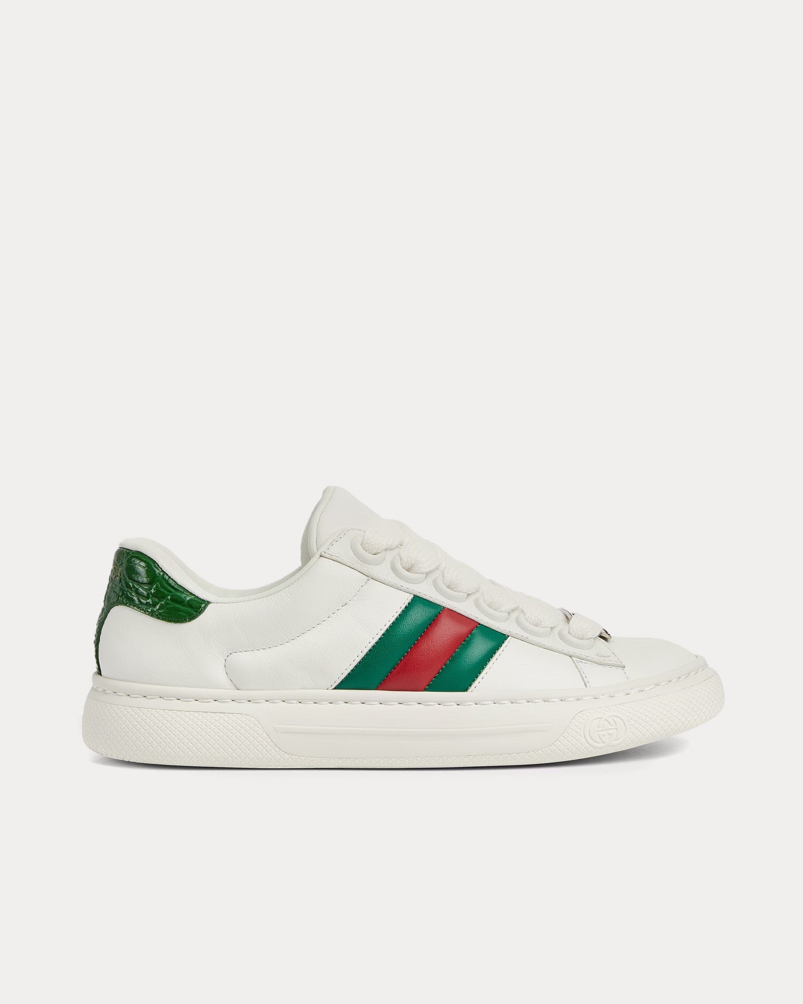 Les baskets basses Gucci Screener pour femme de couleur blanche sont inspirées des modèles classiques des années 1970 et présentent une tige en cuir léger au design plus épais, une bande Web verte et rouge, une grande étiquette métallique « ACE », des semelles en caoutchouc et des lacets épais. Fabriquées en Italie.