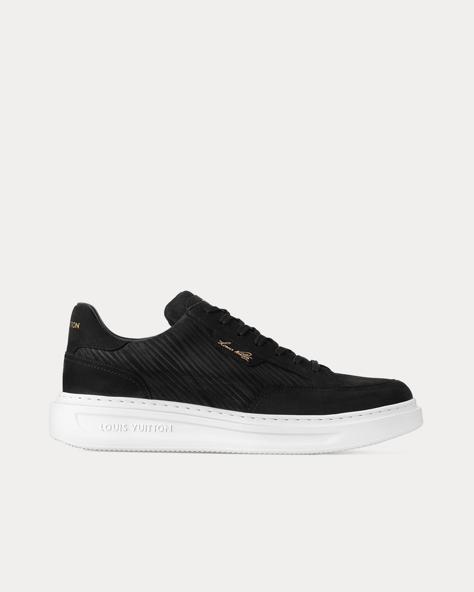 Les baskets basses pour hommes Louis Vuitton Beverly Hills en noir sont fabriquées en cuir nubuck Epi XL et disposent d’une semelle extérieure en caoutchouc épaisse mais extrêmement légère, d’une tige formelle, d’une semelle intérieure rembourrée et d’une doublure technique offrant un confort et une souplesse accrus, ainsi que de la signature Louis Vuitton sur la languette, le côté, l’arrière et la semelle extérieure. Fabriquées en Italie.