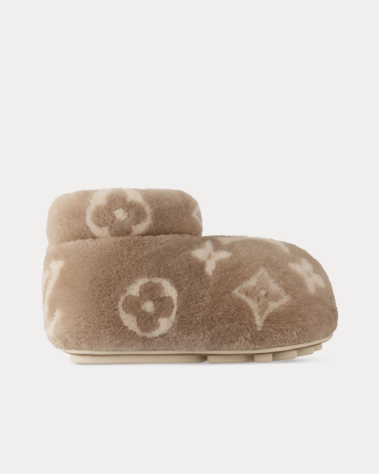 Les bottes Louis Vuitton LV Footprint Low pour homme en beige sont confectionnées en peau lainée douce et confortable, imprimée d’un motif Monogram surdimensionné, de semelles extérieures en caoutchouc avec empreinte de patte d’ours et d’initiales LV et de fleurs Monogram sur la semelle.