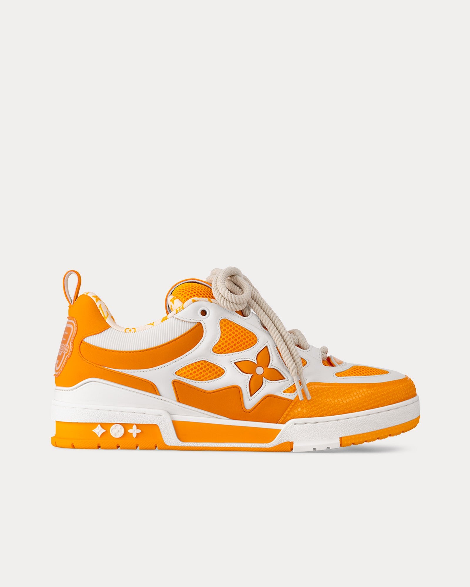 Les baskets basses pour hommes Louis Vuitton LV Skate en jaune sont fabriquées en cuir de veau grainé et arborent le logo « Vuitton since 54 » sur la languette et l’arrière, des fleurs Monogram sur le côté et la semelle extérieure, et une boucle arrière LV Initials. Fabriquées en Italie.
