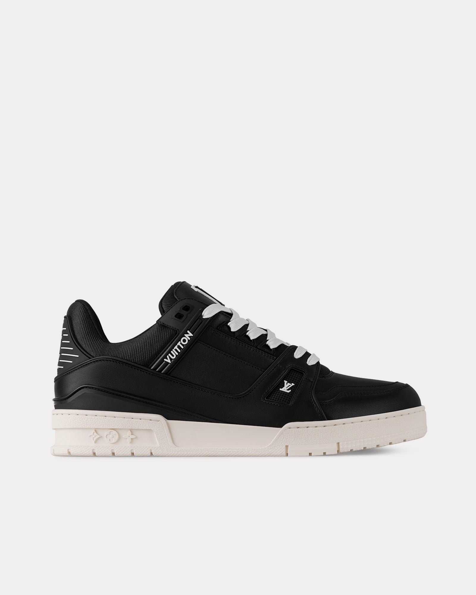 Les baskets basses Louis VuittonLV Trainer pour homme en noir sont confectionnées en cuir de veau mat et arborent une tige ornée d’un monogramme en relief, les initiales LV sur la languette et les côtés, la signature Louis Vuitton sur les côtés, la signature #54 à l’arrière et des fleurs Monogram sur la semelle extérieure. Fabriquées en Italie.