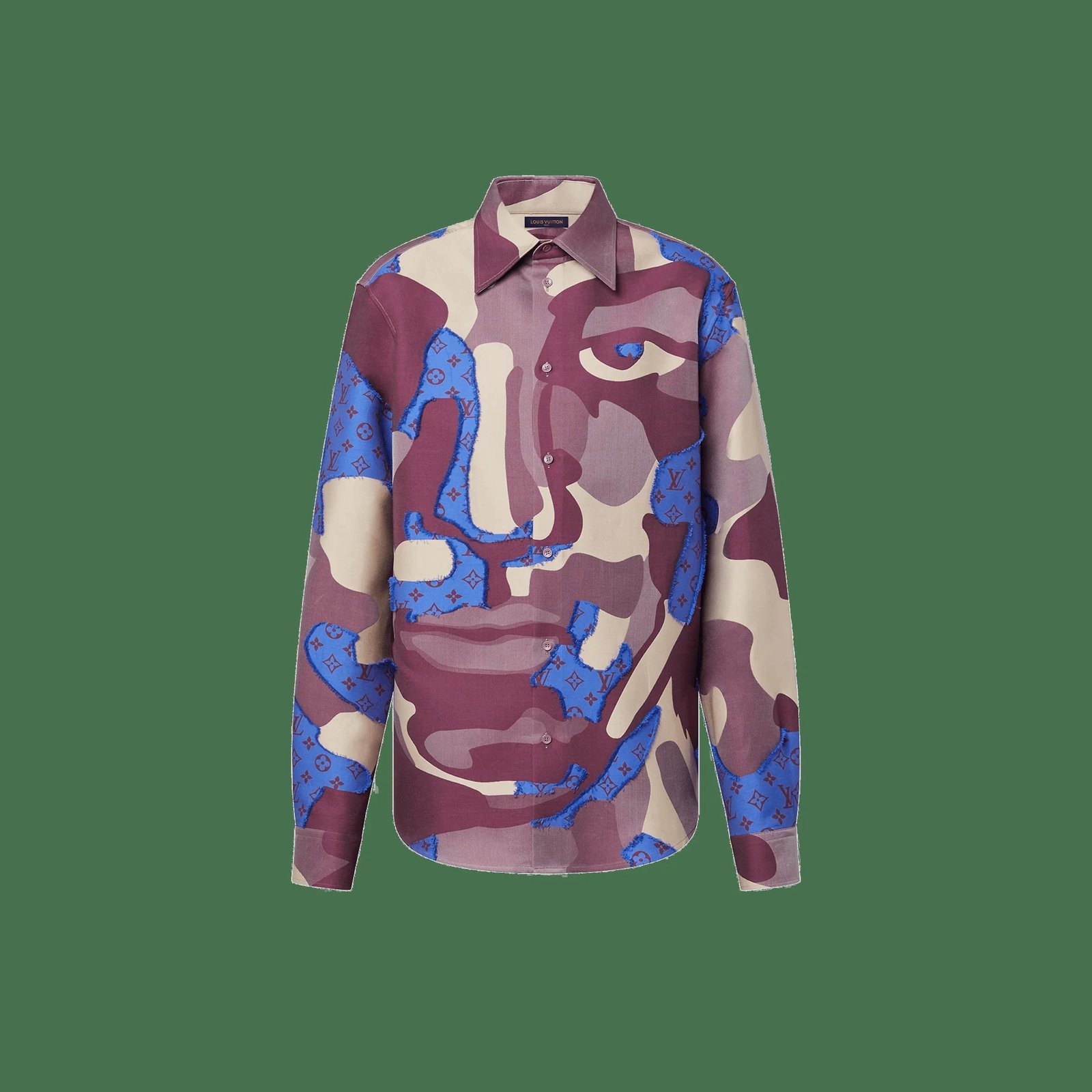 Cette surchemise en coton présente le portrait en patchwork du défilé automne-hiver 2023. Elle présente un motif graphique imprimé et tissé, avec le portrait camouflé représenté dans des tons rouge foncé et indigo sur une base jacquard Monogram avec un fil coupé plumeux. Ce vêtement apporte une touche sophistiquée à un look décontracté.