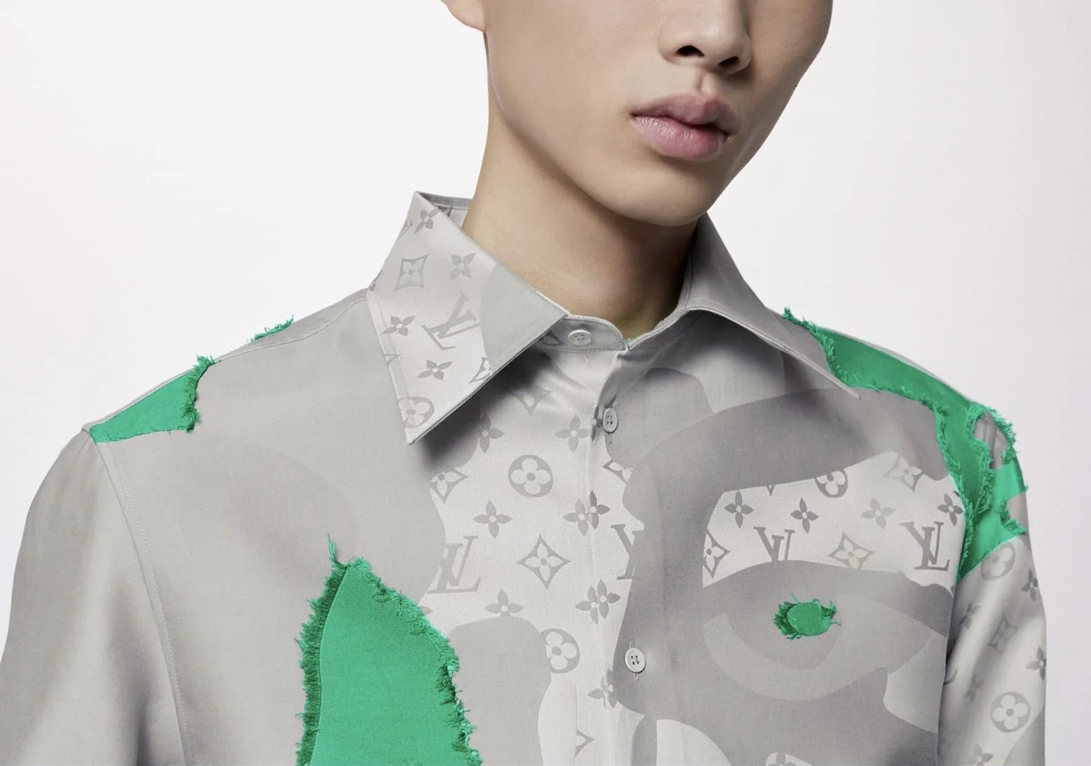 Cette surchemise en coton arbore le portrait en patchwork du défilé automne-hiver 2023. Elle présente un motif graphique imprimé et tissé avec le portrait camouflé représenté dans des tons verts vifs et gris argenté sur une base jacquard Monogram avec un fil coupé plume. Cette pièce apporte une touche sophistiquée à un look décontracté.