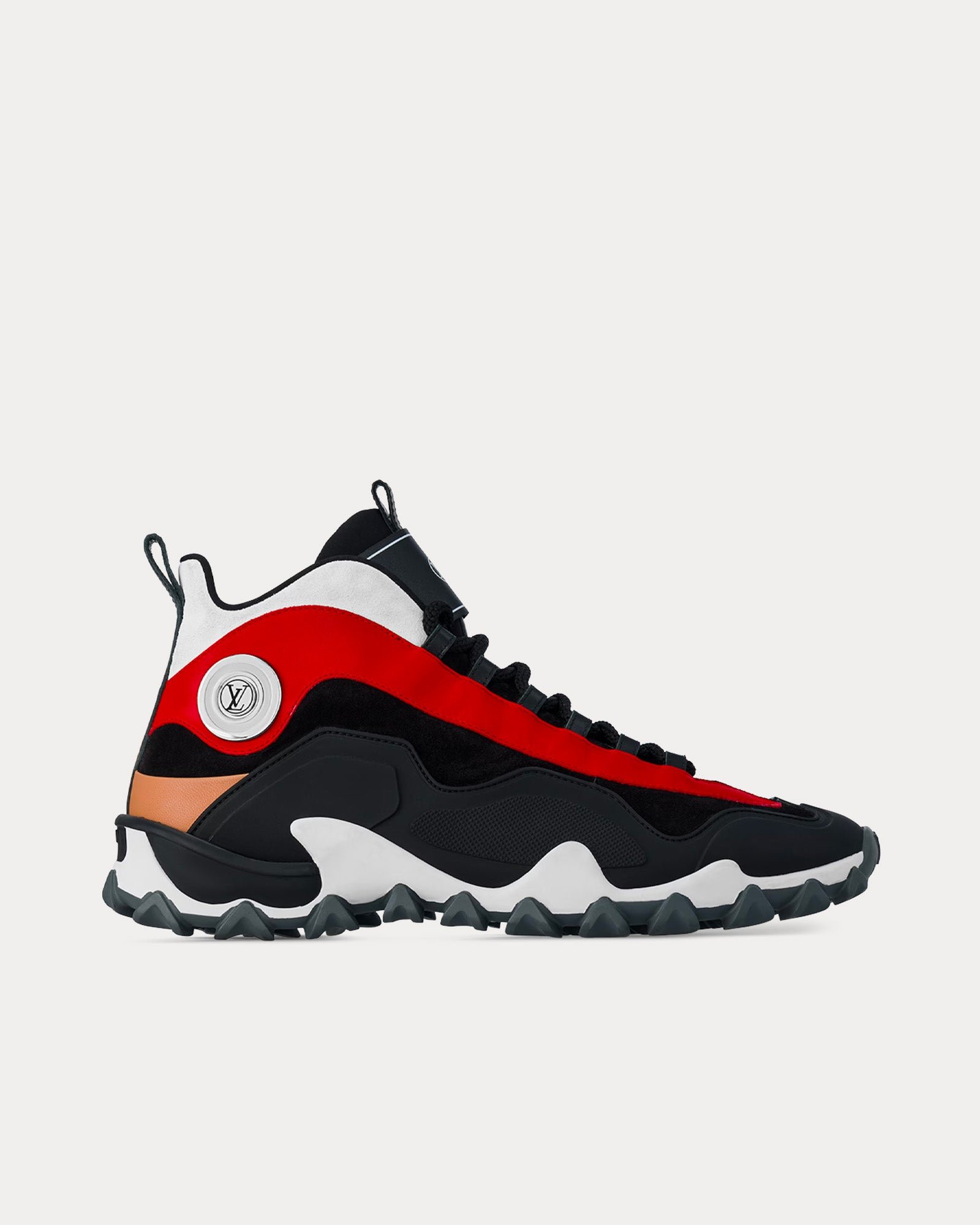 Les baskets montantes pour femmes Louis Vuitton LV Rush en noir et rouge sont inspirées des chaussures de boxe vintage et présentent des tiges en daim, en cuir de veau uni et caoutchouté, une semelle extérieure extrêmement flexible avec un design ondulé distinctif et un accessoire LV Circle en métal. Fabriquées en Italie.