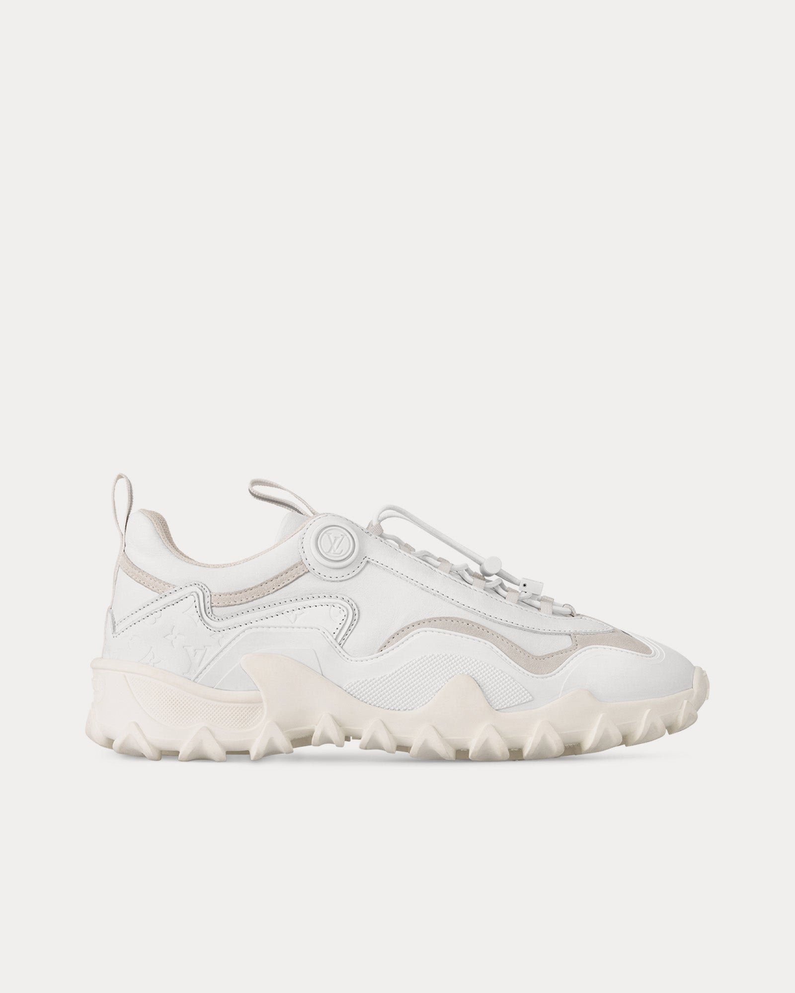 Les baskets basses Louis VuittonLV Rush pour femme en blanc sont confectionnées en daim et cuir de veau caoutchouté et arborent un design de chaussures de boxe vintage signé Nicolas Ghesquière, directeur artistique, un écusson LV Circle sur la languette, les initiales LV et la fleur Monogram sur les semelles, des semelles extérieures en caoutchouc à motif ondulé et un accessoire LV Circle. Fabriquées en Italie.