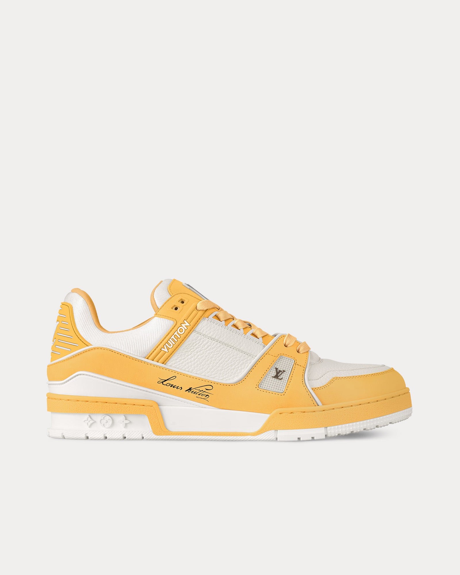 Les baskets basses Louis Vuitton LV Trainers pour femme en jaune sont confectionnées en nubuck et cuir de veau grainé et arborent les initiales LV sur la languette, les côtés et l’arrière, des lacets dégradés, des semelles extérieures en caoutchouc, la signature Louis Vuitton sur les côtés, la signature Louis Vuitton sur les côtés et des fleurs Monogram sur les semelles extérieures. Fabriquées en Italie.