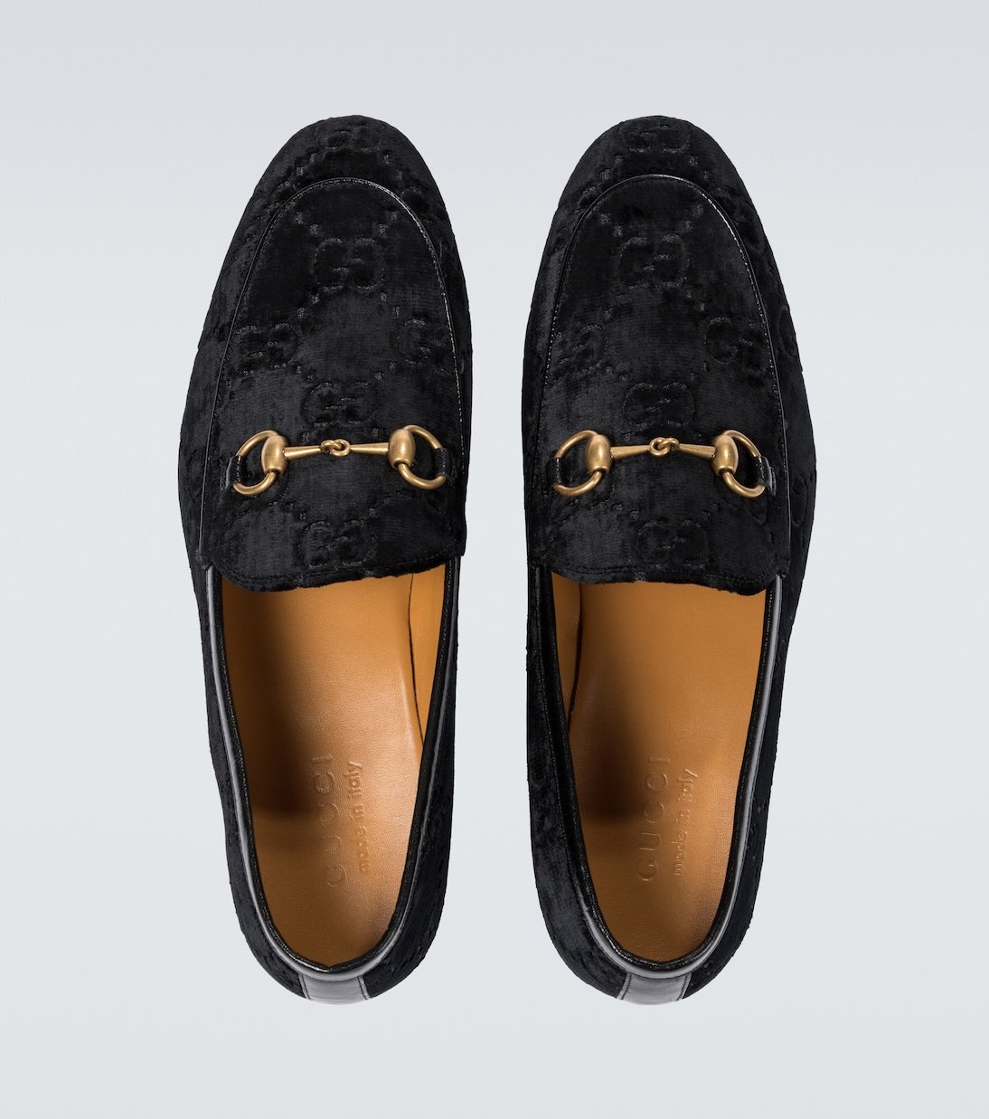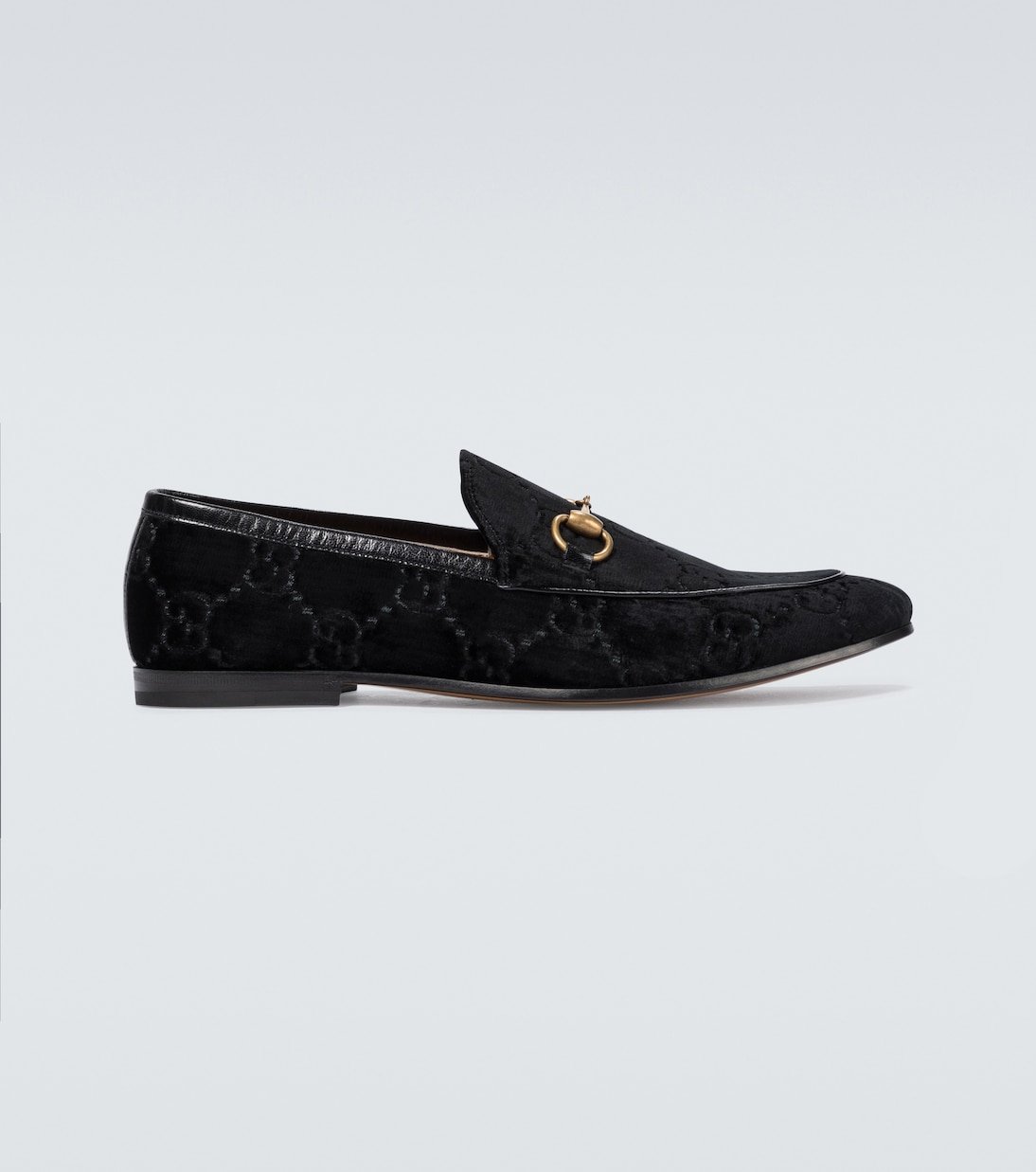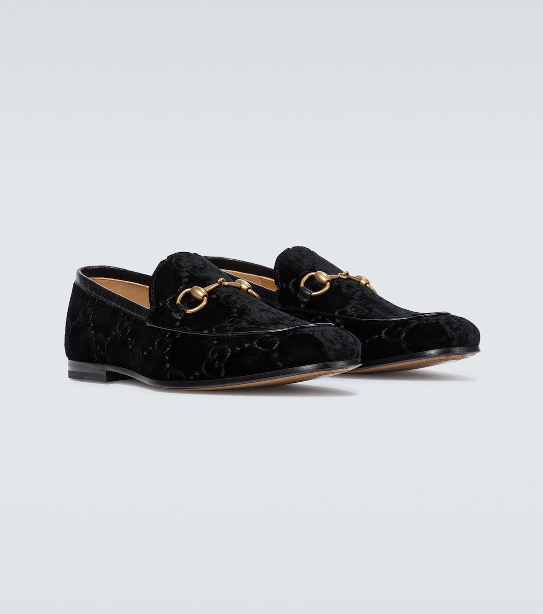 Fabriquées en velours noir orné d’un motif GG, ces mocassins de Gucci arborent un Horsebit en métal doré sur la tige.