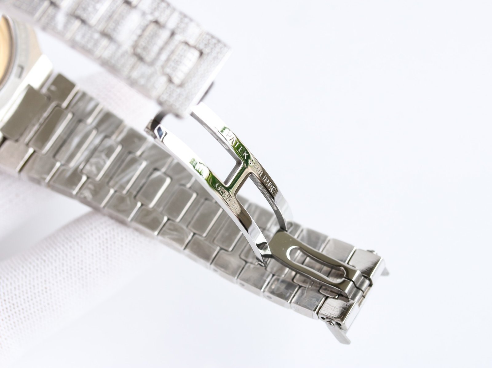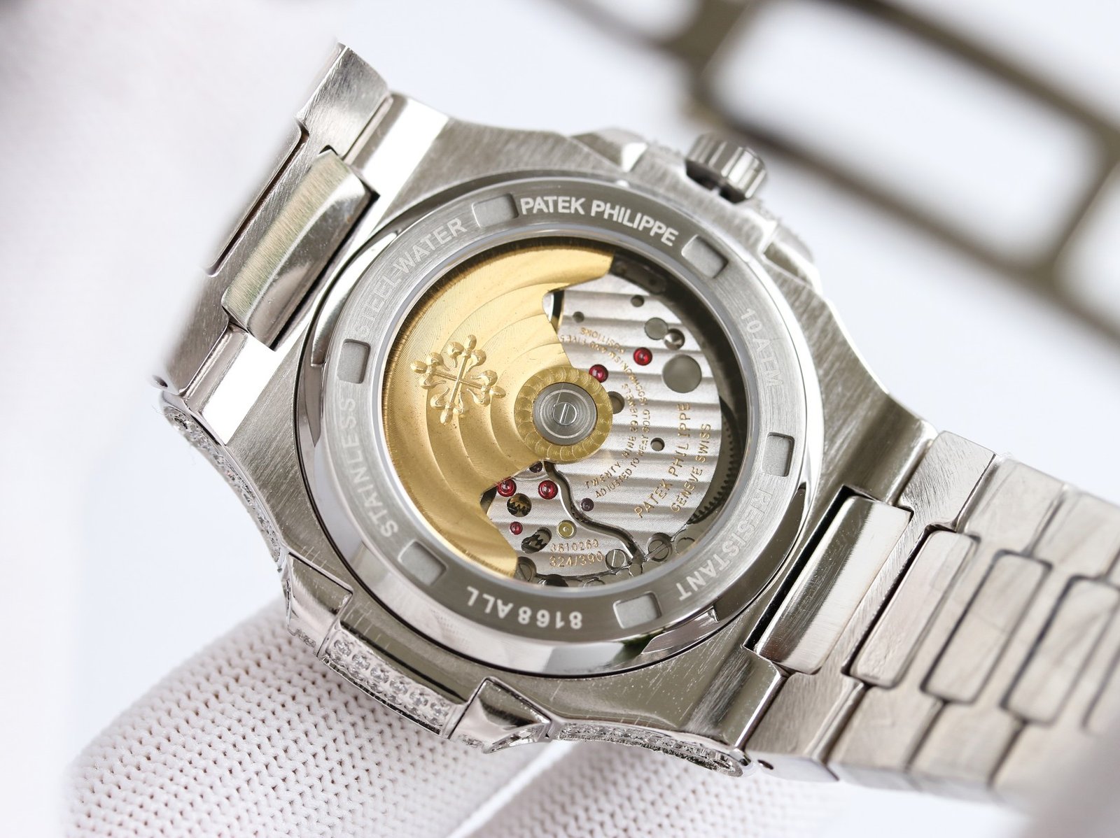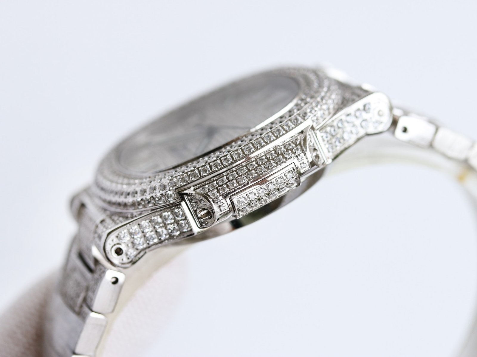 Chaque détail de cette pièce incarne le luxe : de la lunette minutieusement pavée à la signature Patek Philippe Genève gravée avec précision. Les aiguilles et index argentés assurent une lisibilité parfaite, et le mouvement automatique garantit une précision horlogère remarquable.