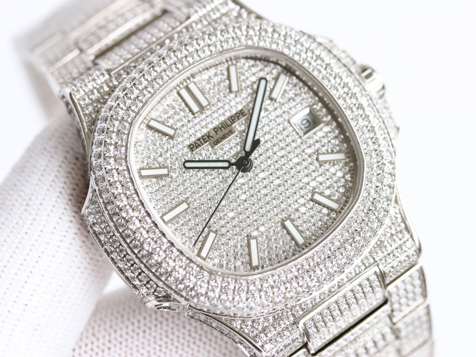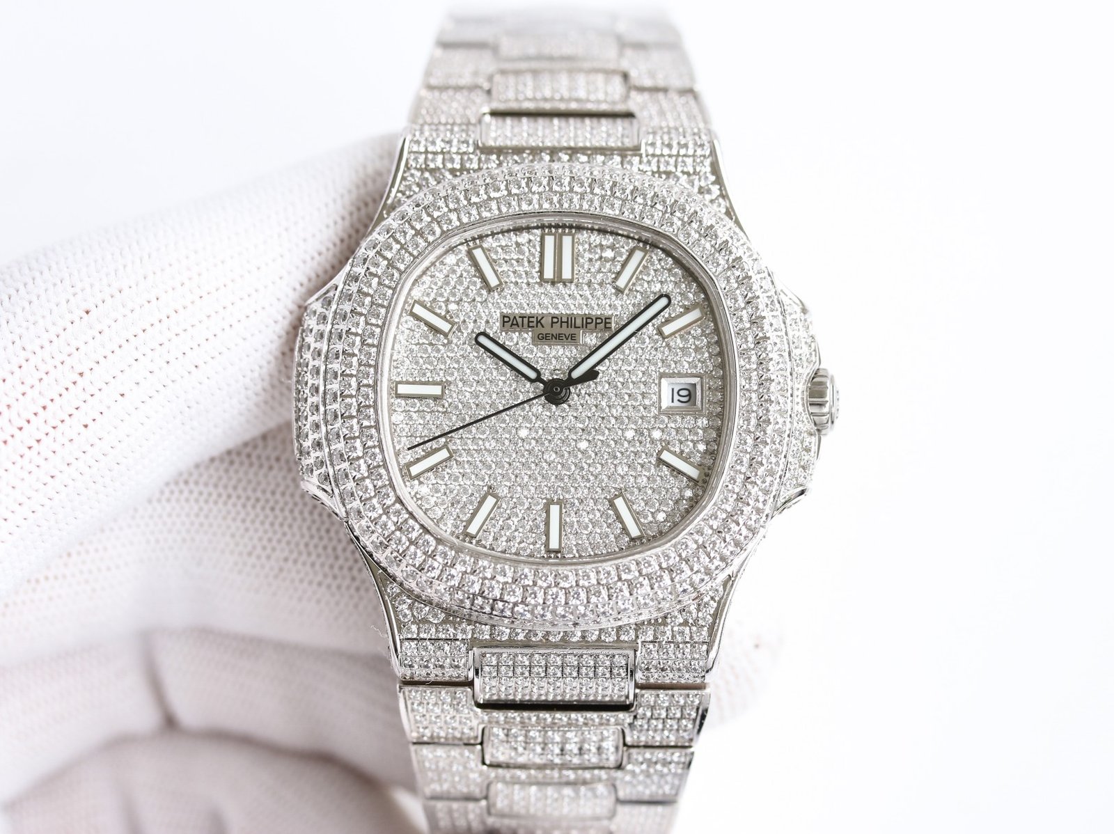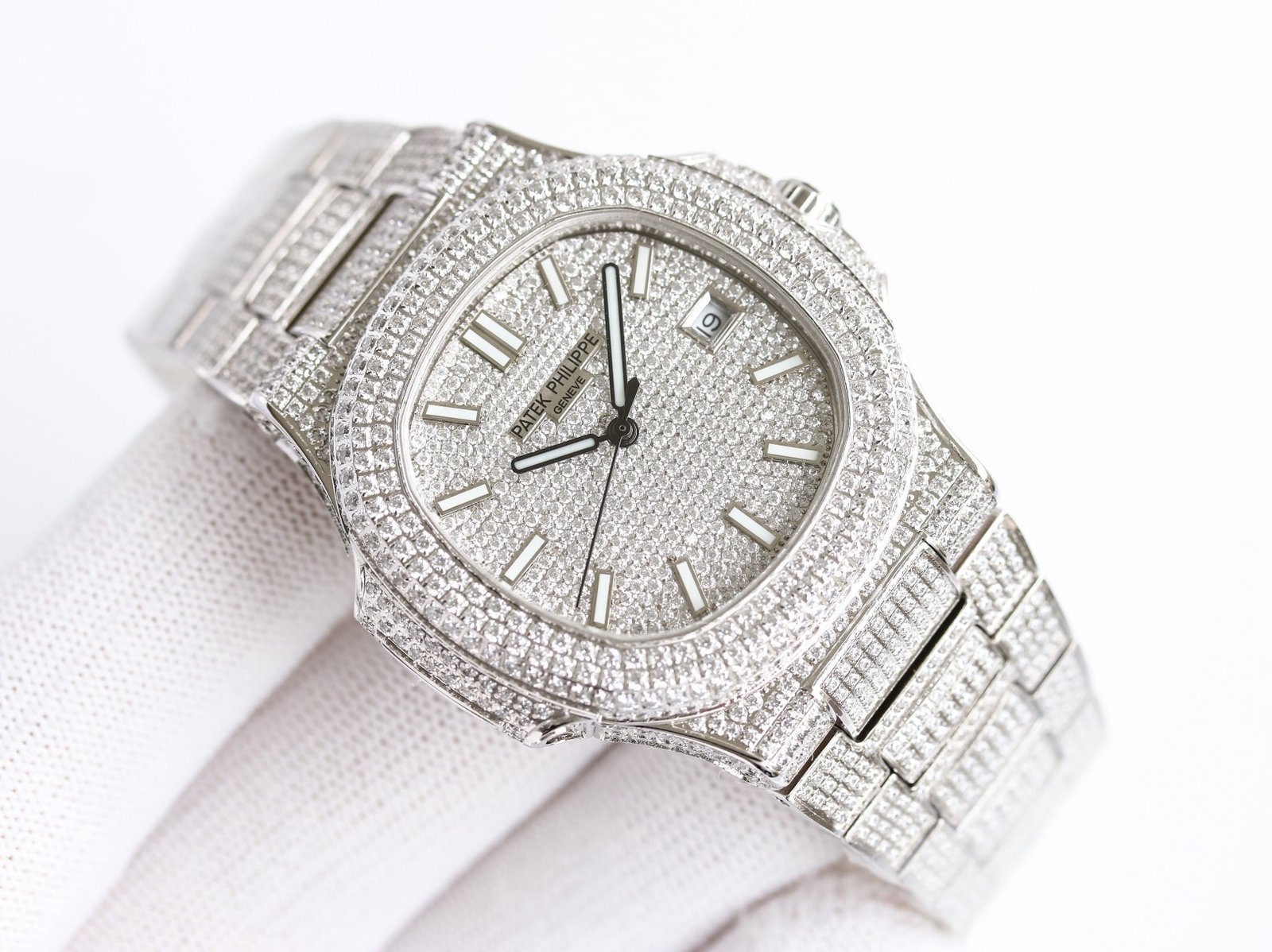 Chaque détail de cette pièce incarne le luxe : de la lunette minutieusement pavée à la signature Patek Philippe Genève gravée avec précision. Les aiguilles et index argentés assurent une lisibilité parfaite, et le mouvement automatique garantit une précision horlogère remarquable.