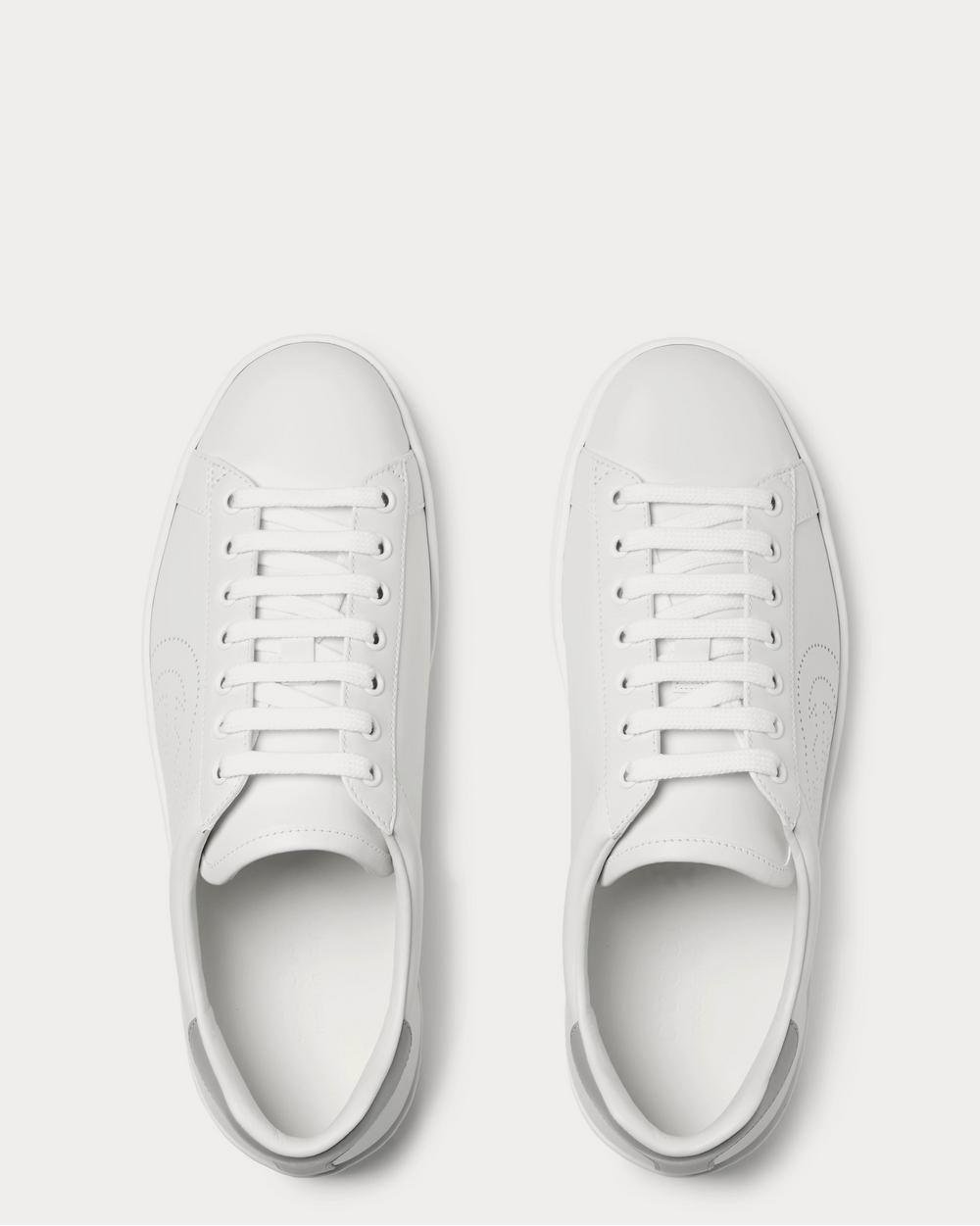 Inspirées des tennis traditionnelles, les baskets Gucci sont une version plus épurée des modèles « Ace » précédents. Confectionnées en cuir blanc lisse, elles sont dépourvues de tout logo visible, à l’exception des côtés perforés en forme de monogramme « GG » entrelacés de la maison italienne.