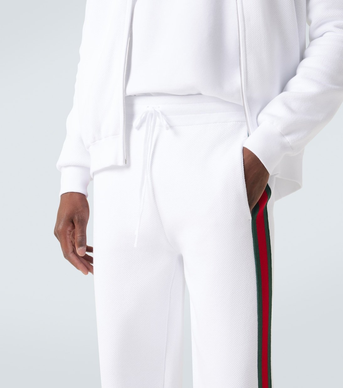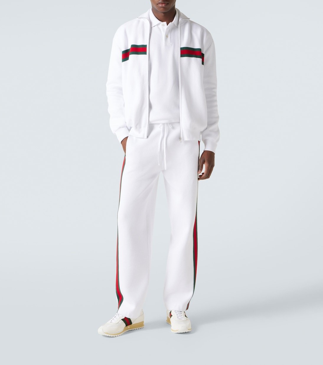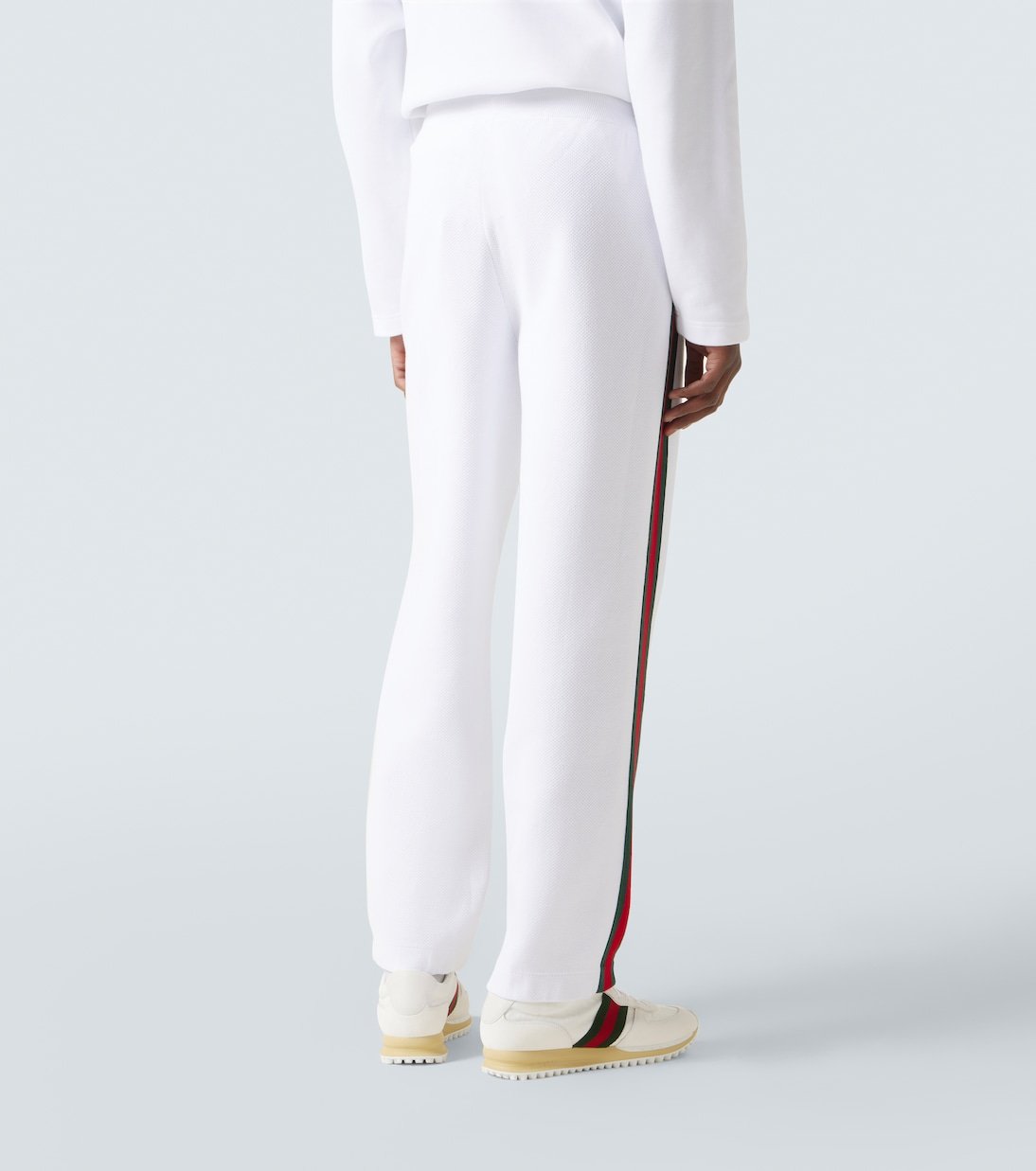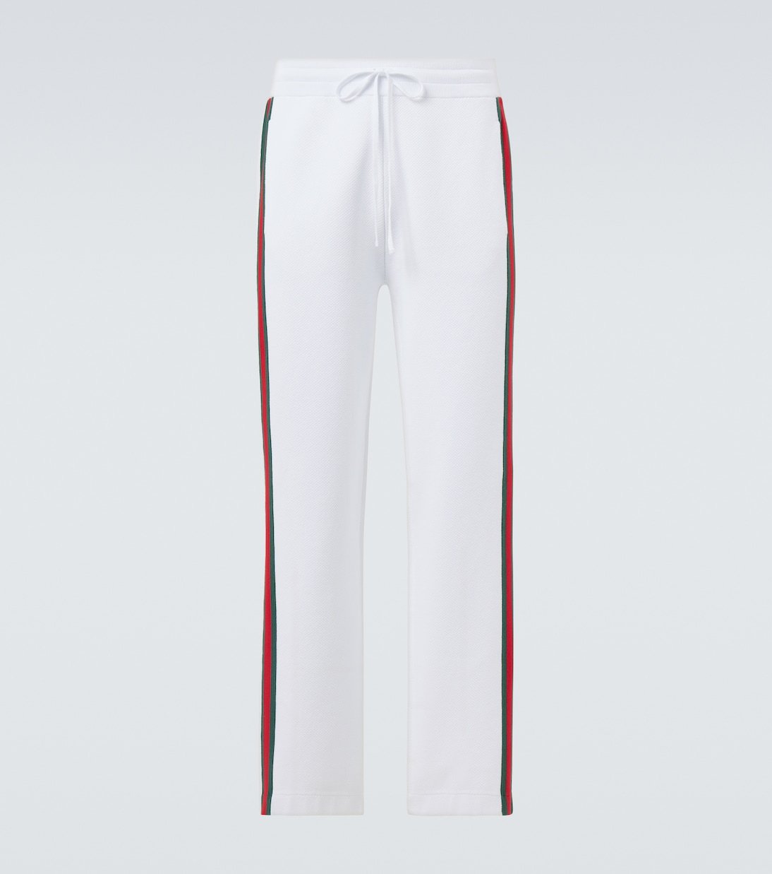 Confectionné en Italie à partir de coton mélangé, ce pantalon de Gucci présente un cordon de serrage à la taille et la bande Web signature sur les côtés. Créée en 1951, la bande verte et rouge Web s’inspire des sangles de selle équestre.
