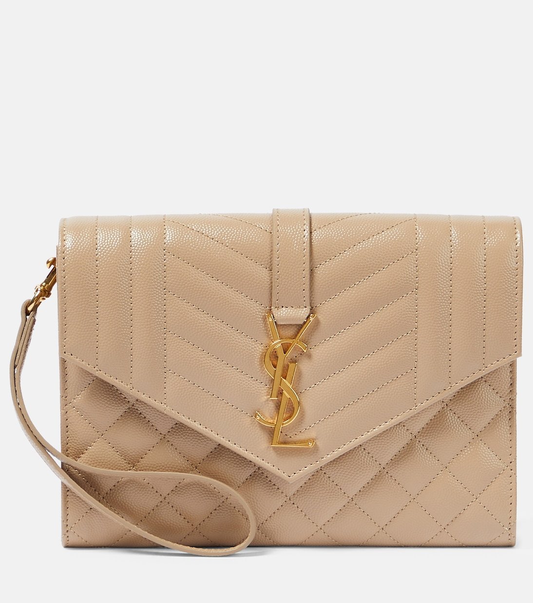 Abordez votre quotidien avec style en tenant ce portefeuille Envelope beige foncé de Saint Laurent. Réalisé en cuir avec un matelassage à chevrons, il est orné du lettrage YSL signature en métal doré pour une reconnaissance instantanée, et dispose d’une dragonne.